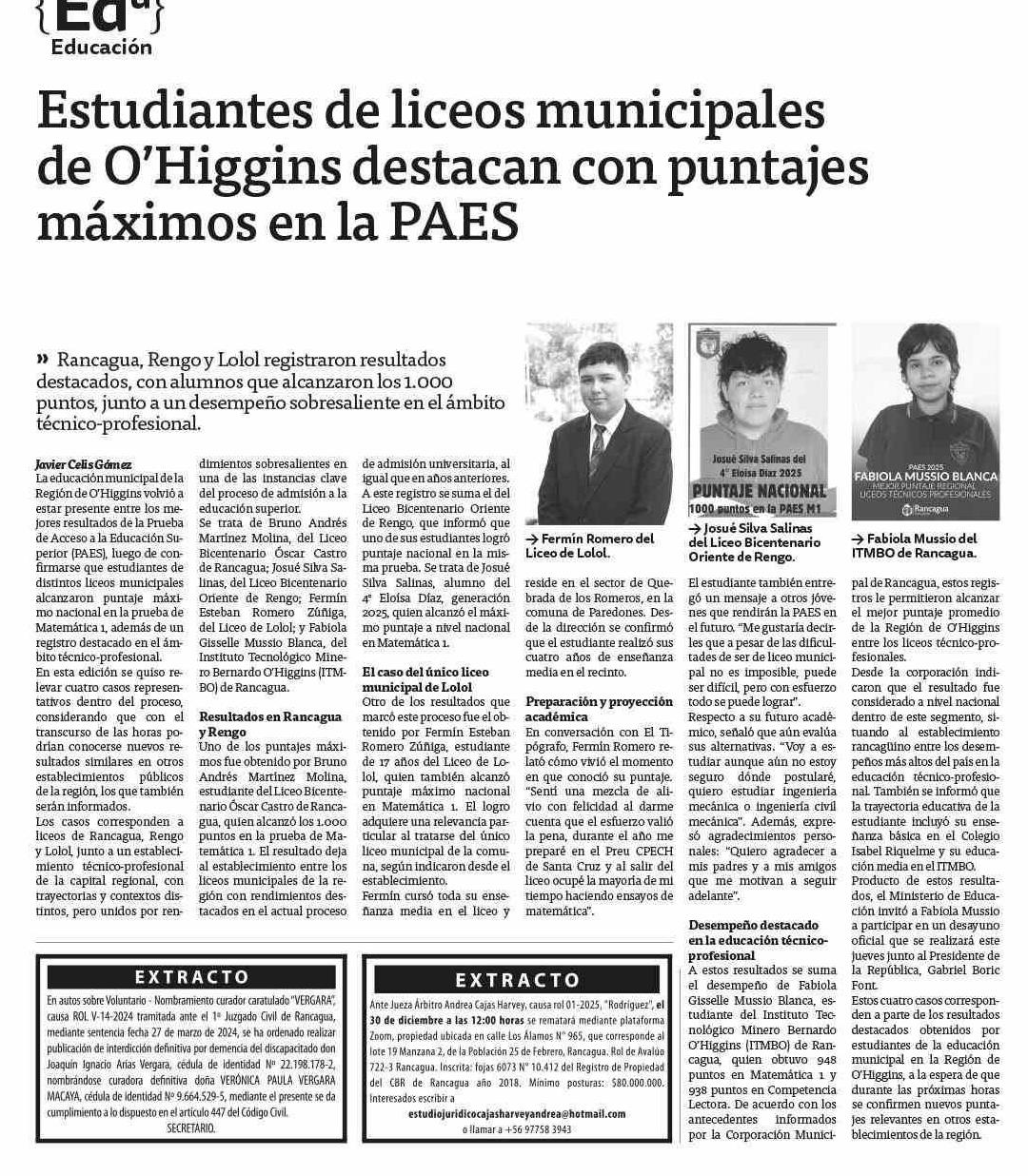 Estudiantes de liceos municipales de O'Higgins destacan con puntajes máximos en la PAES 06-01-2026 El Tipógrafo |