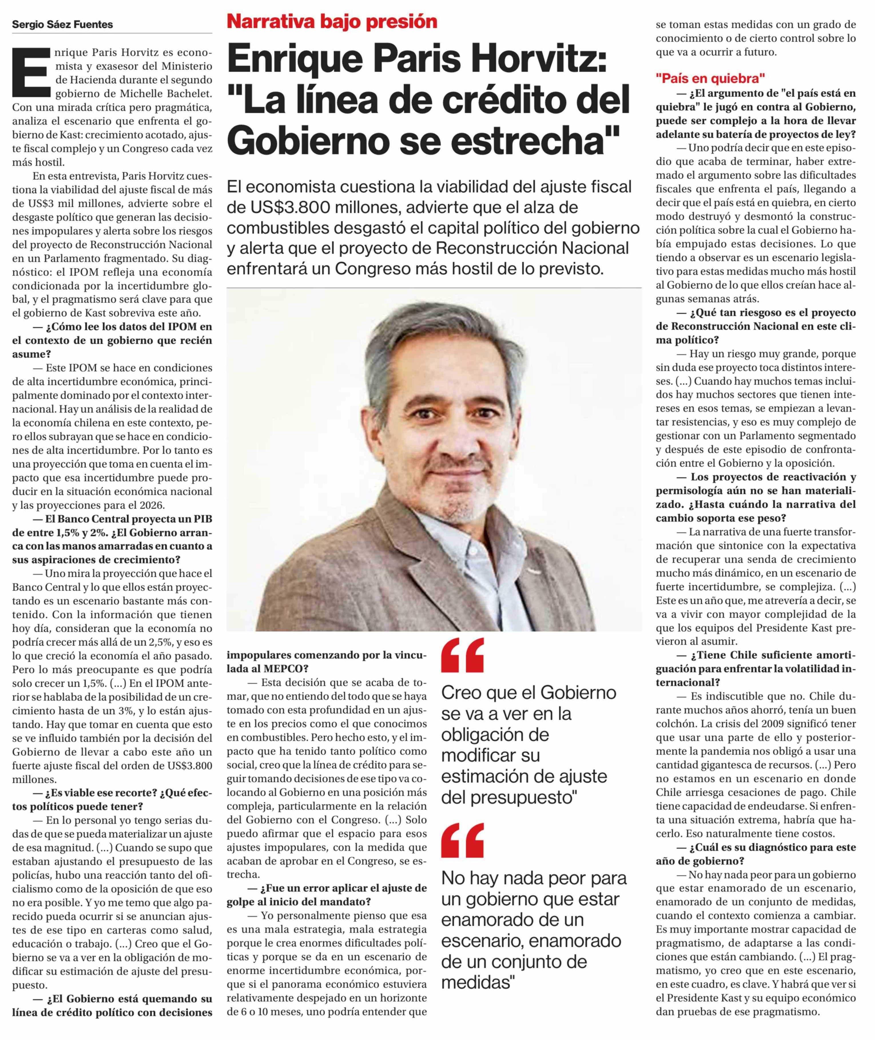 Enrique Paris Horvitz: "La línea de crédito del Gobierno se estrecha" 30-03-2026 La Segunda |