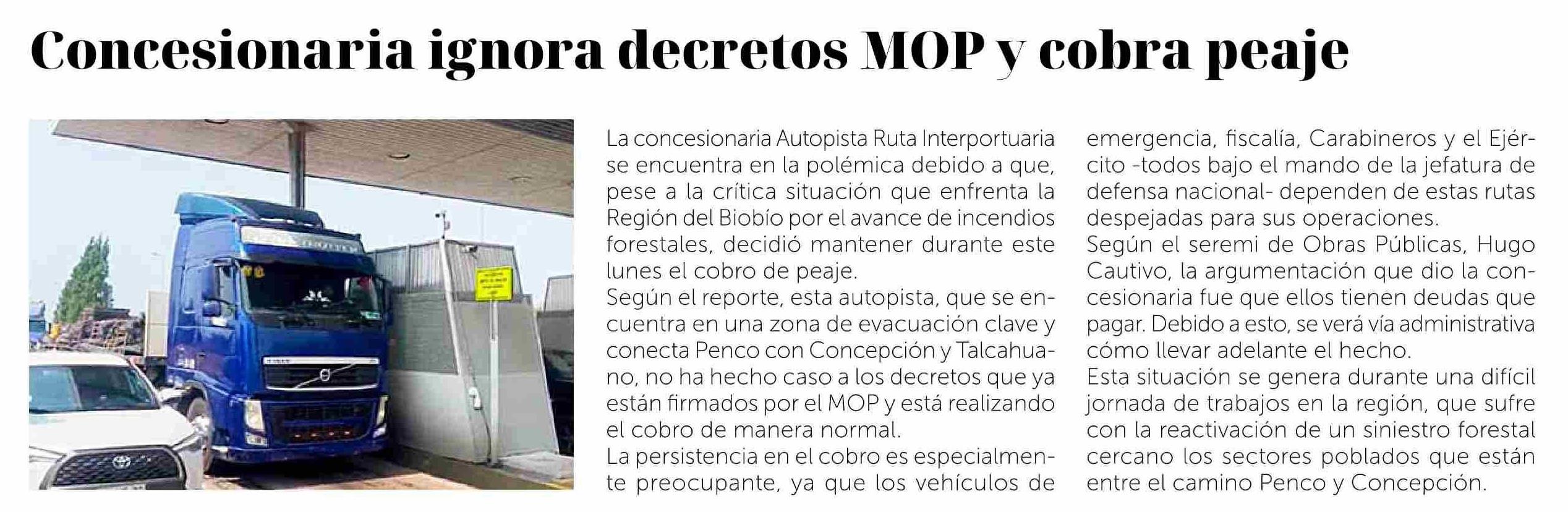 | Título: | Concesionaria ignora decretos MOP y cobra peaje |