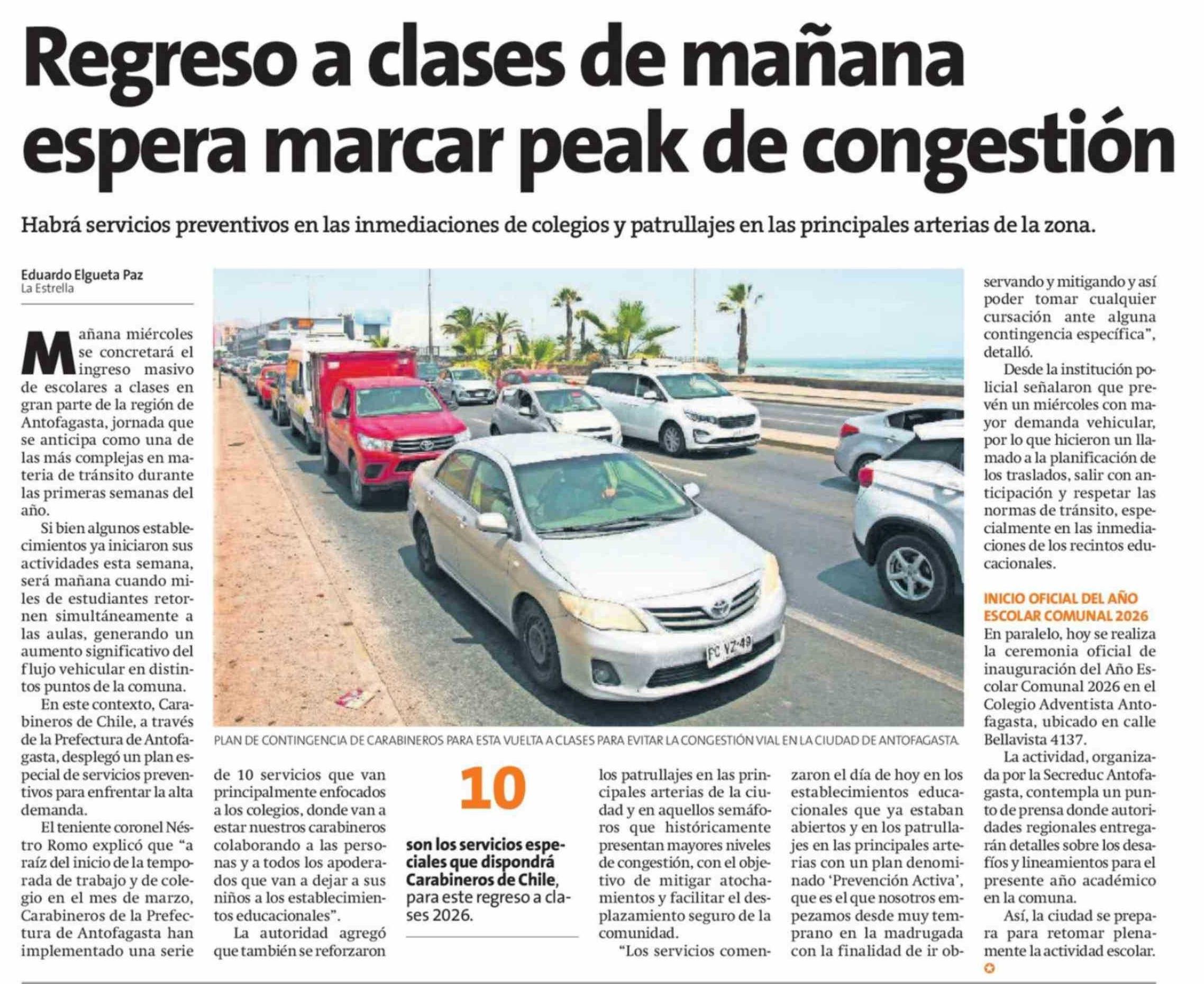 Regreso a clases de mañana espera marcar peak de congestión 03-03-2026 La Estrella de Antofagasta |