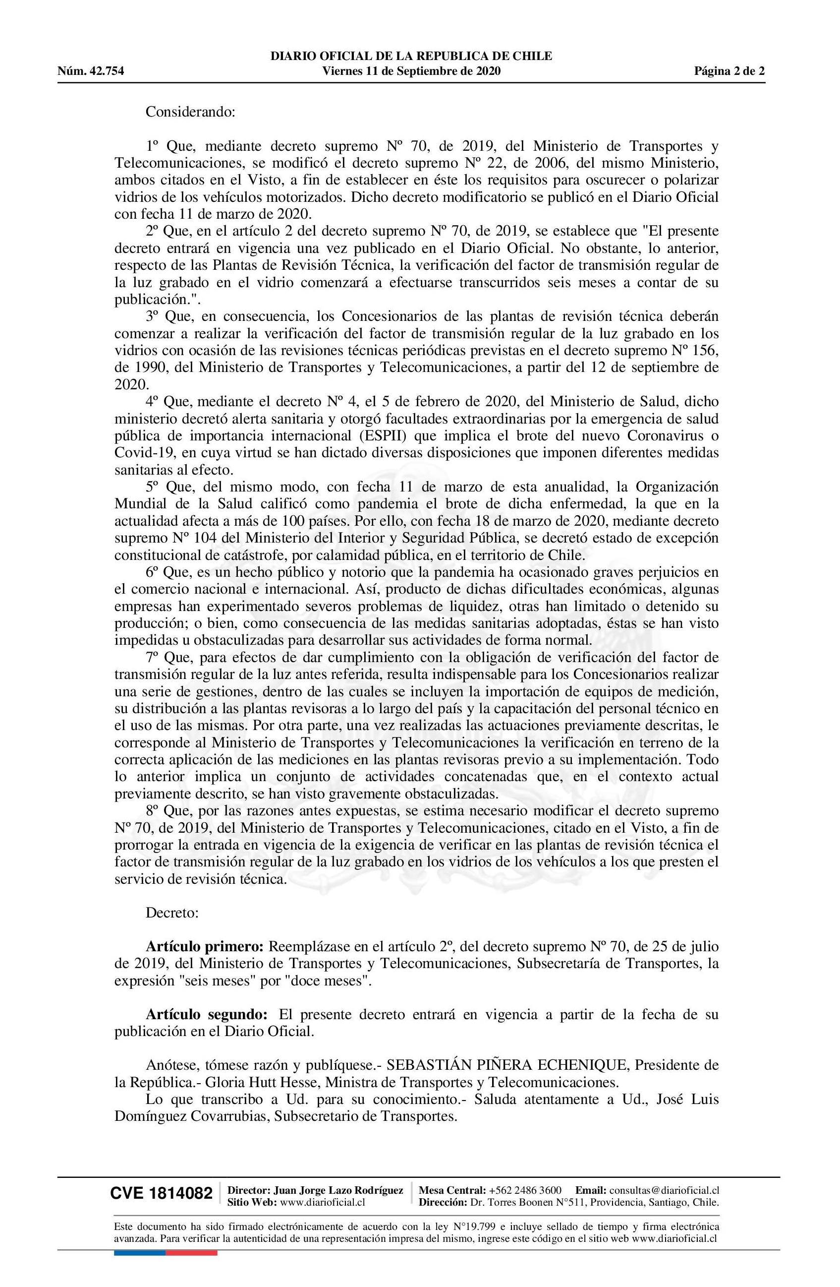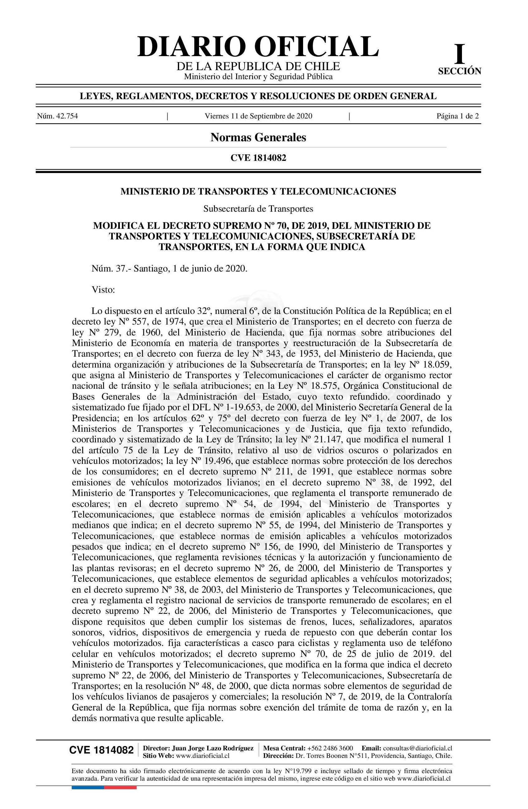 Título: Ministerio de Transportes Y Telecomunicaciones Modifica El Decreto Supremo Nº 70, de 2019, Del Ministerio de Transportes Y Telecomunicaciones, Subsecretaría de Transportes, En la Forma Que Indica
