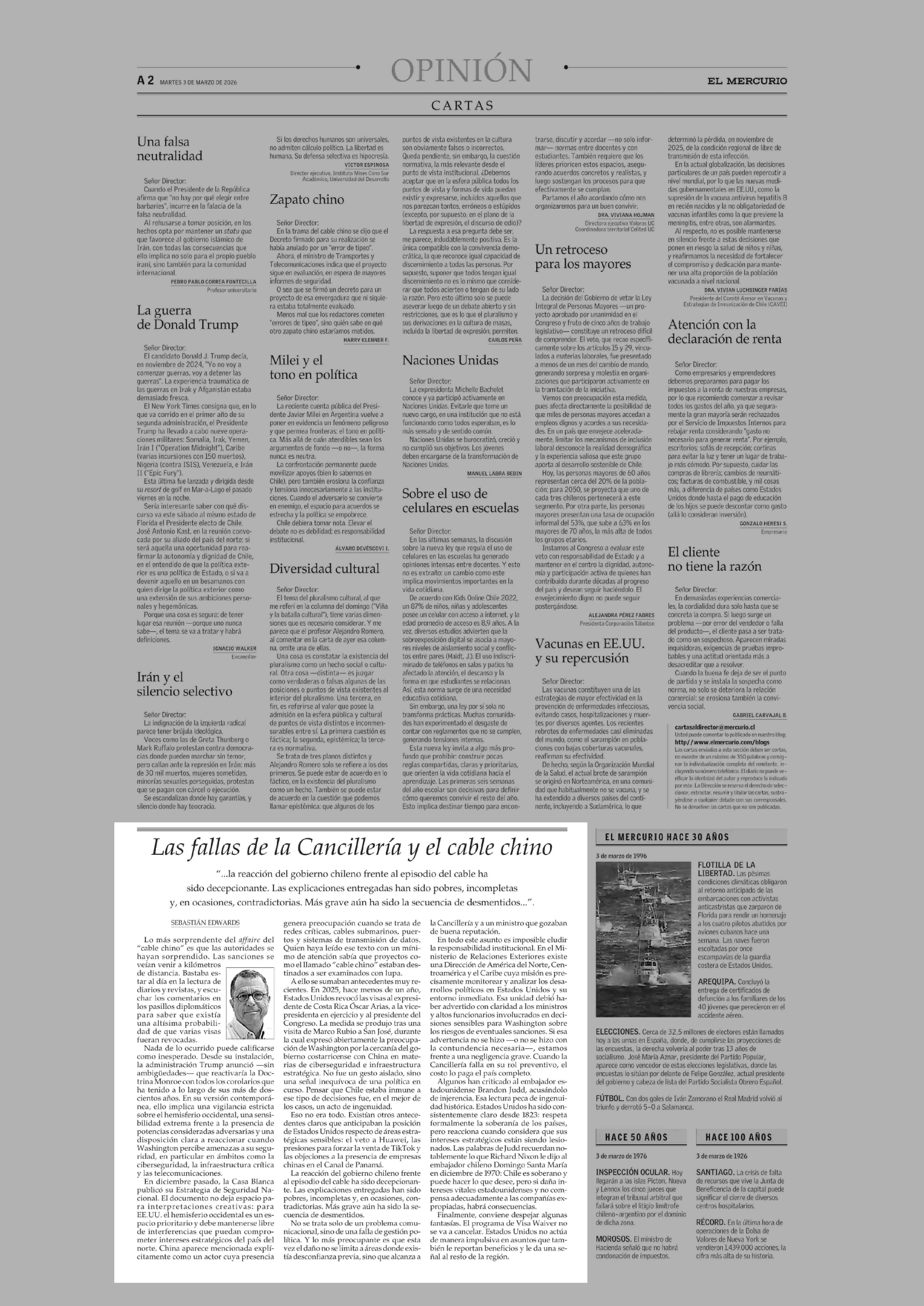 COLUMNAS DE OPINIÓN: Las fallas de la Cancillería y el cable chino 03-03-2026 El Mercurio |