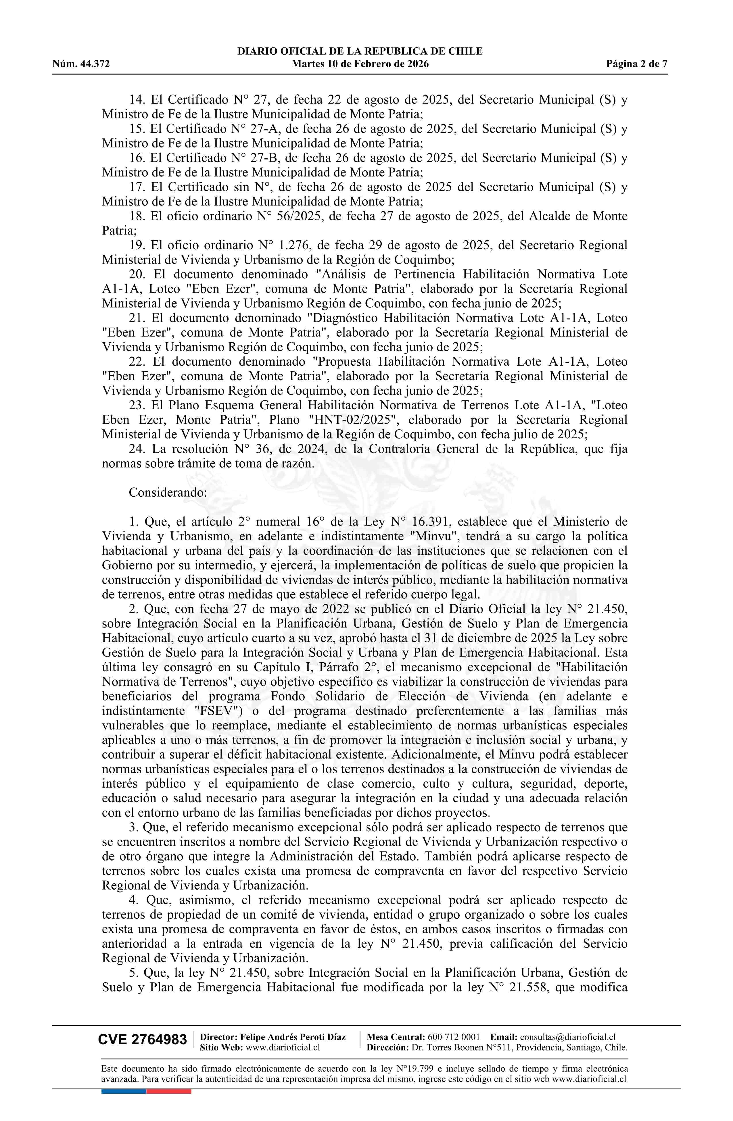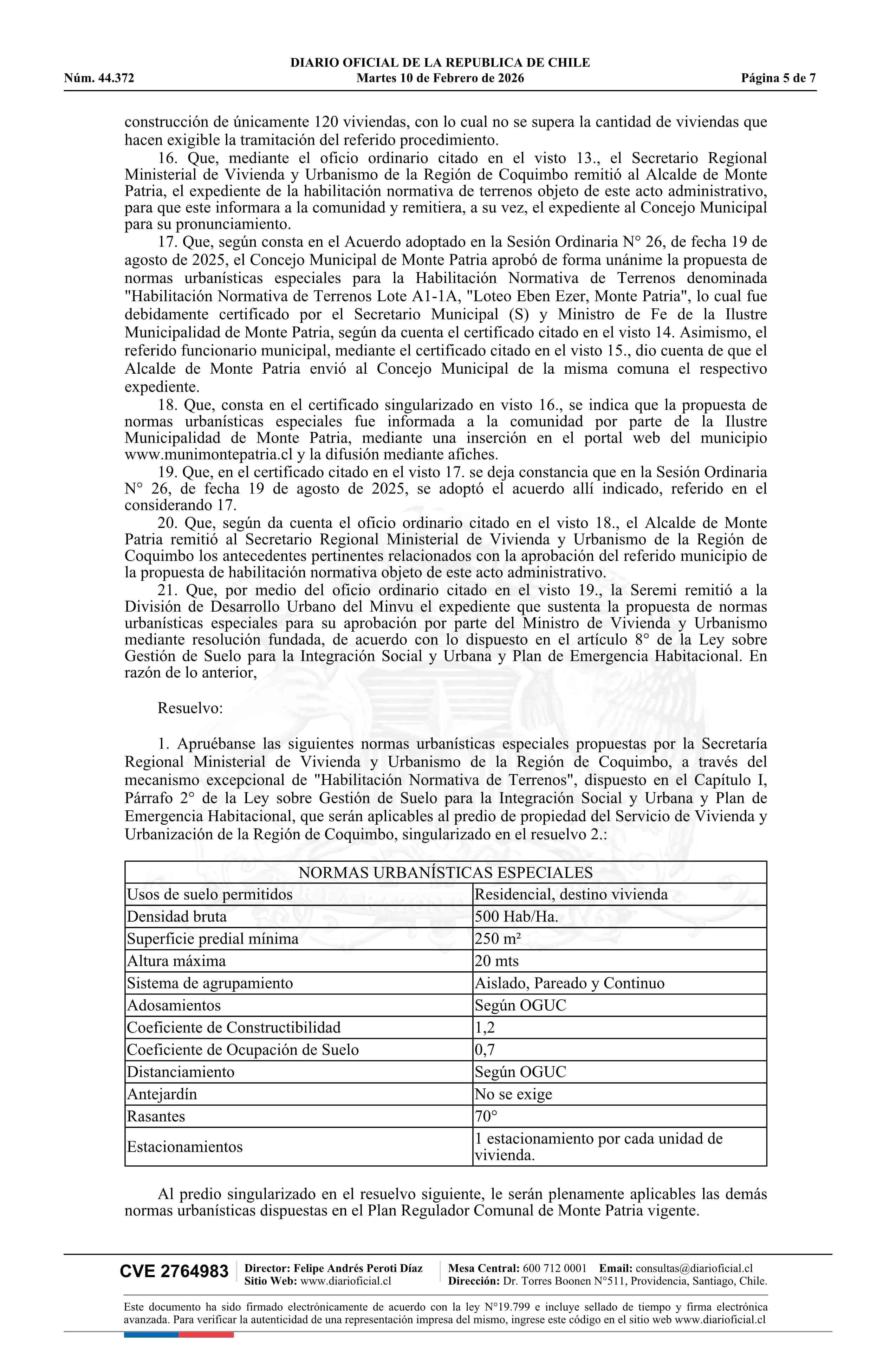 | Título: | Resolución número 27, de 2025.- Aprueba normas urbanísticas especiales aplicables al terreno ubicado en calle Río Ponio N° 1.327, comuna de Monte Patria, Región de Coquimbo, en el marco del artículo cuarto de la ley N° 21.450, que aprueba la Ley sobre Gestión de Suelo para la Integración Social y Ur |