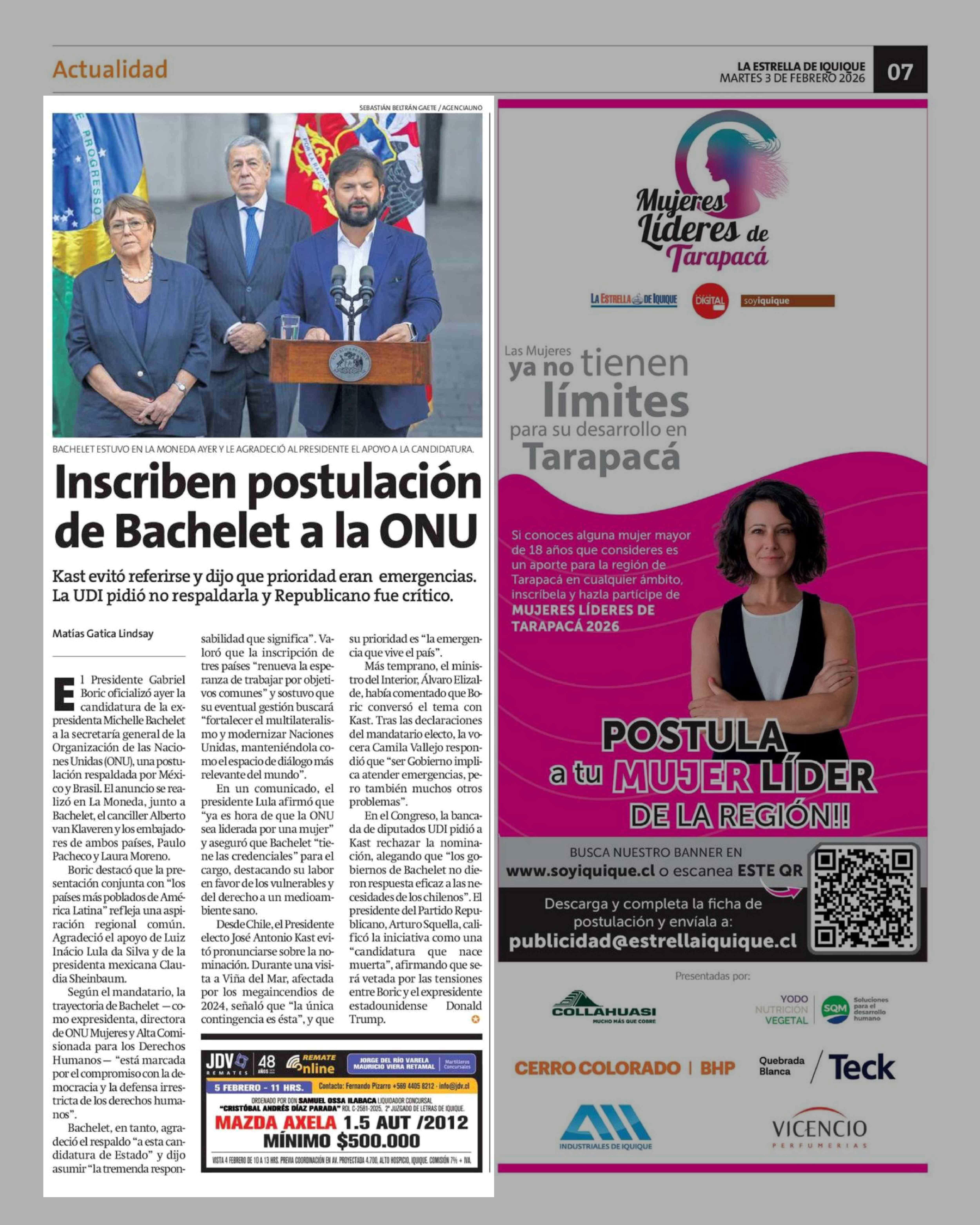Inscriben postulación de Bachelet a la ONU 03-02-2026 La Estrella de Iquique |