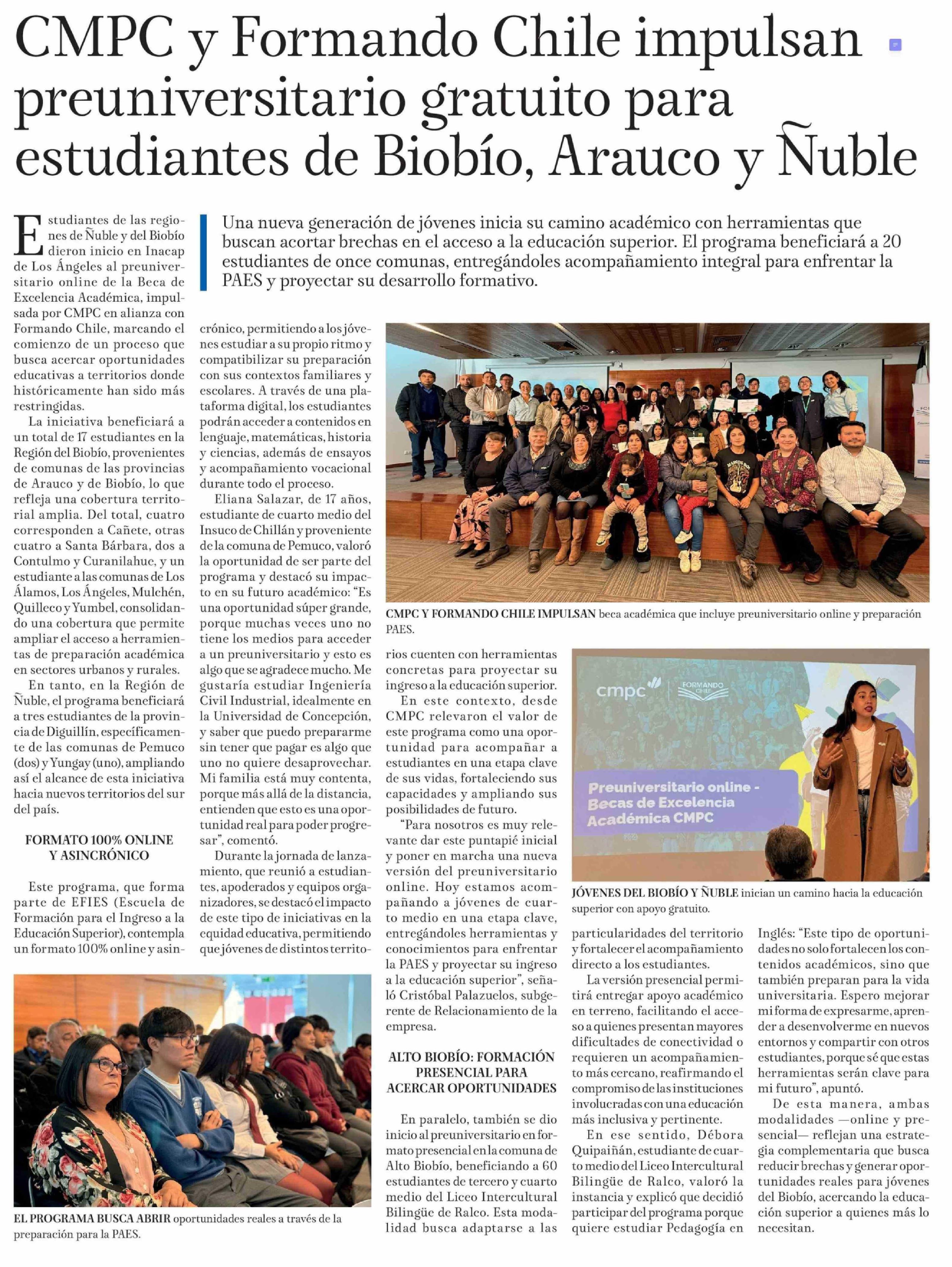 Título: CMPC y Formando Chile impulsan preuniversitario gratuito para estudiantes de Biobío, Arauco y Nuble