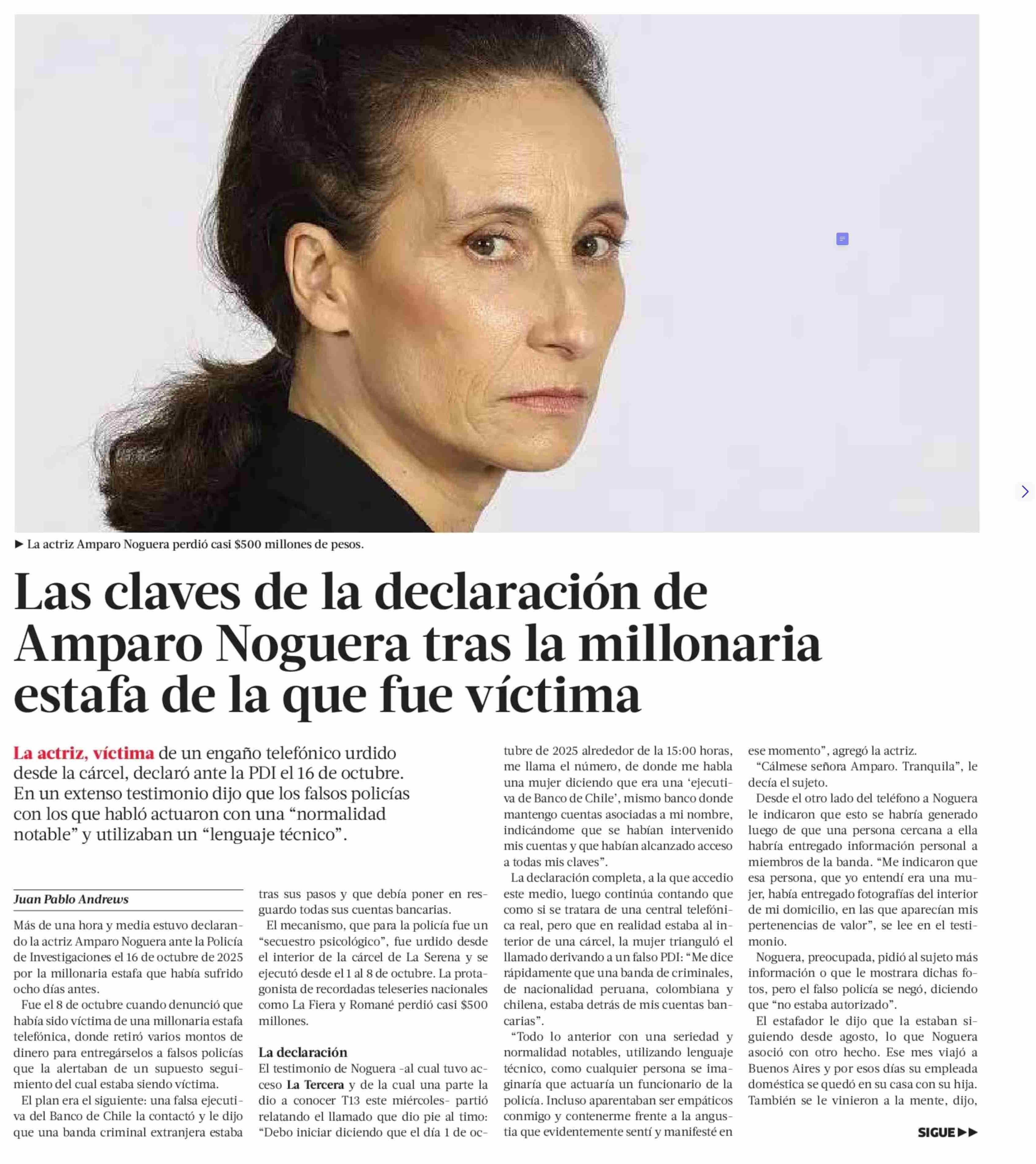 Las claves de la declaración de Amparo Noguera tras la millonaria estafa de la que fue víctima 16-01-2026 La Tercera |