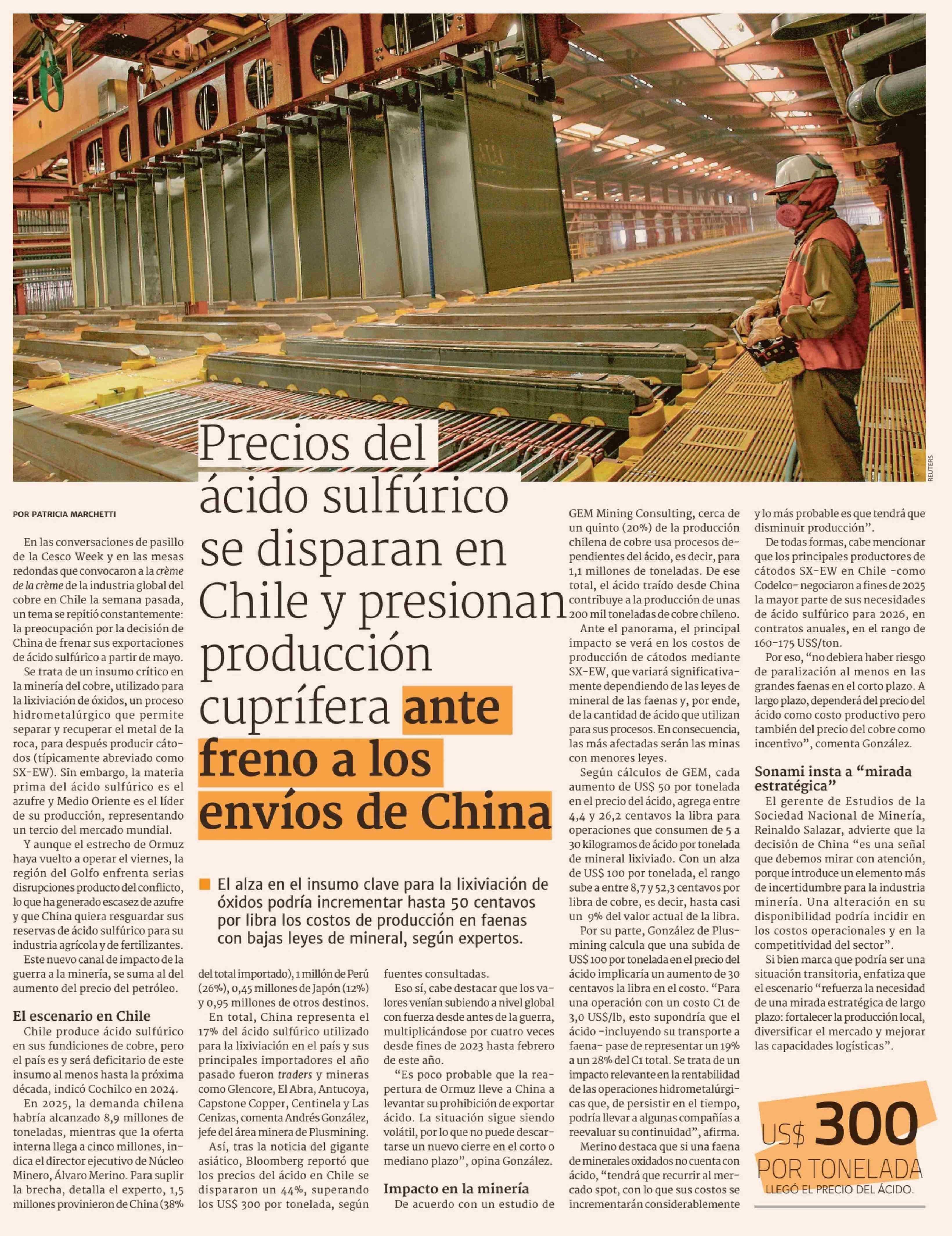 Precios del ácido sulfúrico se disparan en Chile y presionan producción cuprífera ante freno a los envíos de China 20-04-2026 Diario Financiero |