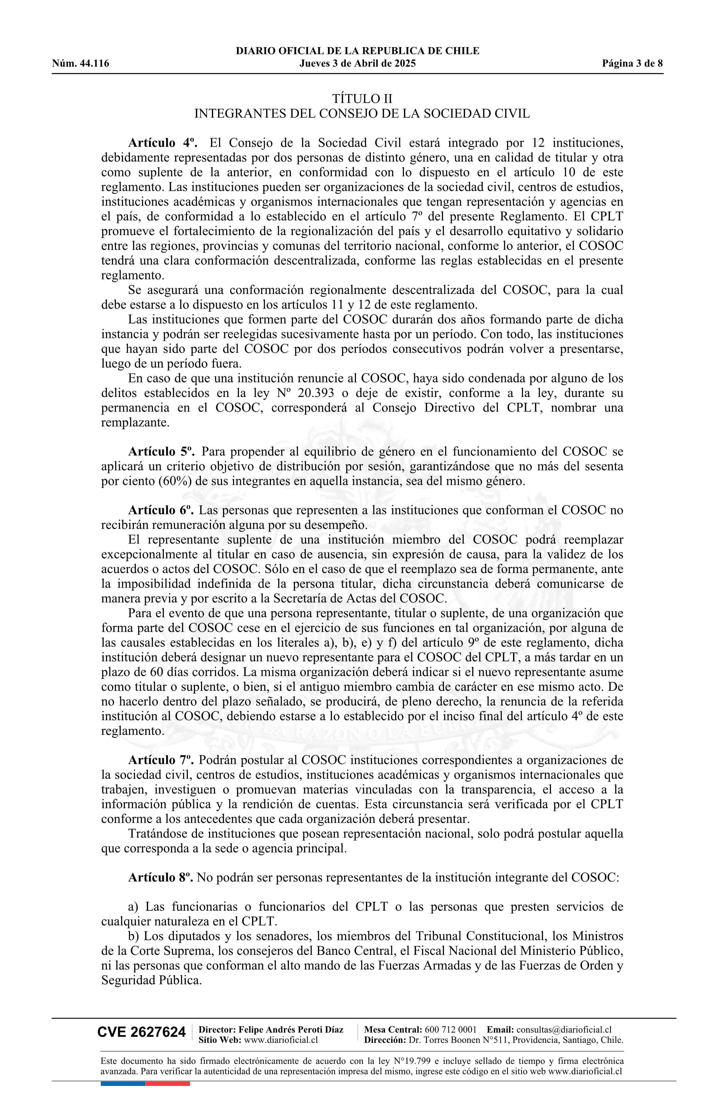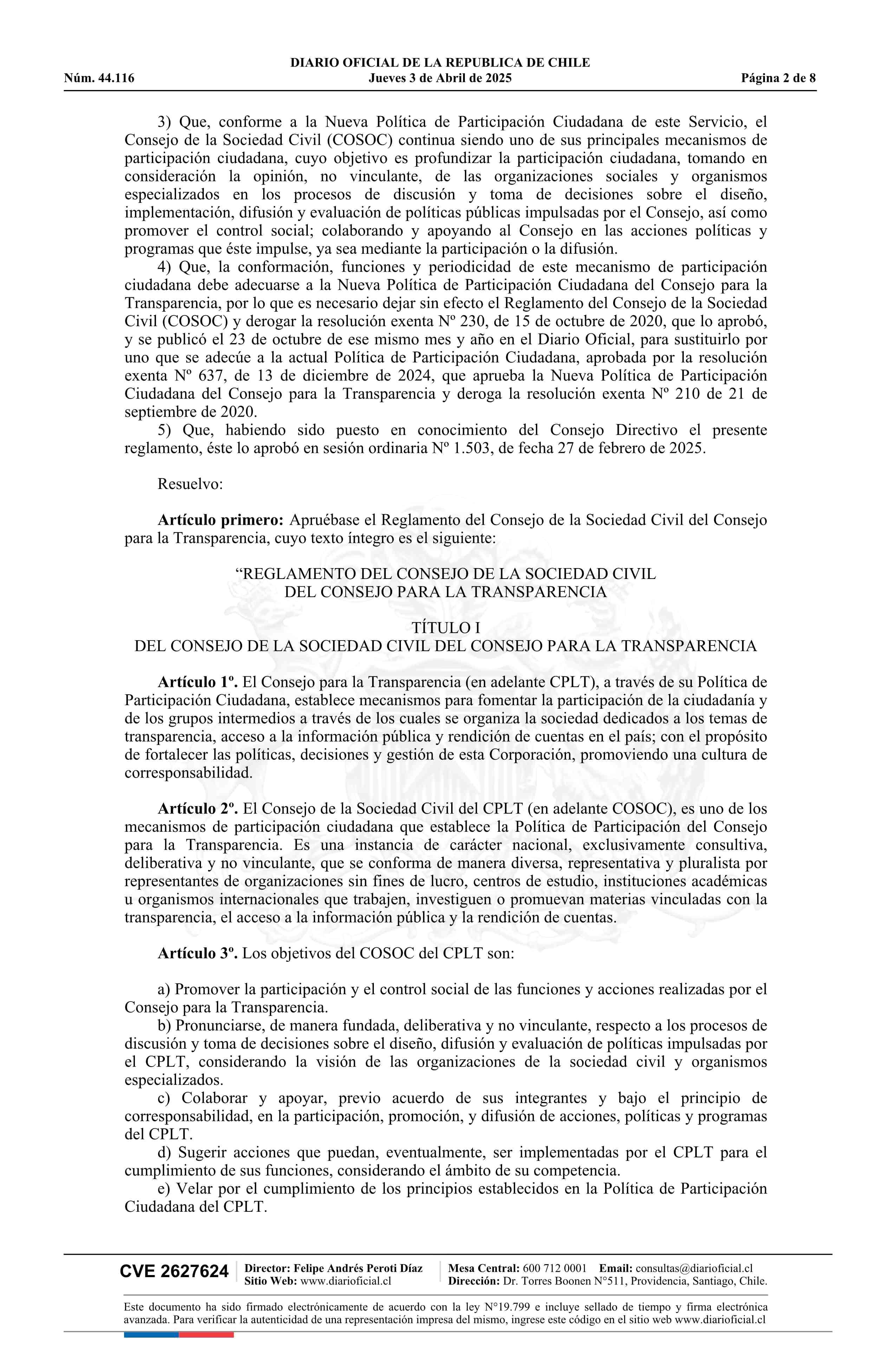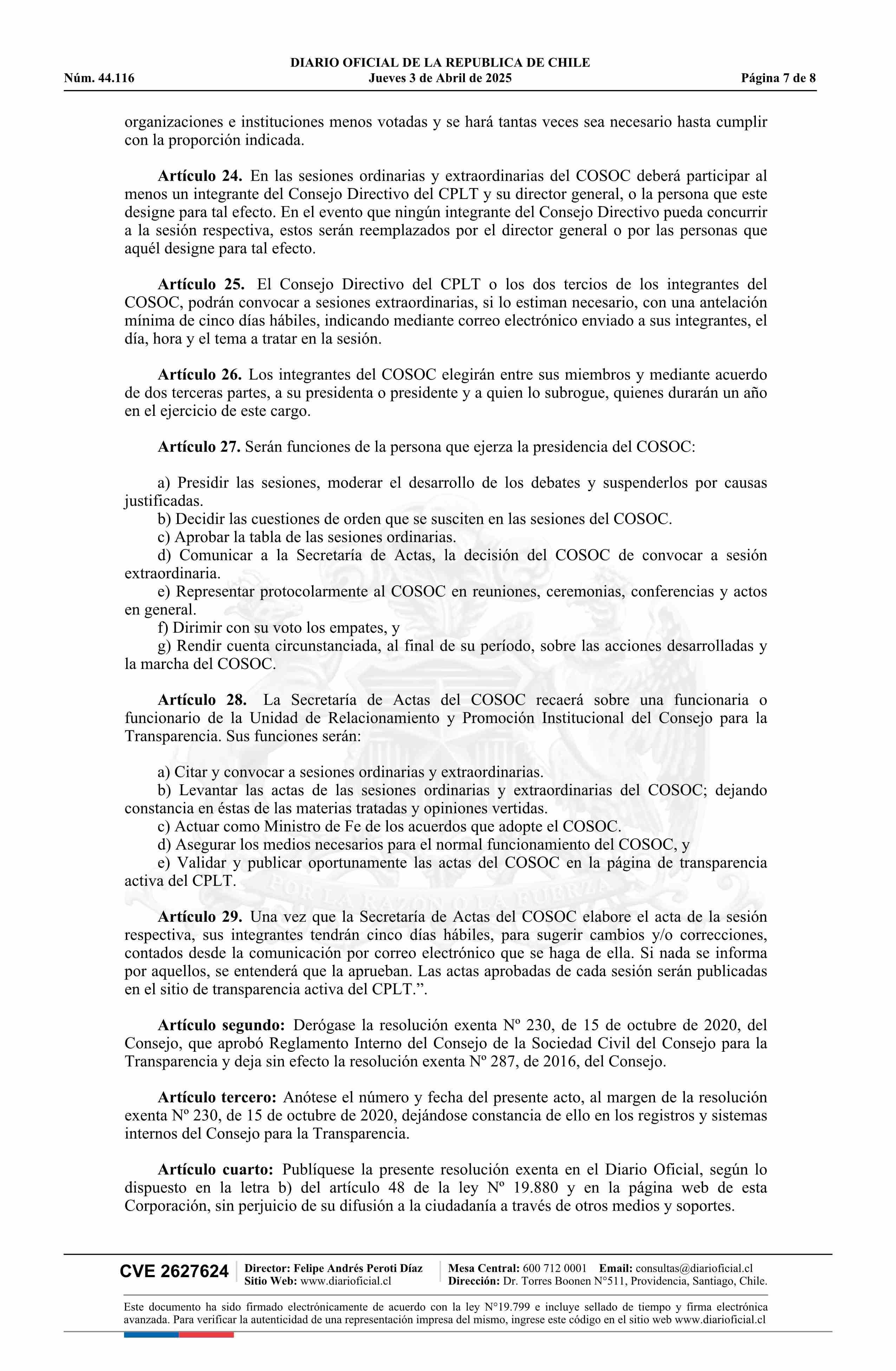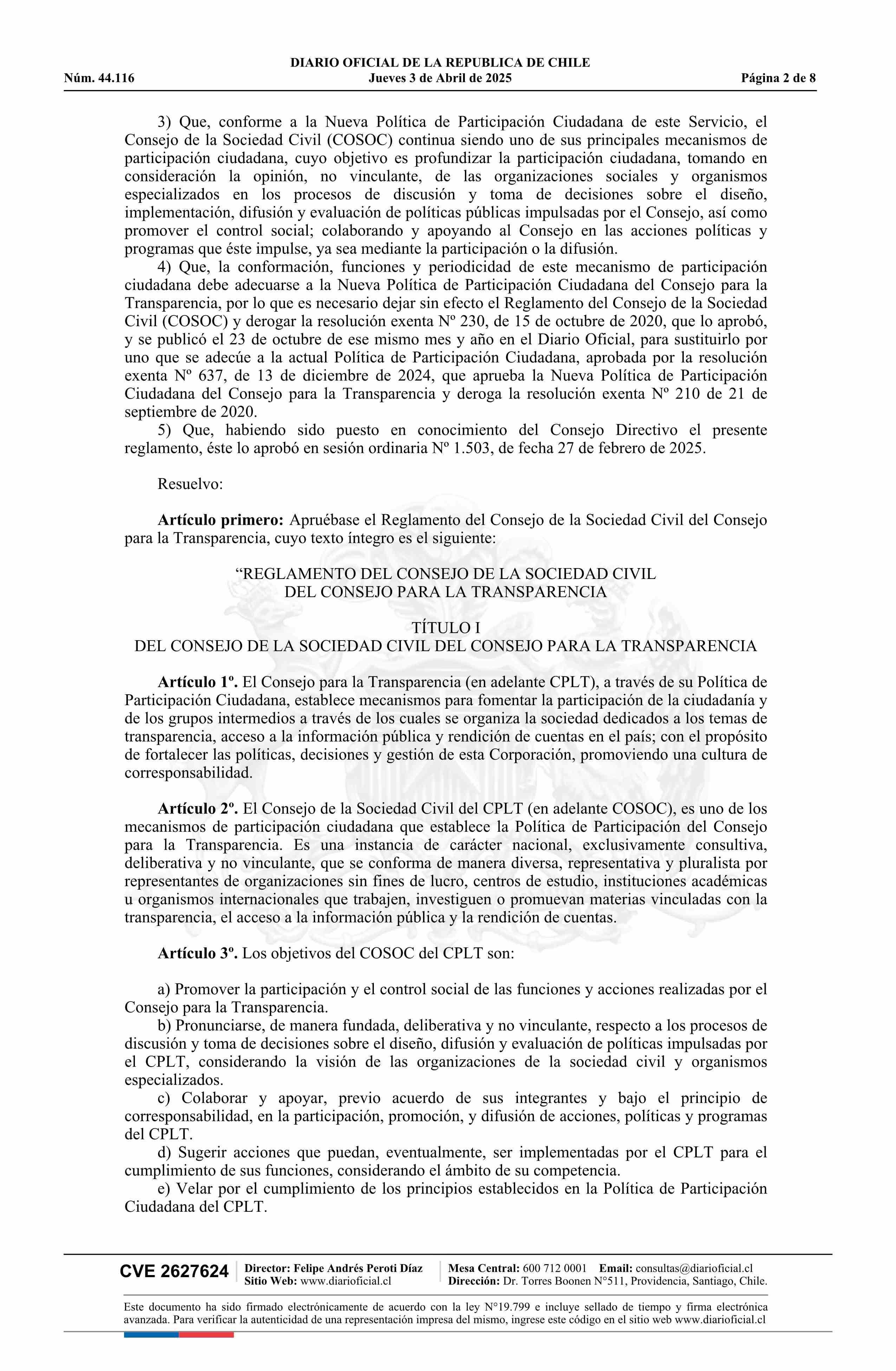 Resolución exenta número E298, de 2025.- Aprueba el Reglamento del Consejo de la Sociedad Civil del Consejo para la Transparencia y deroga resolución Nº 230 exenta, de 2020 03-04-2025 DIARIO OFICIAL CHILE - BOLETÍN OFICIAL DE MINERÍA |