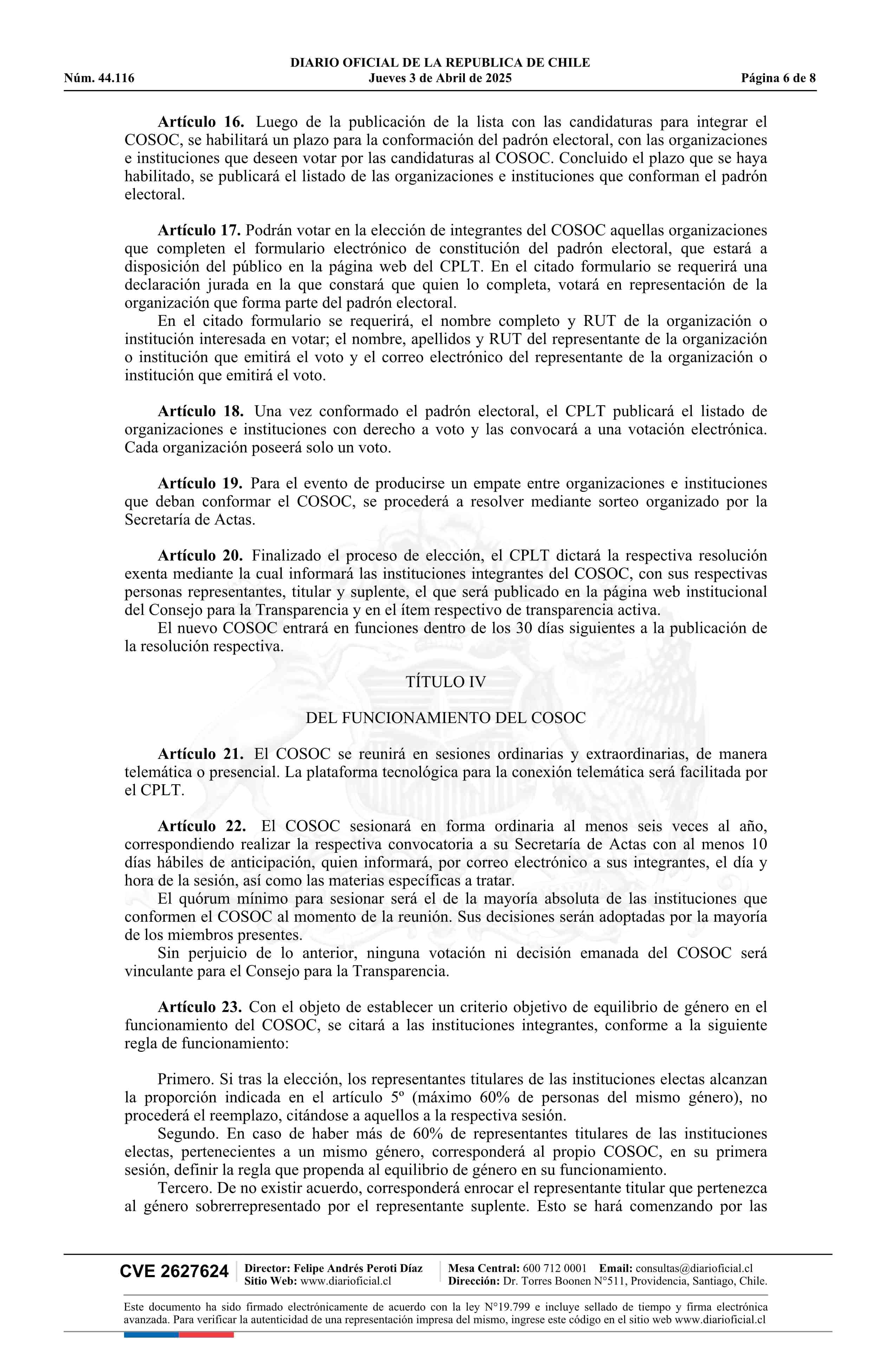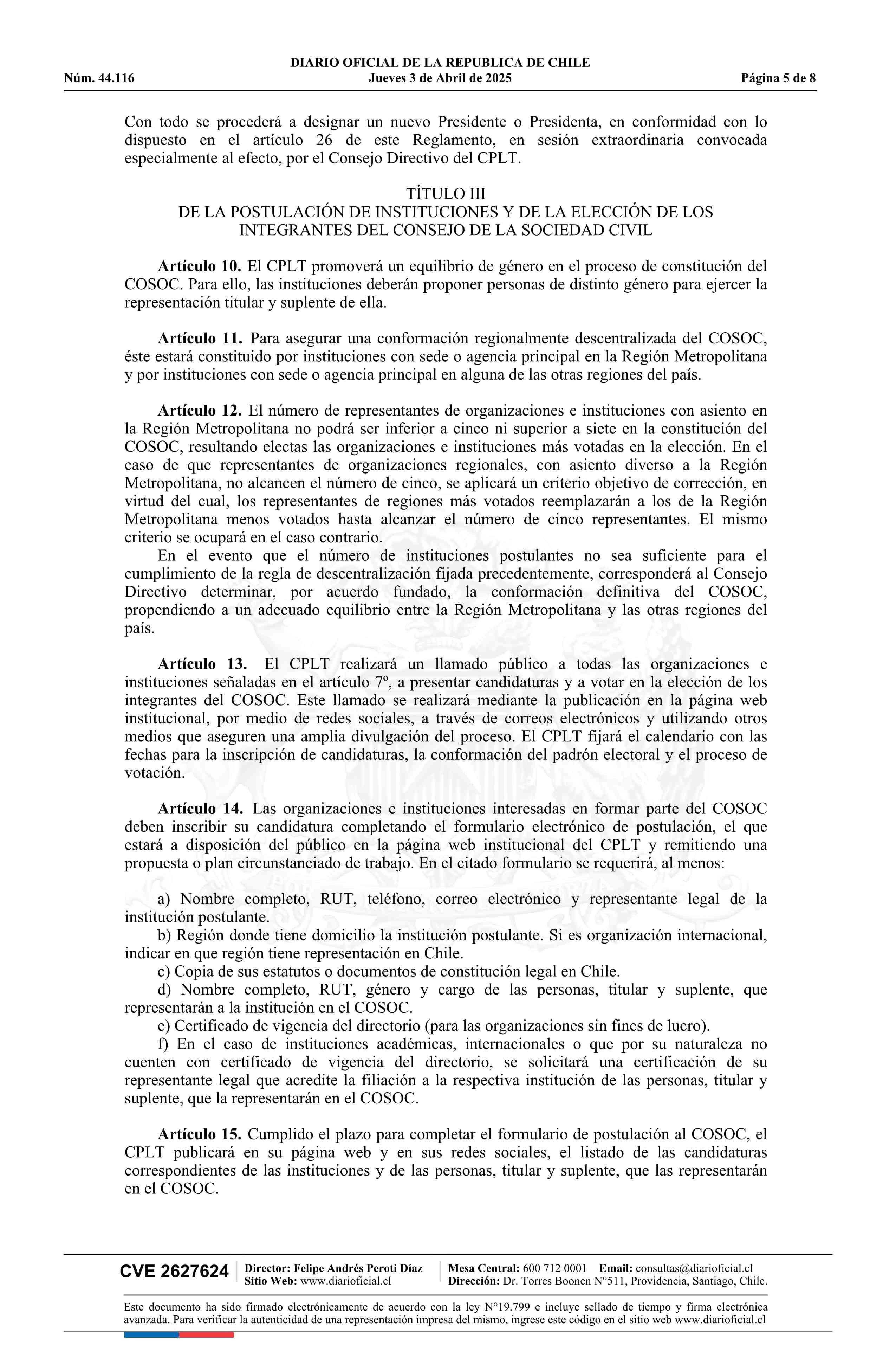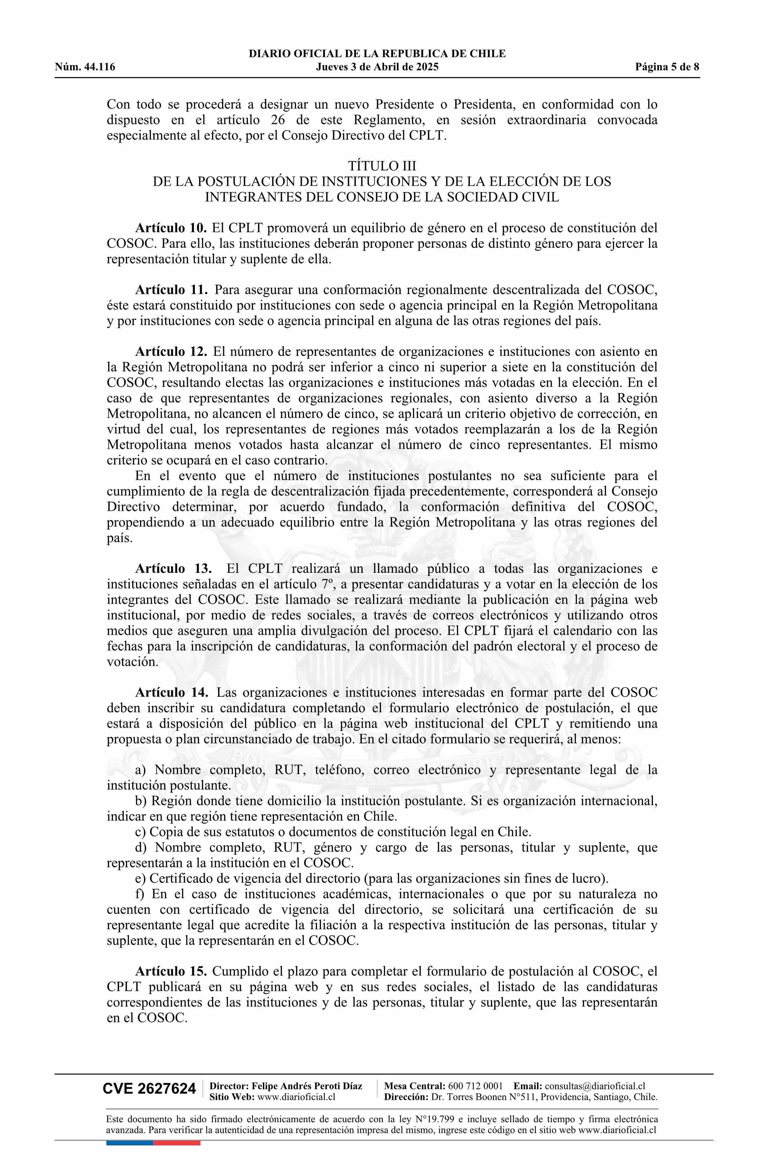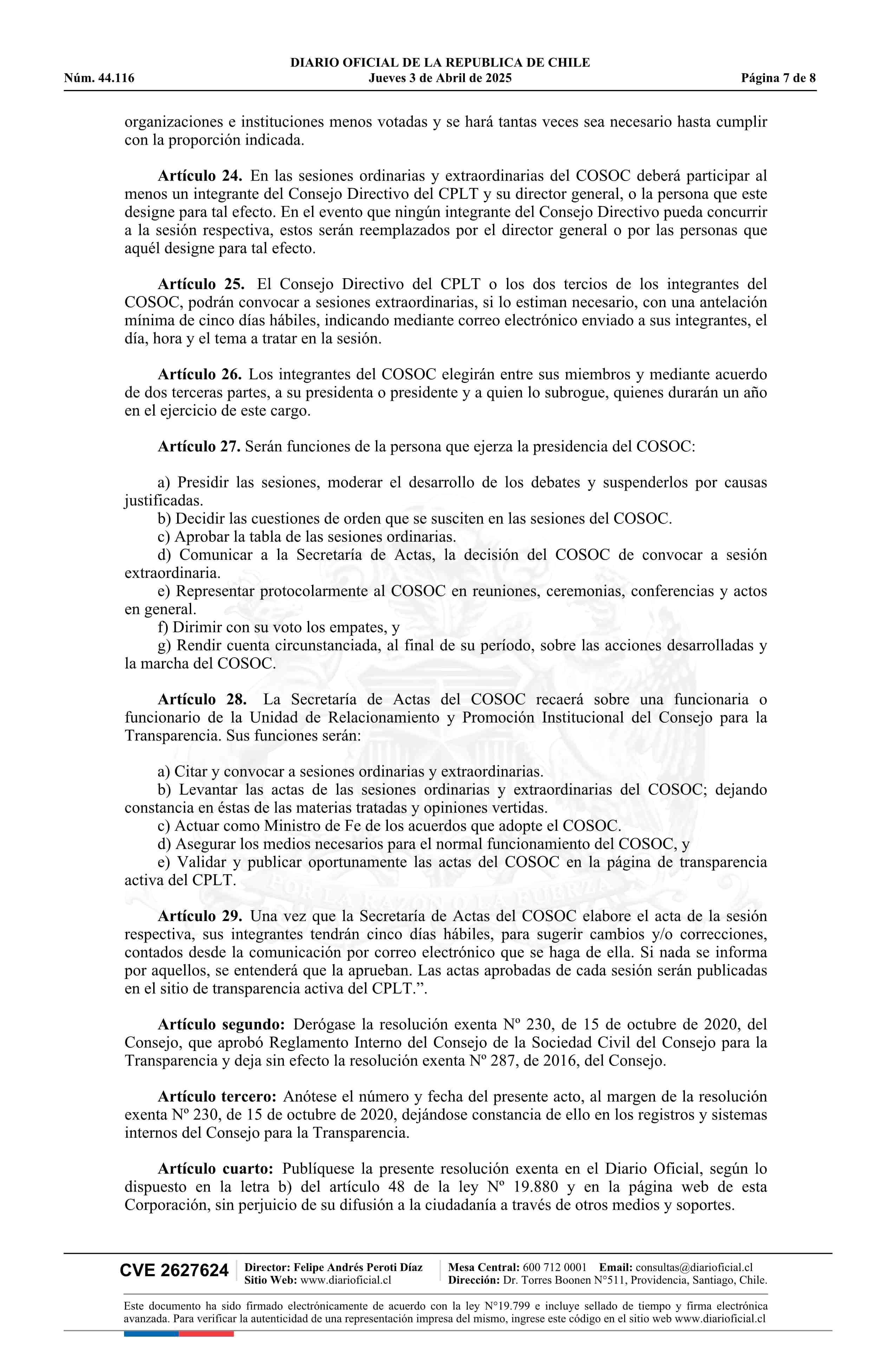 Resolución exenta número E298, de 2025.- Aprueba el Reglamento del Consejo de la Sociedad Civil del Consejo para la Transparencia y deroga resolución Nº 230 exenta, de 2020 03-04-2025 DIARIO OFICIAL CHILE - BOLETÍN OFICIAL DE MINERÍA |