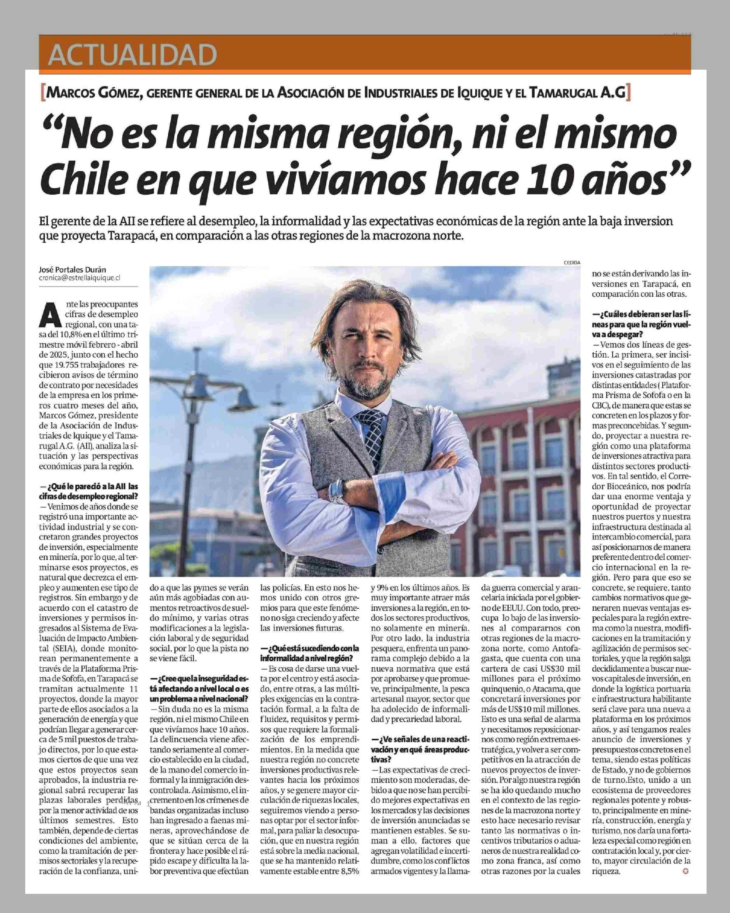 "No es la misma región, ni el mismo Chile en que vivíamos hace 10 años" 22-06-2025 La Estrella de Iquique |