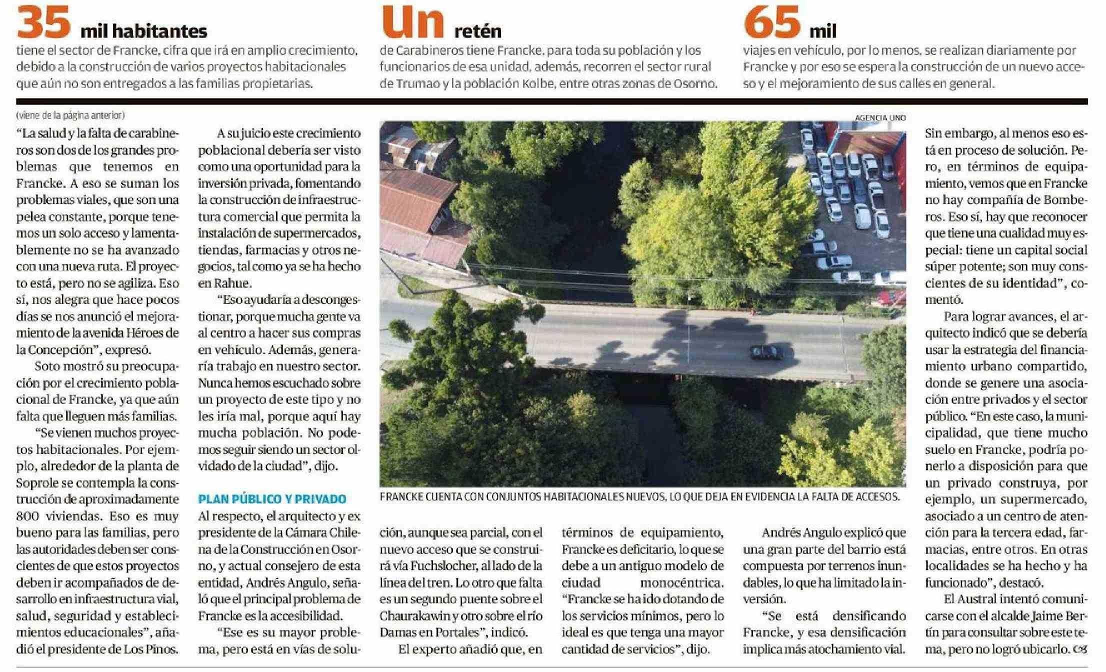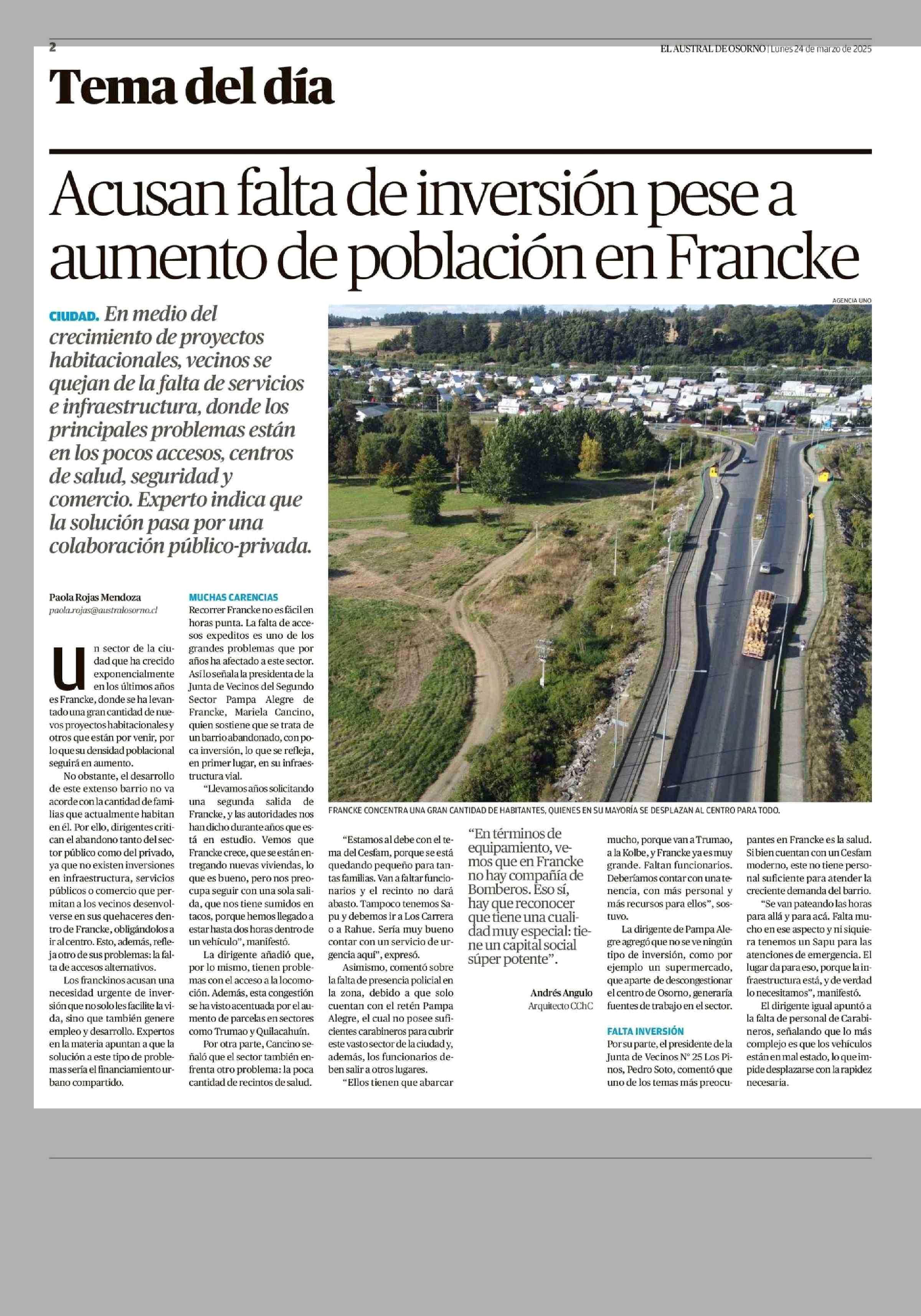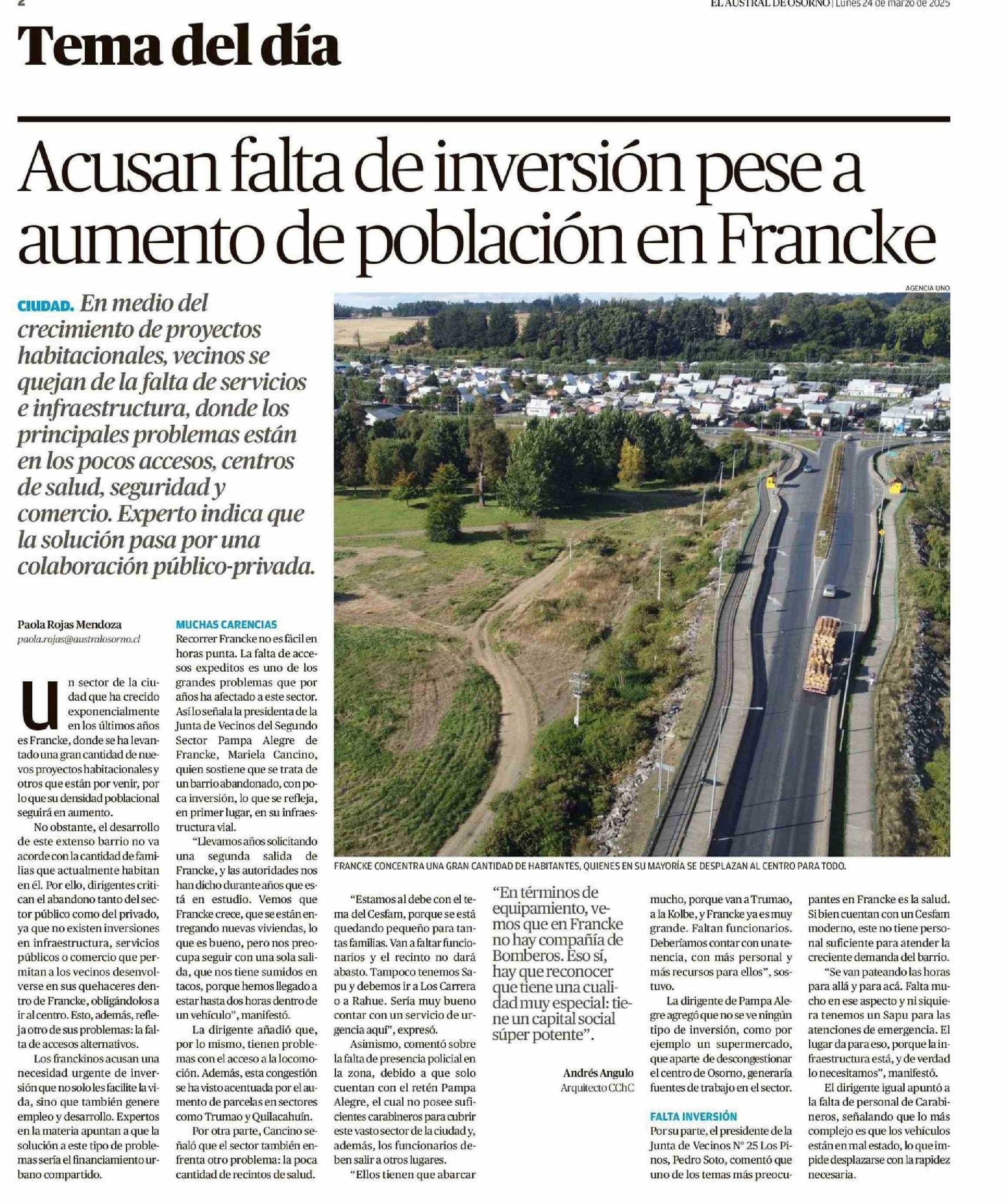 Acusan falta de inversión pese a aumento de población en Francke 24-03-2025 El Austral de Osorno |