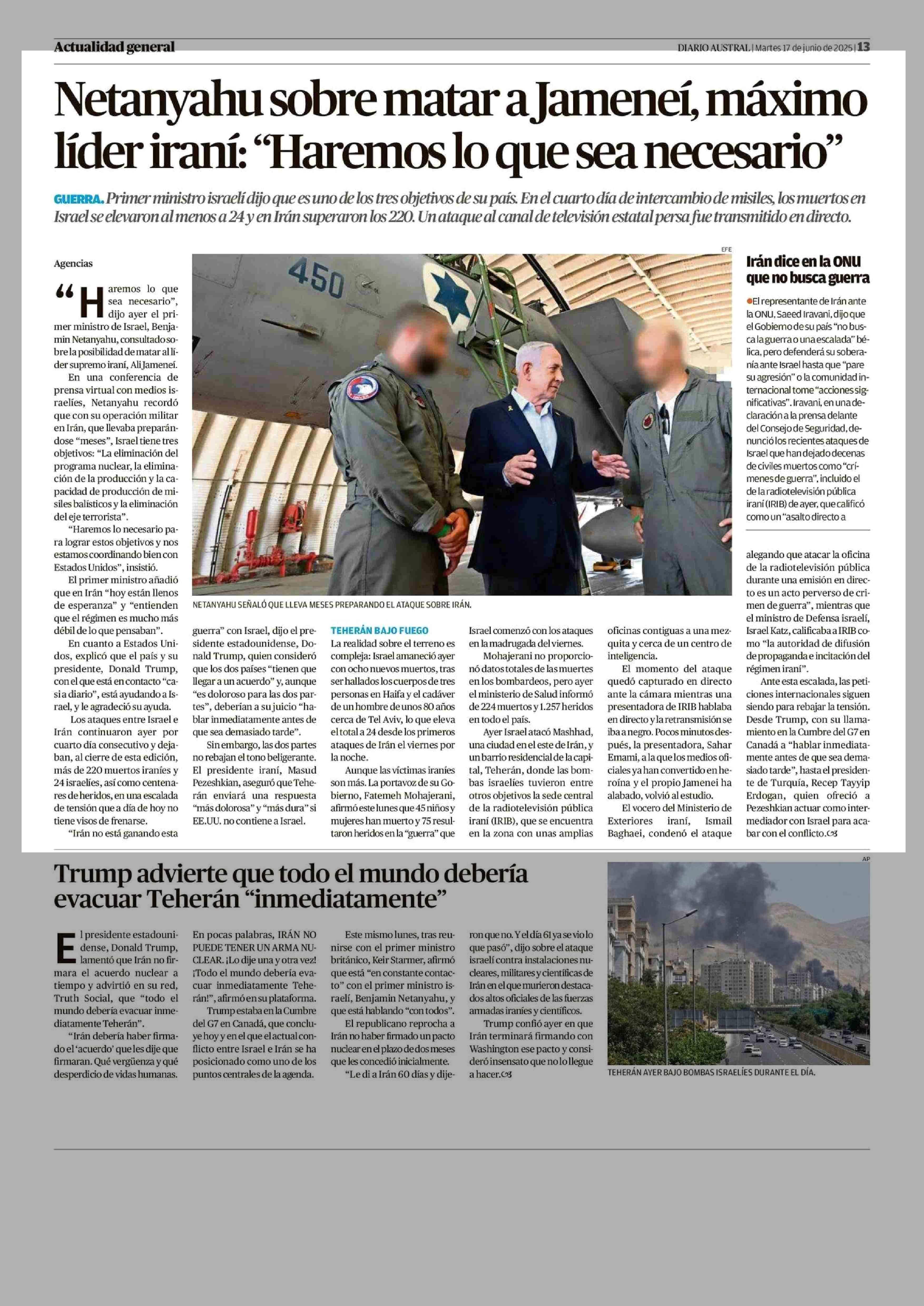 Netanyahu sobre matar a Jameneí, máximo líder iraní: "Haremos lo que sea necesario" 17-06-2025 Diario Austral Región de Los Ríos |