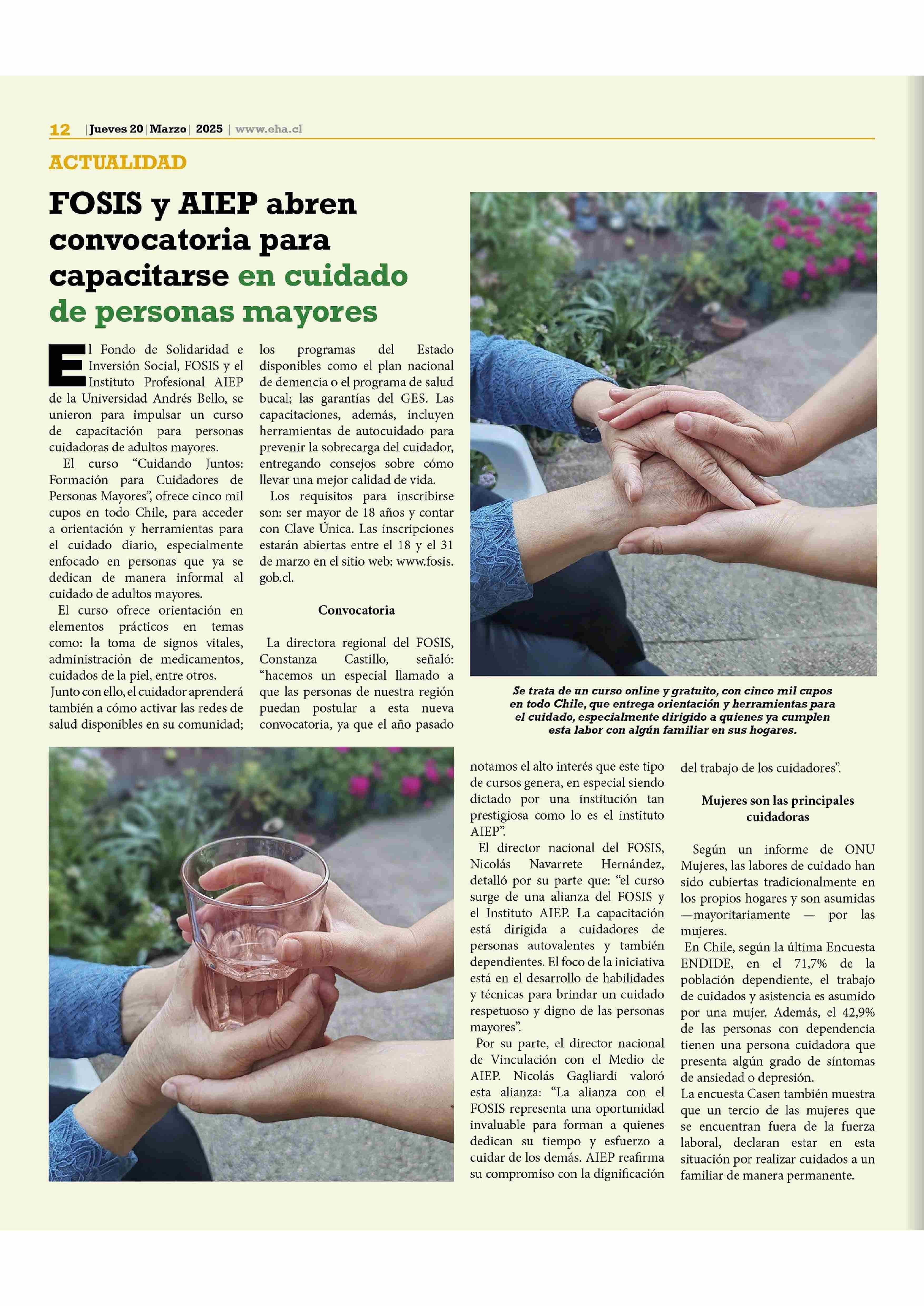 FOSIS y AIEP abren convocatoria para capacitarse en cuidado de personas mayores 20-03-2025 El Heraldo Austral |