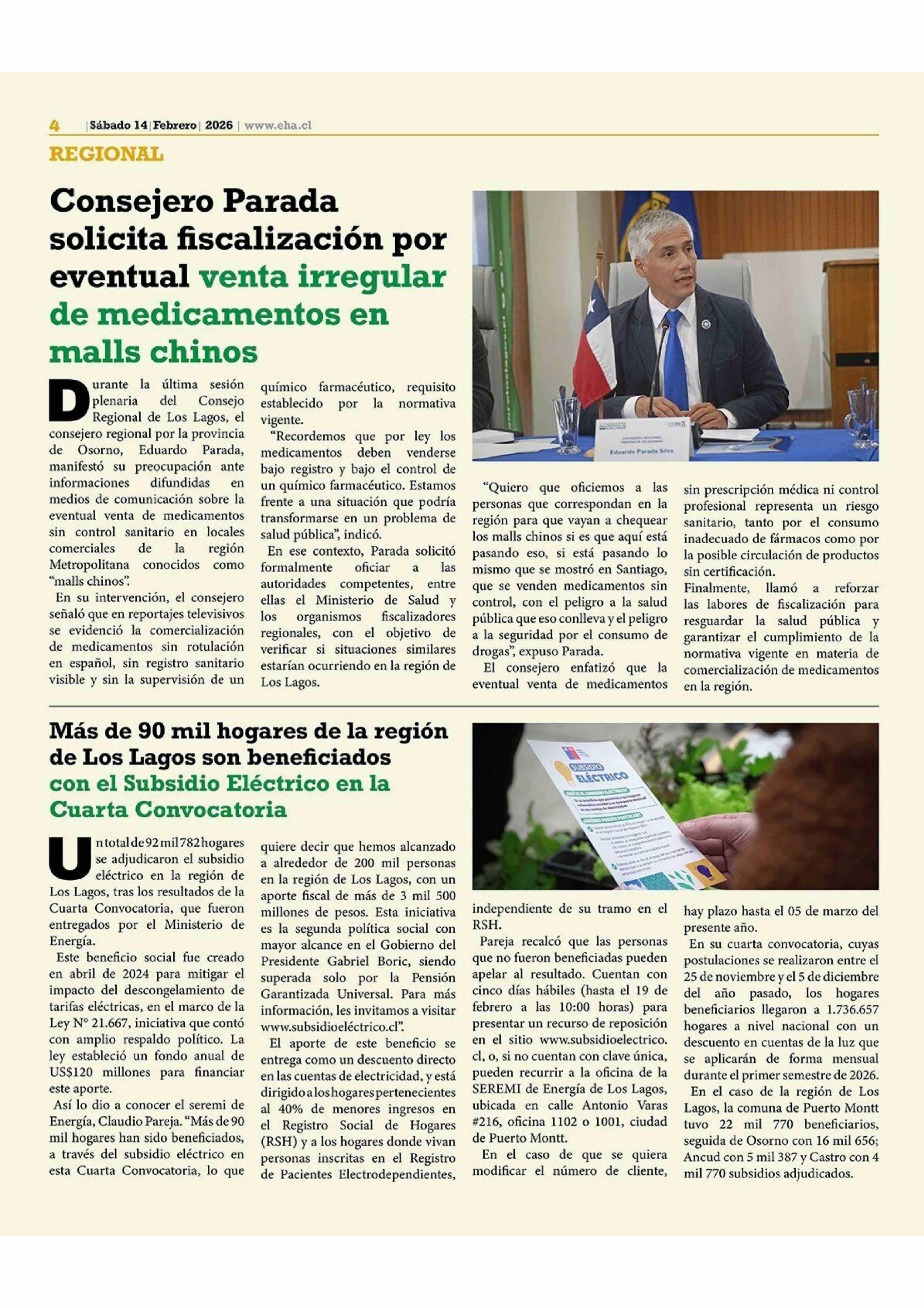 Más de 90 mil hogares de la región de Los Lagos son beneficiados con el Subsidio Eléctrico en la Cuarta Convocatoria 14-02-2026 El Heraldo Austral |