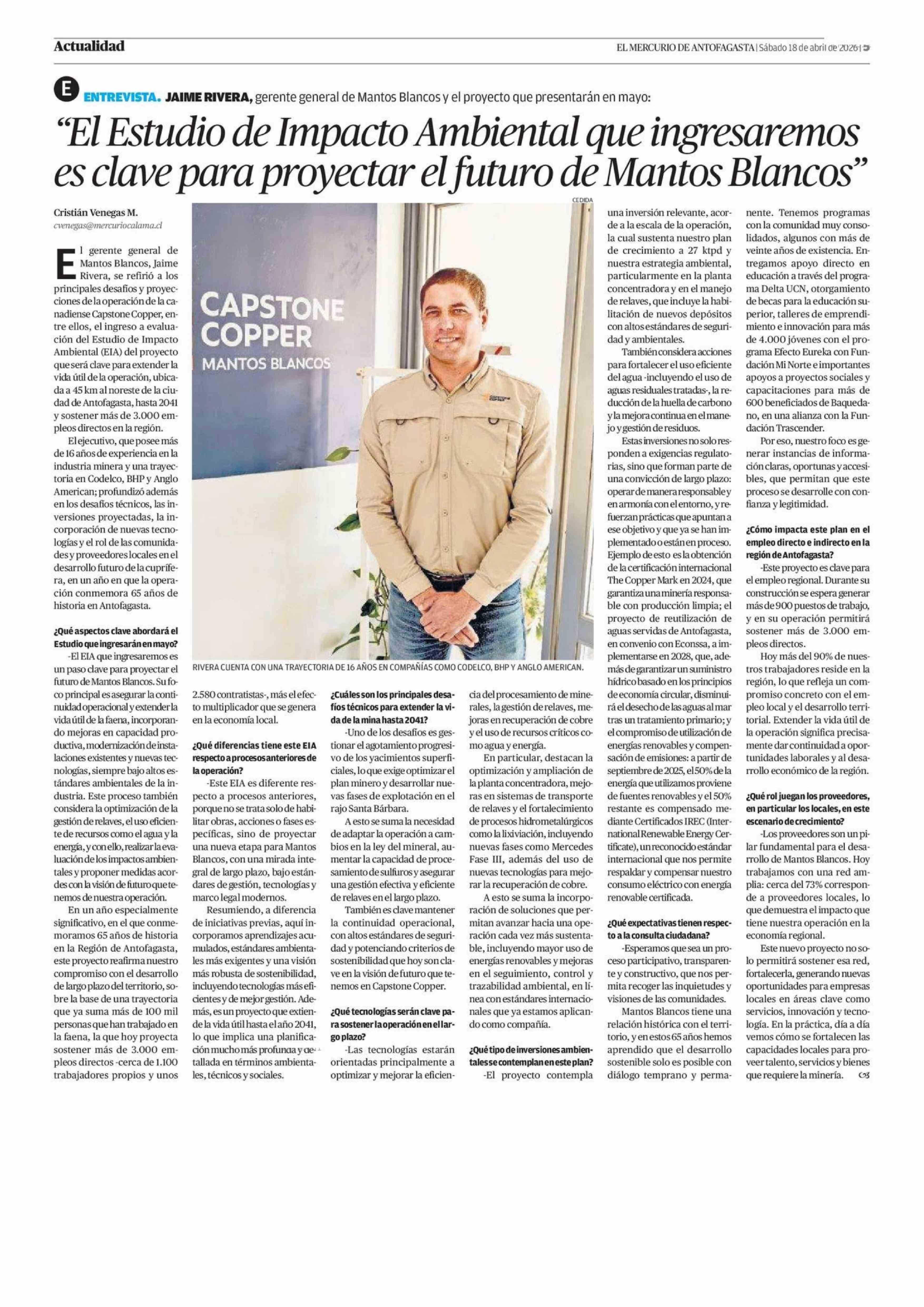 Título: "El Estudio de Impacto Ambiental que ingresaremos es clave para proyectar el futuro de Mantos Blancos"