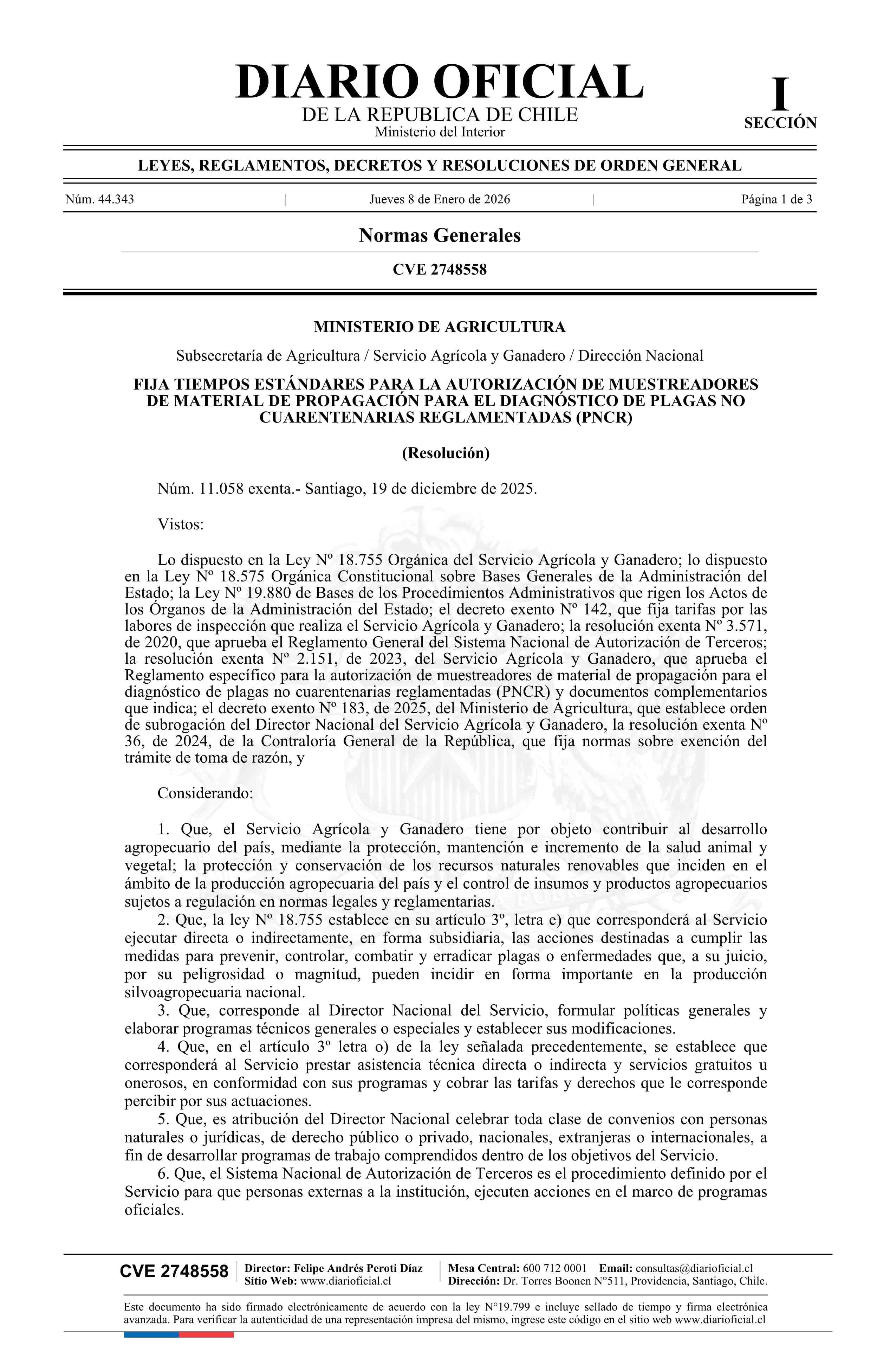 Título: Resolución exenta número 11.058, de 2025.- Fija tiempos estándares para la autorización de muestreadores de material de propagación para el diagnóstico de plagas no cuarentenarias reglamentadas (PNCR)