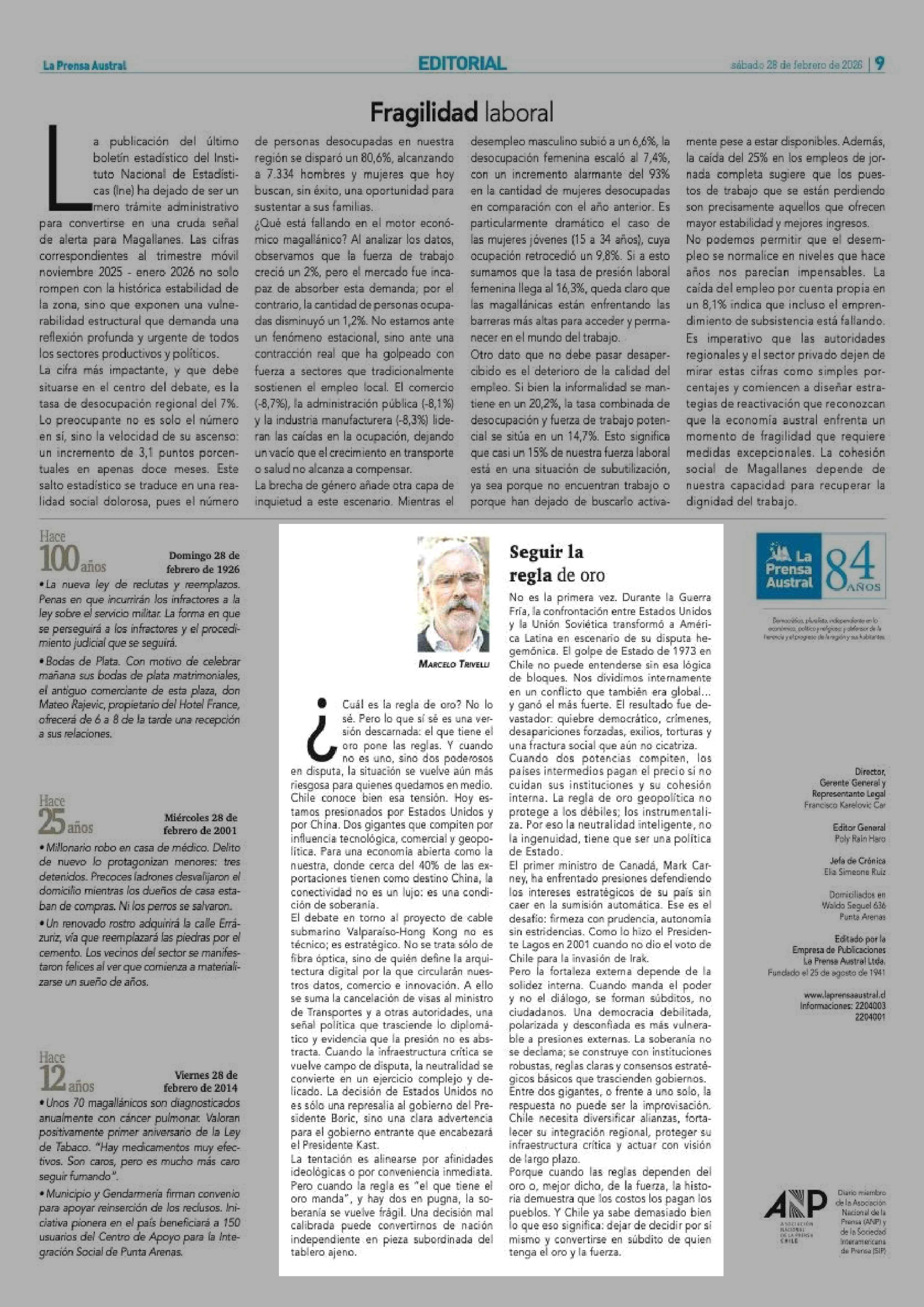 Columnas de Opinión: Seguir la regla de oro 28-02-2026 La Prensa Austral |