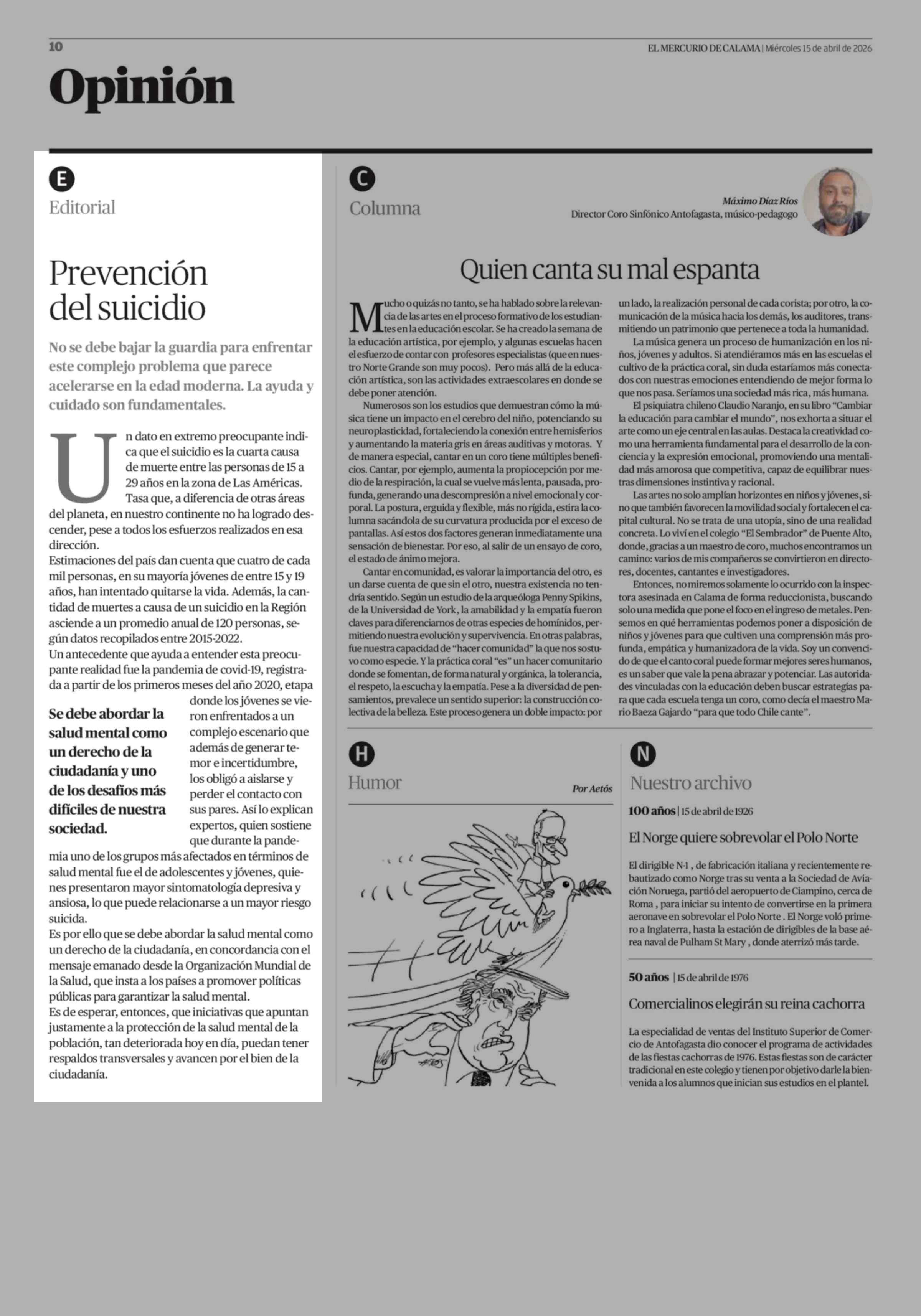 Editorial: Prevención del suicidio 15-04-2026 El Mercurio de Calama |