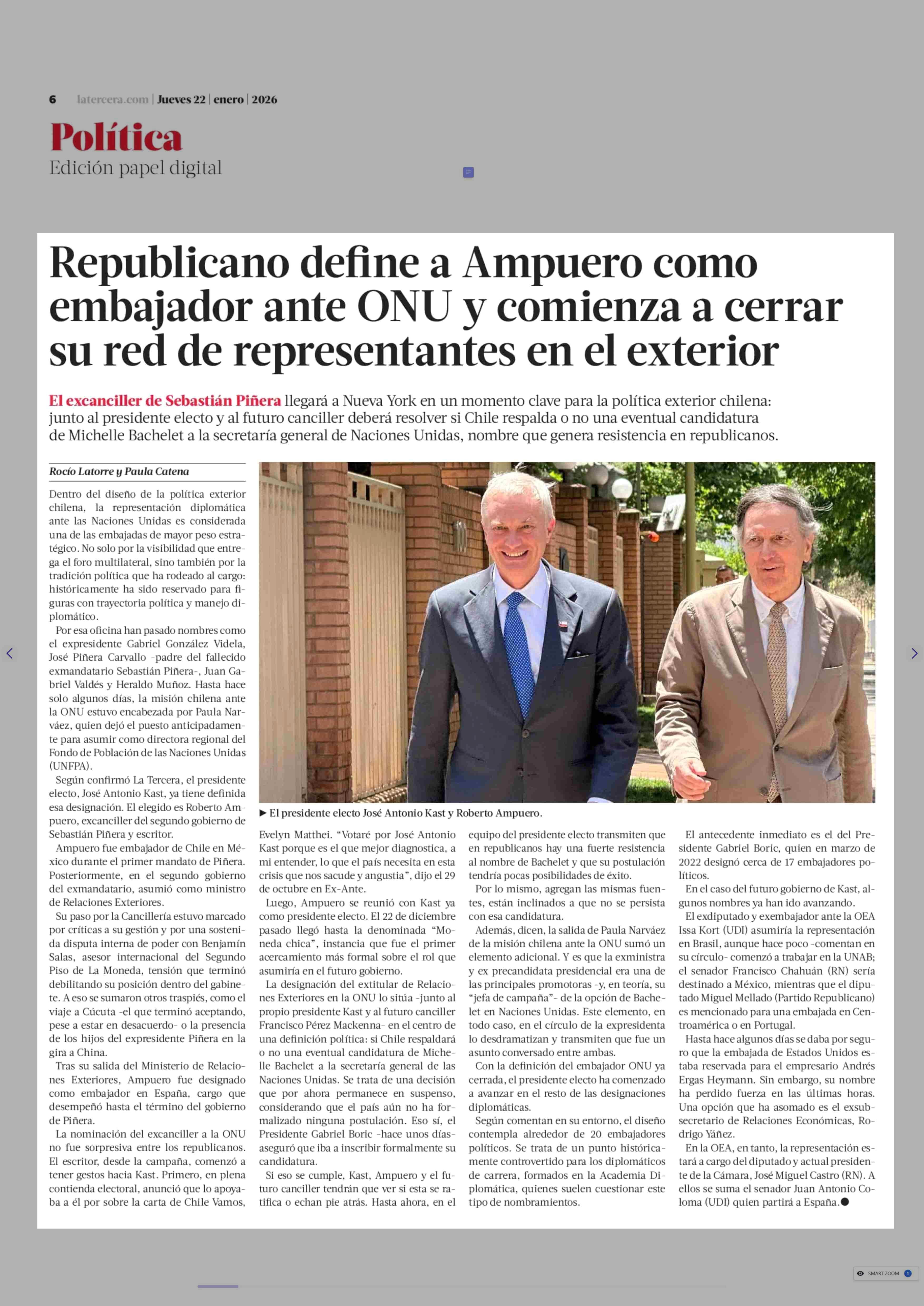 Republicano define a Ampuero como embajador ante ONU y comienza a cerrar su red de representantes en el exterior 22-01-2026 La Tercera |
