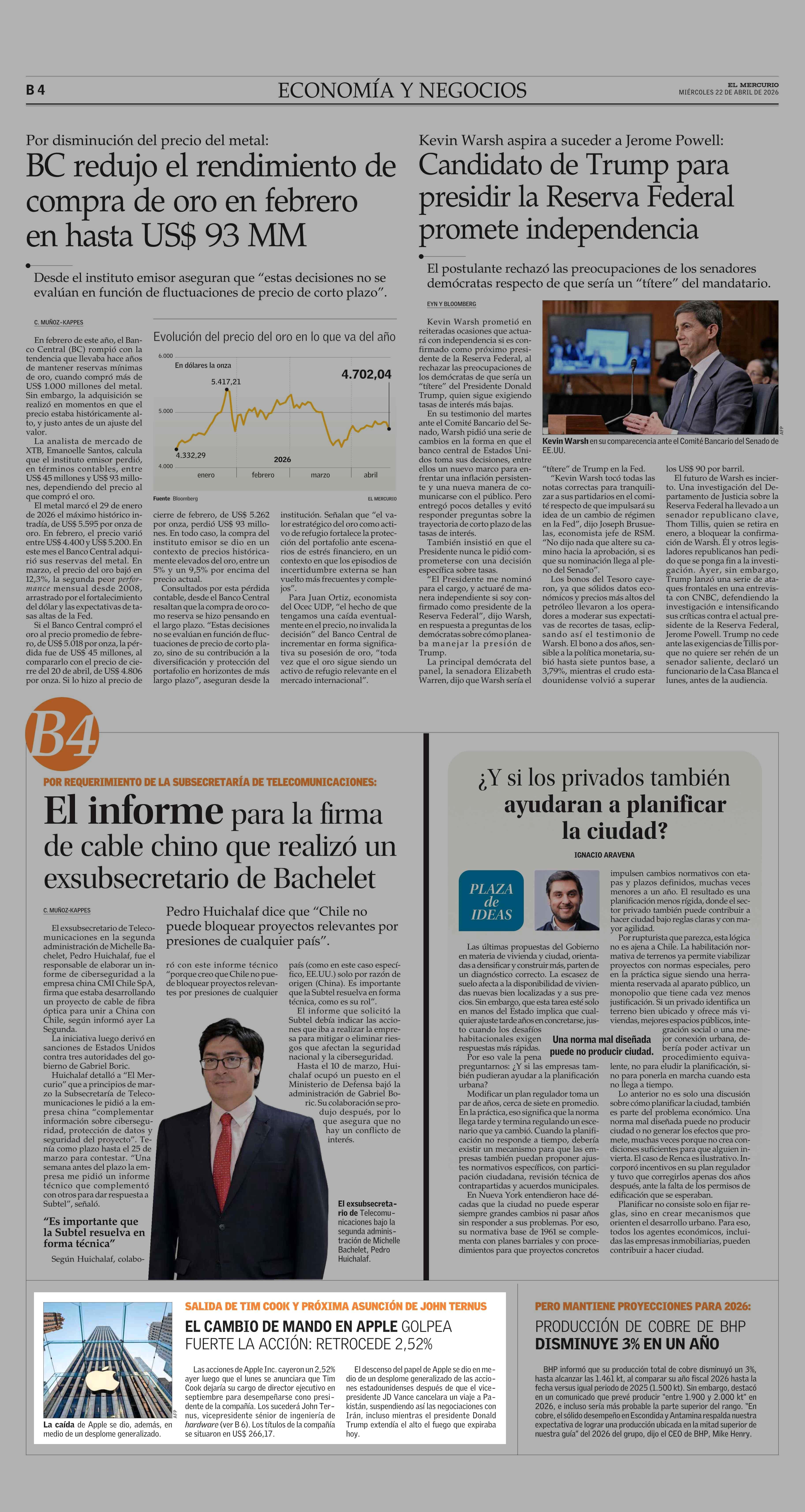 EL CAMBIO DE MANDO EN APPLE GOLPEA FUERTE LA ACCIÓN: RETROCEDE 2,52% 22-04-2026 El Mercurio |