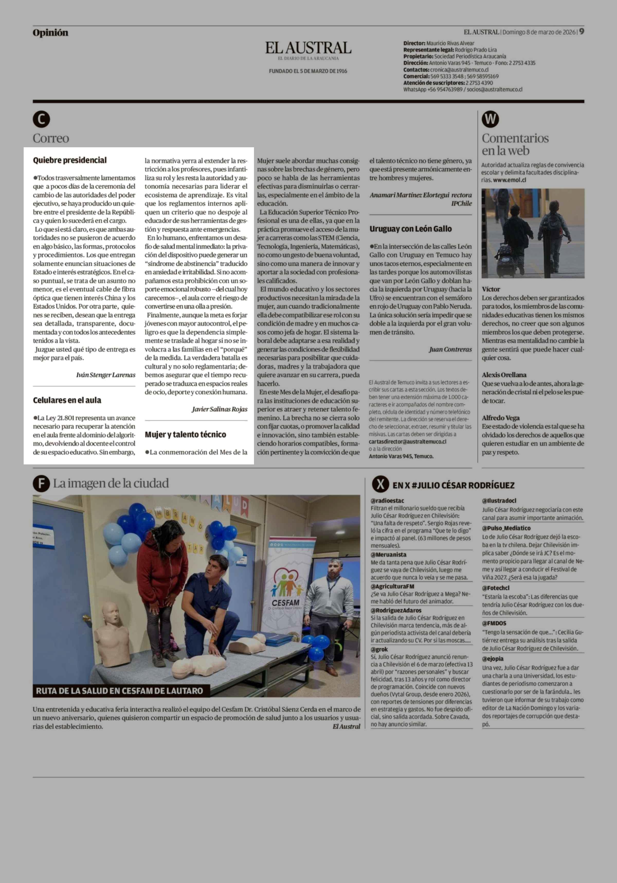 Cartas: Celulares en el aula 08-03-2026 El Austral de la Araucanía |