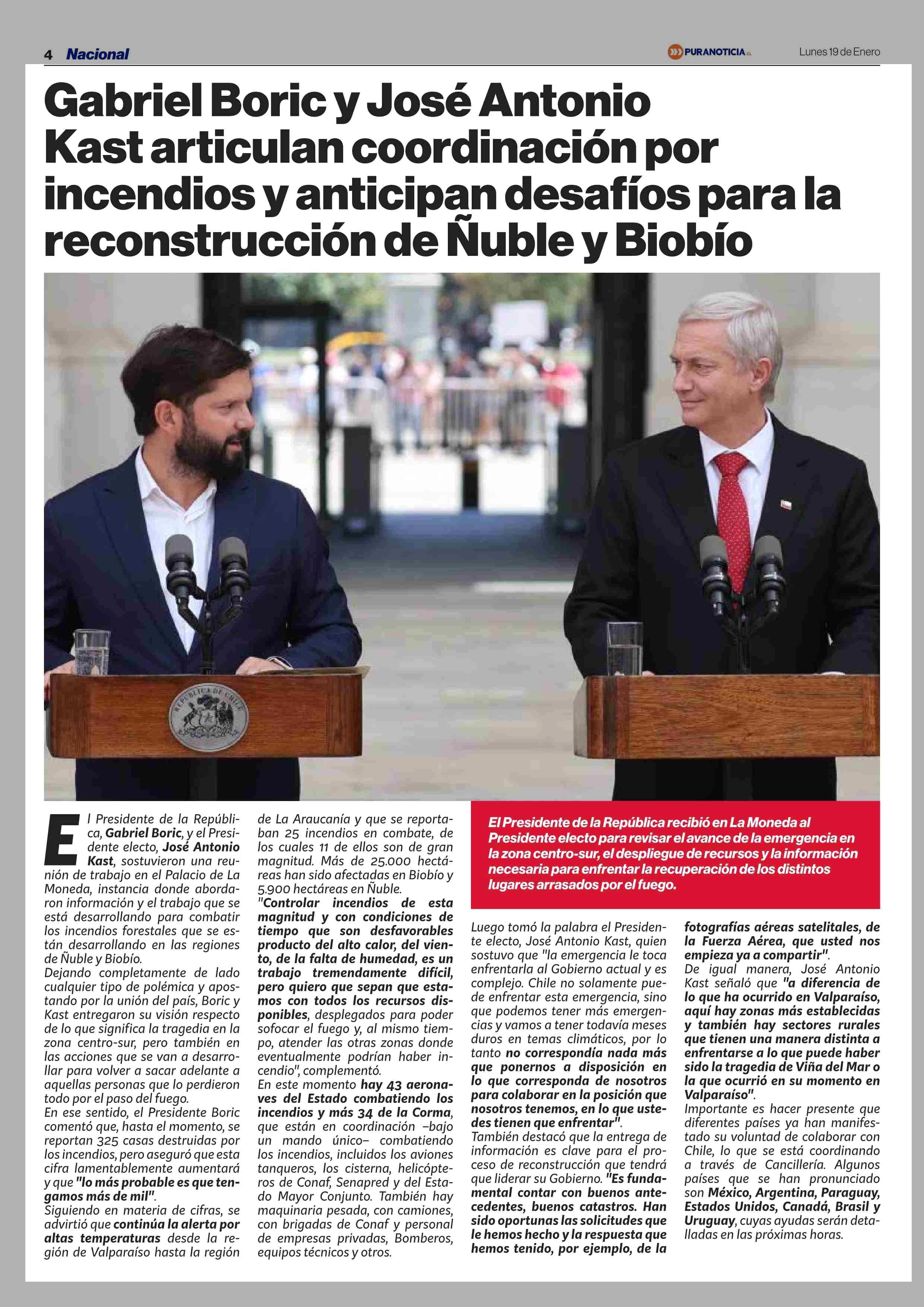 Gabriel Boric y José Antonio Kast articulan coordinación por incendios y anticipan desafíos para la reconstrucción de Nuble y Biobío 19-01-2026 Puranoticia.cl |