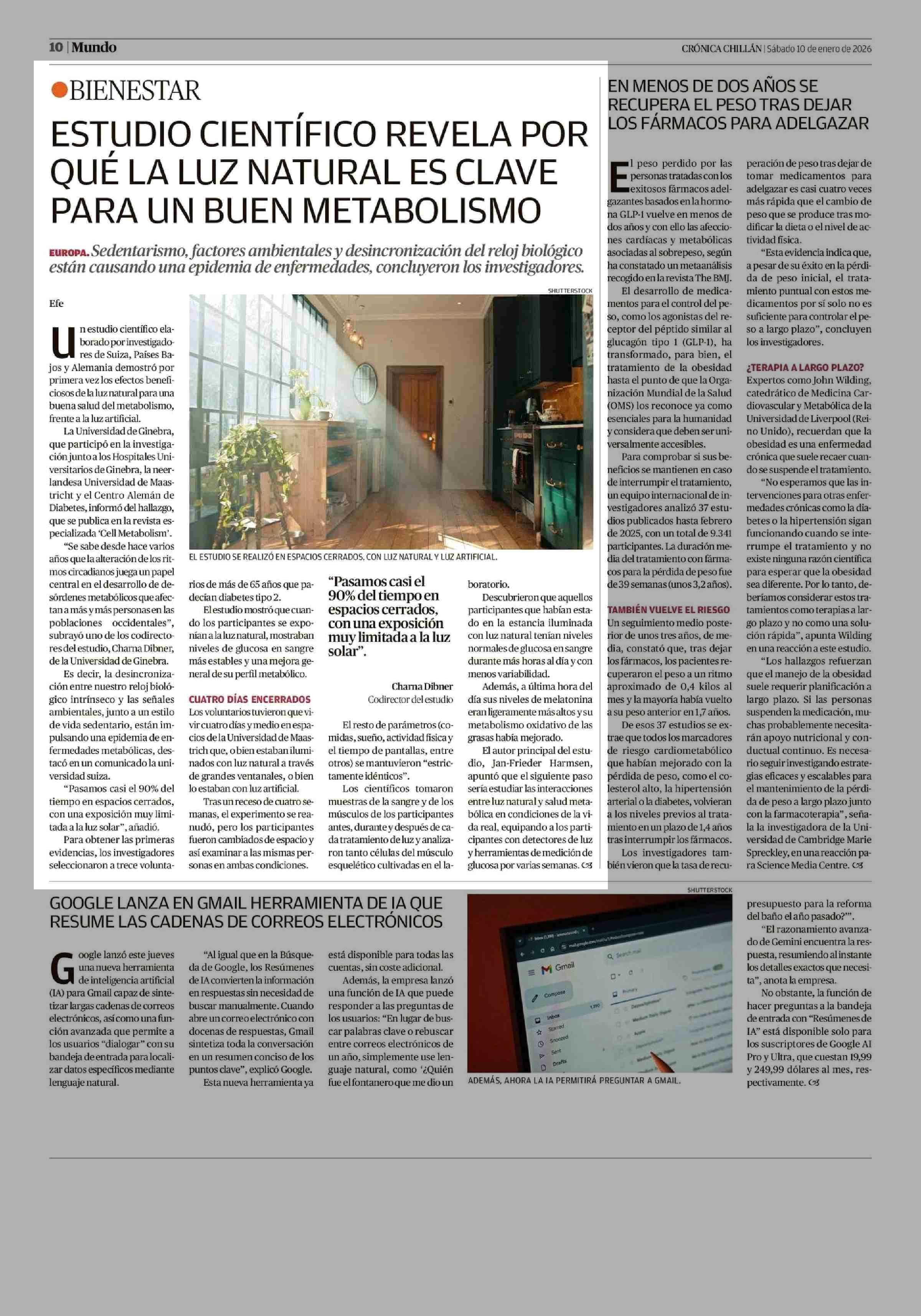ESTUDIO CIENTÍFICO REVELA POR QUÉ LA LUZ NATURAL ES CLAVE PARA UN BUEN METABOLISMO 10-01-2026 Crónica de Chillán |