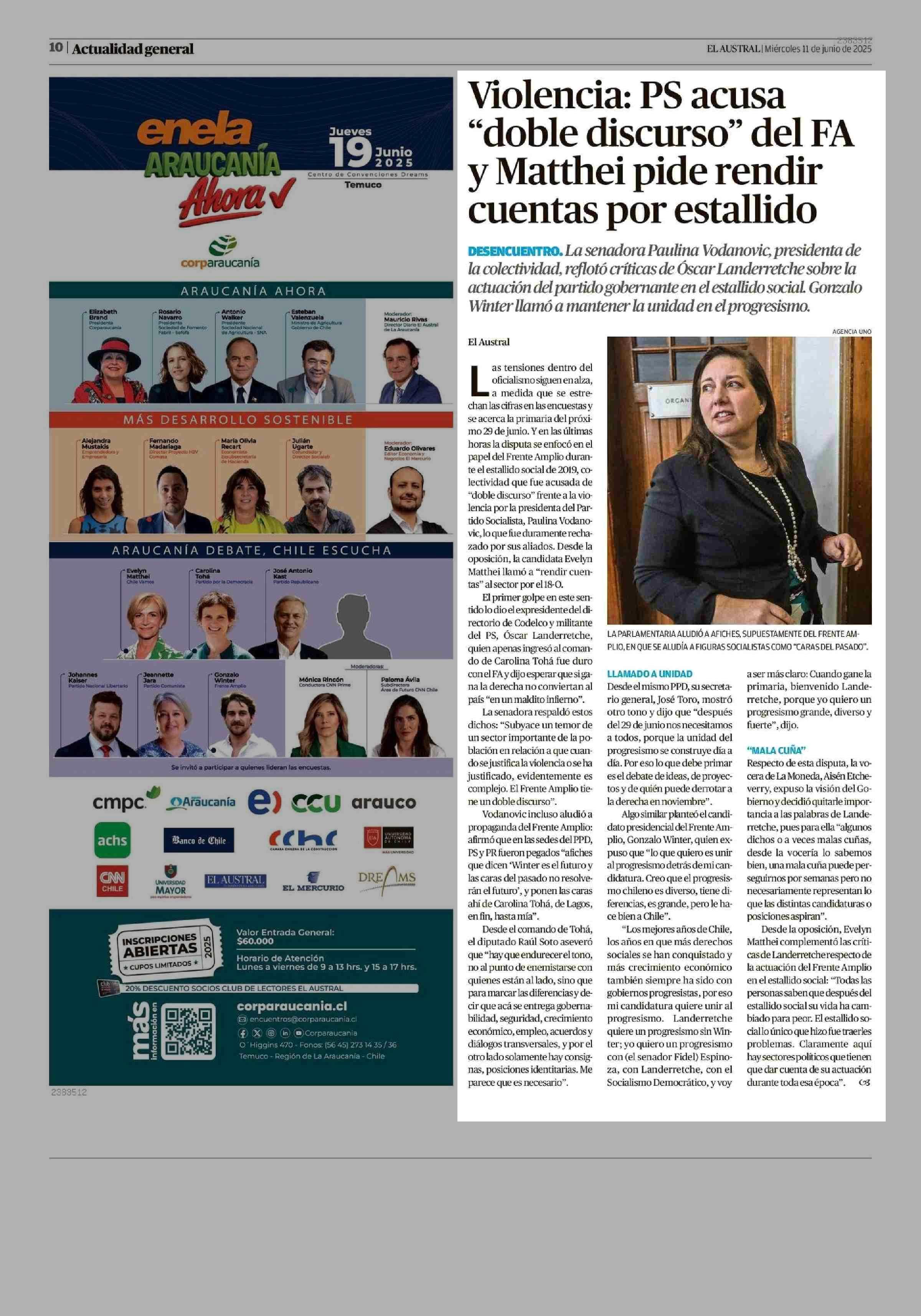 Violencia: PS acusa “doble discurso” del FA y Matthei pide rendir cuentas por estallido 11-06-2025 El Austral de la Araucanía |
