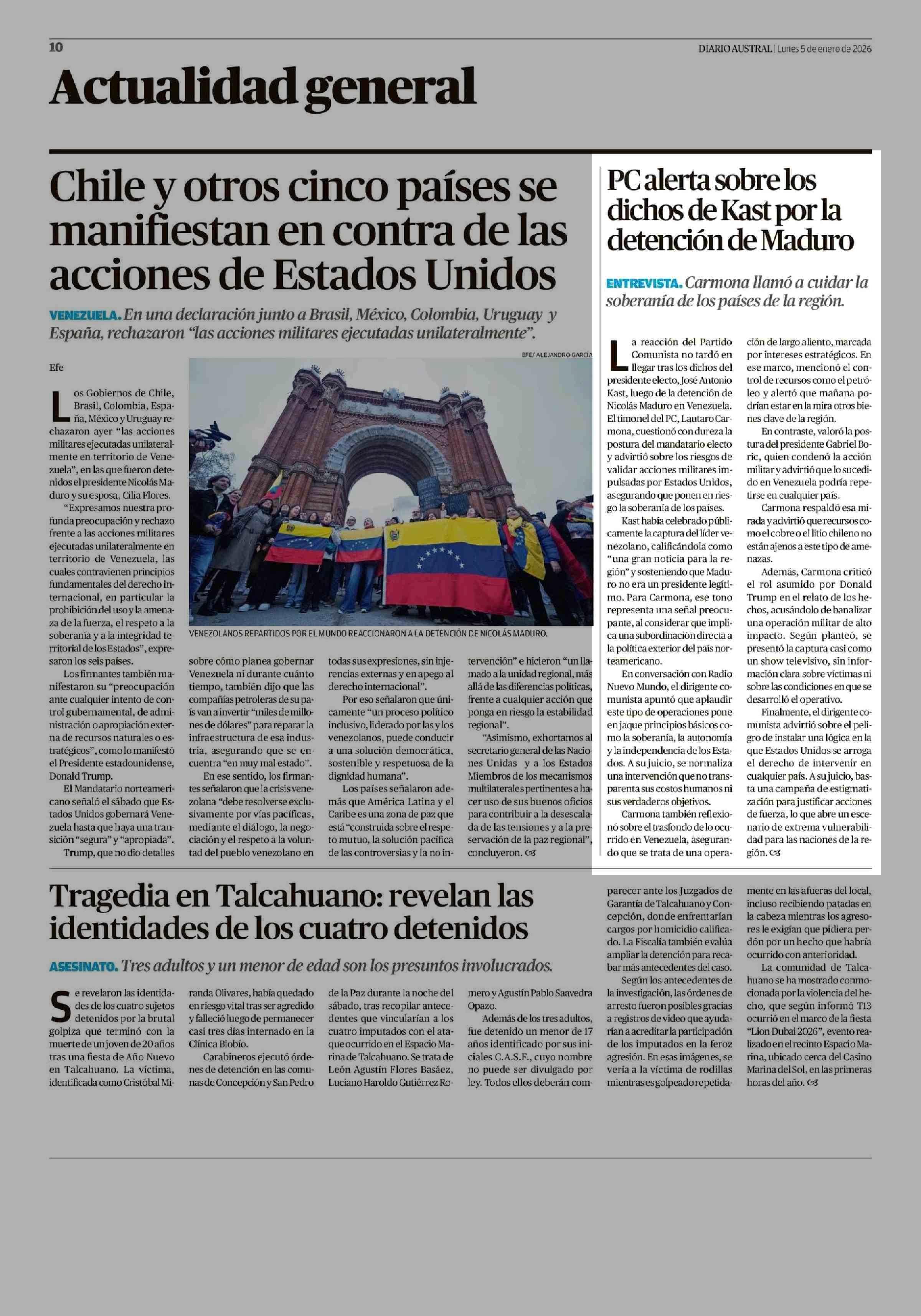 PCalerta sobre los dichos de Kast por la detención de Maduro 05-01-2026 Diario Austral Región de Los Ríos |