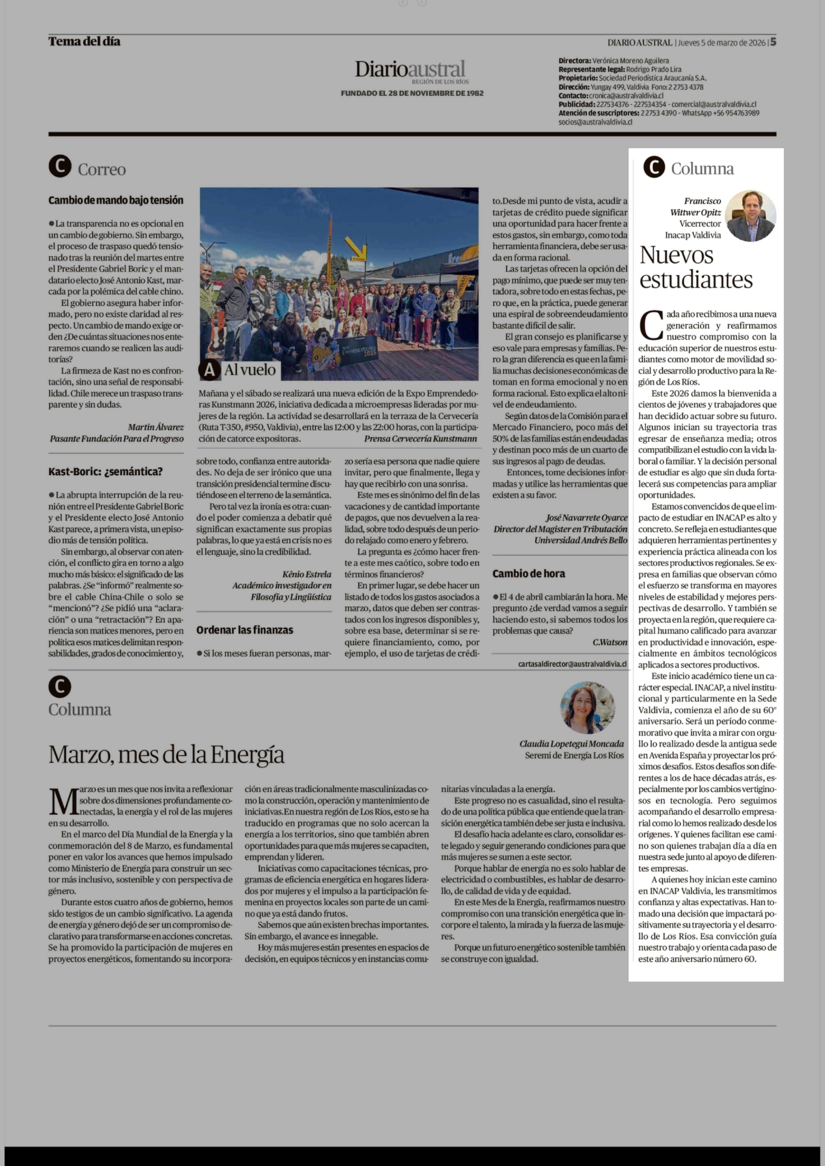 Columnas de Opinión: Nuevos estudiantes 05-03-2026 Diario Austral Región de Los Ríos |