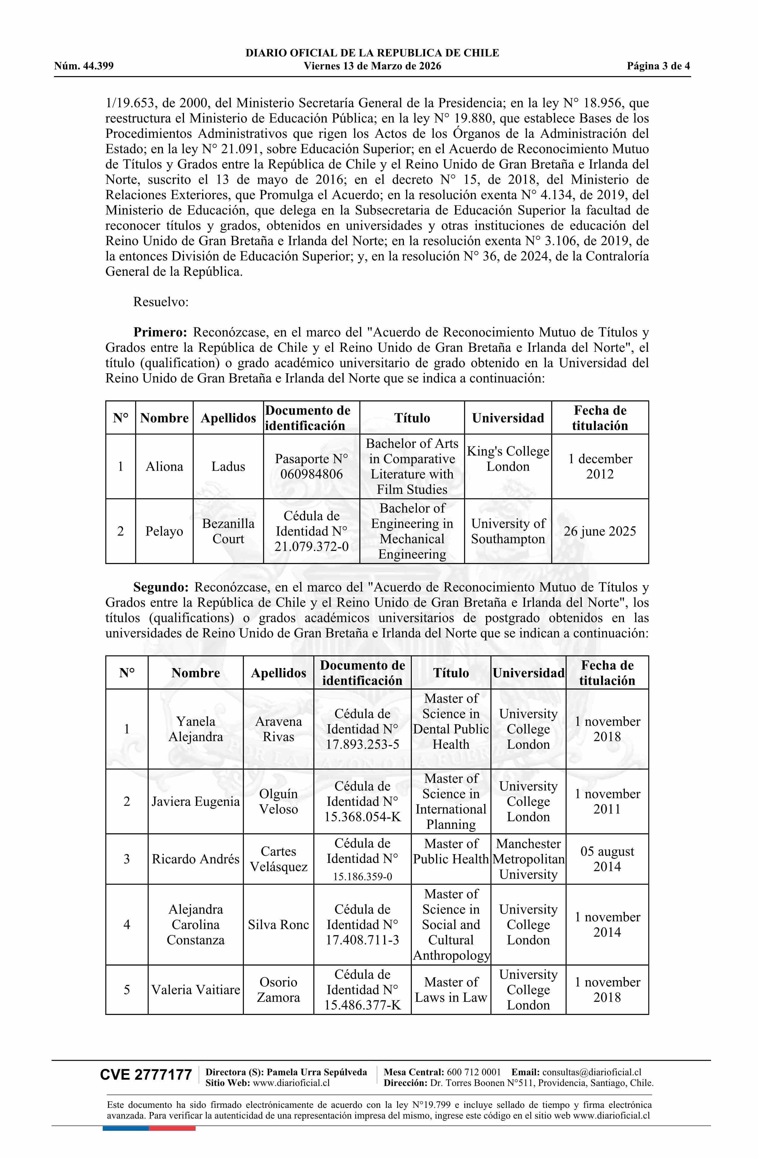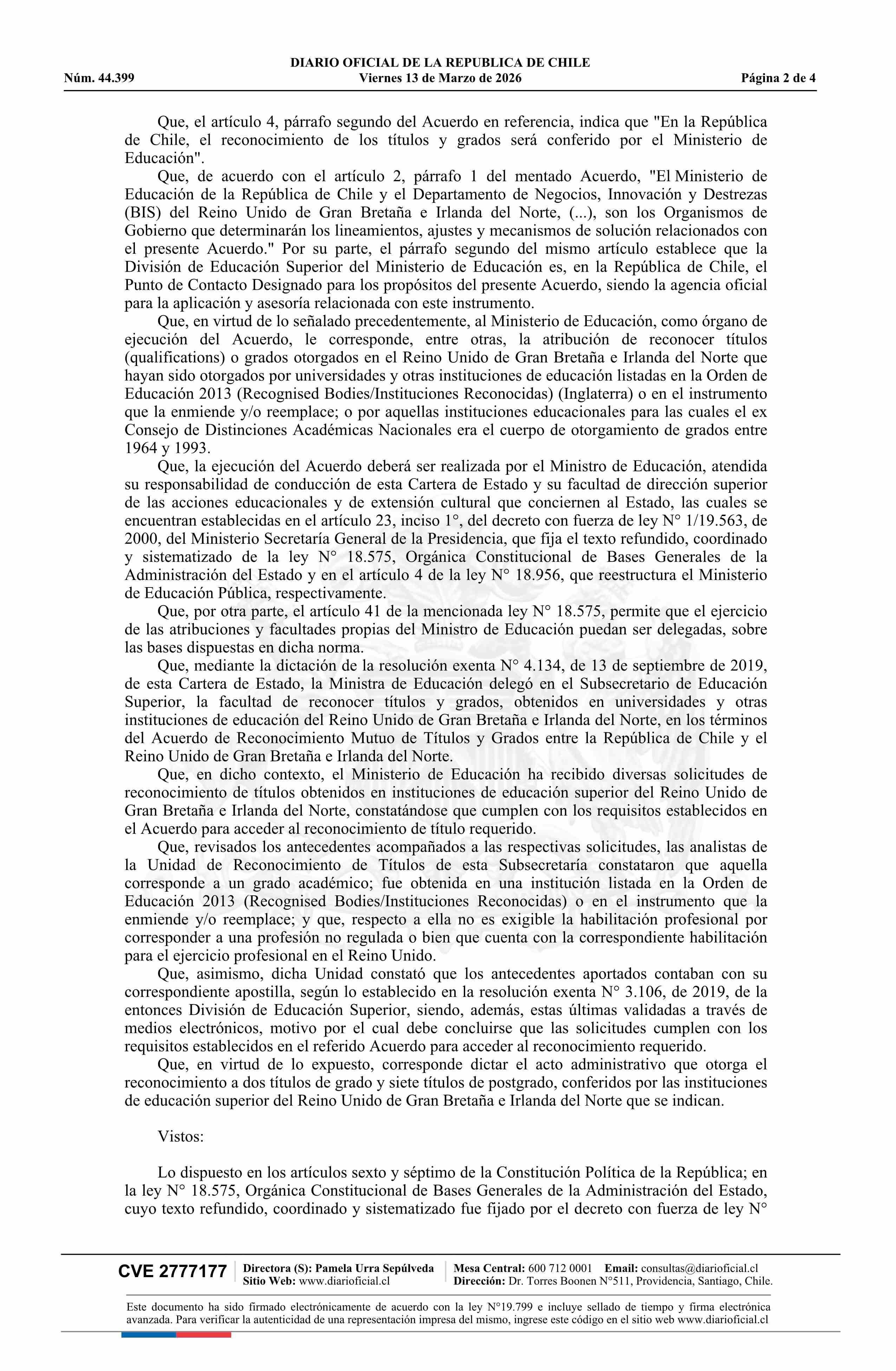 | Título: | Resolución exenta número 873, de 2026.- Reconoce los títulos expedidos por universidades del Reino Unido que indica, en el marco del Acuerdo de Reconocimiento Mutuo de Títulos y Grados entre la República de Chile y el Reino Unido de Gran Bretaña e Irlanda del Norte |