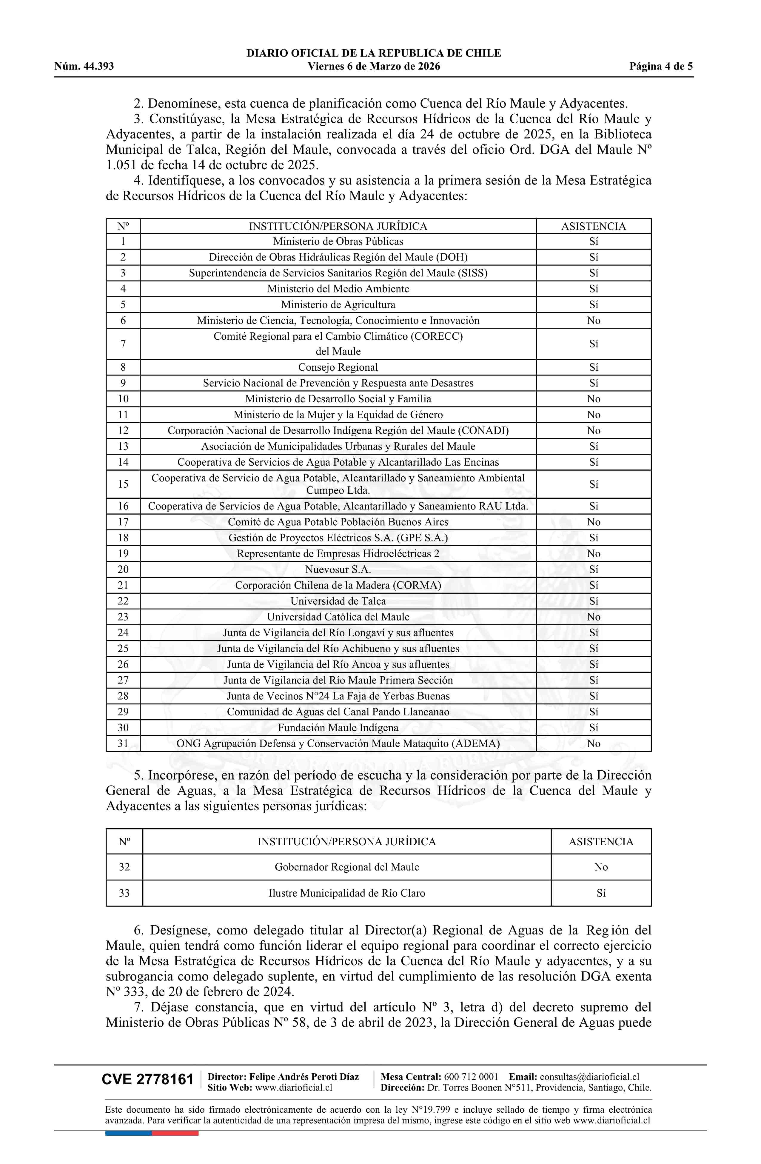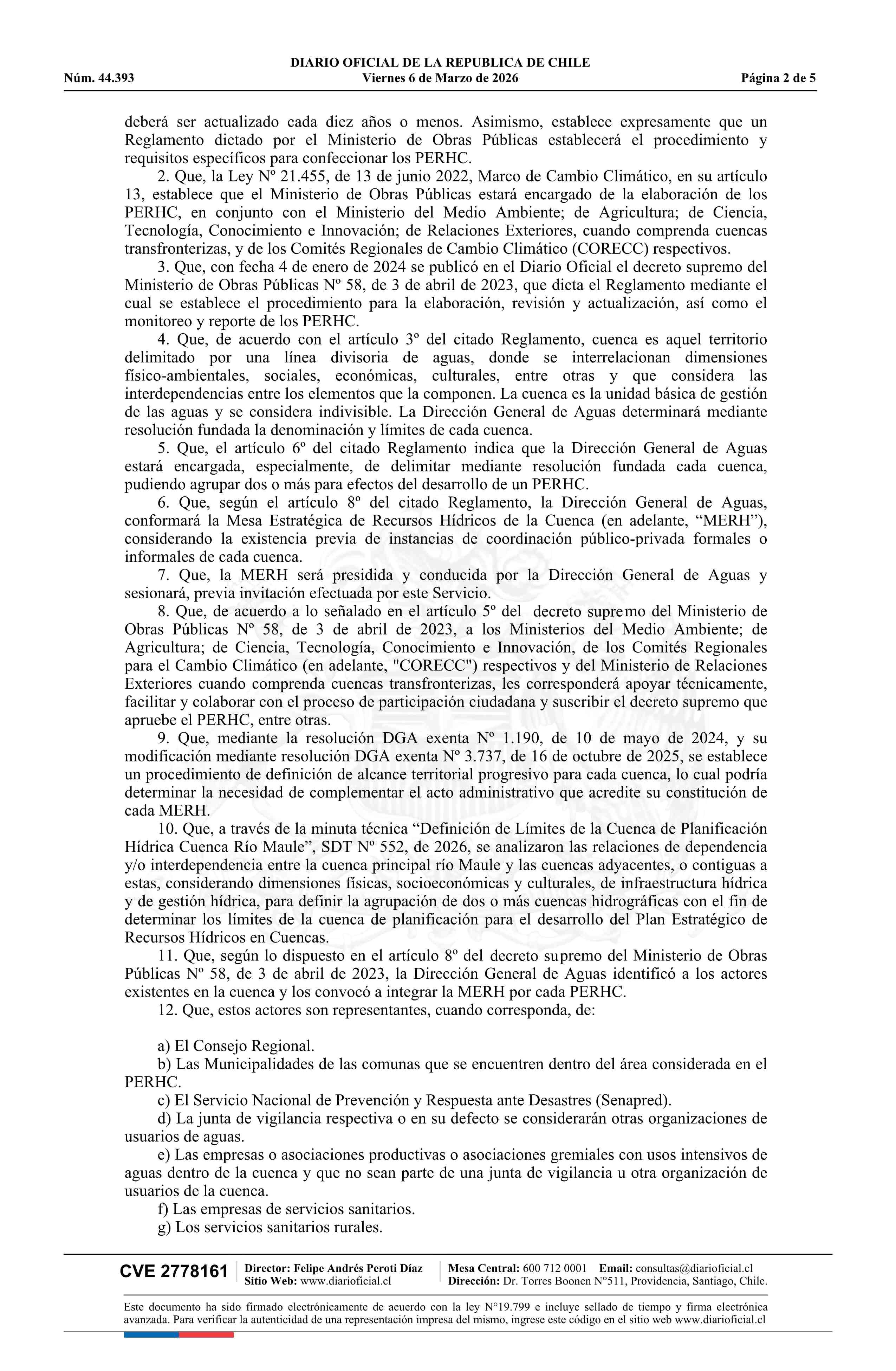 | Título: | Resolución exenta número 430, de 2026.- Delimita y denomina cuenca de planificación para el desarrollo del Plan Estratégico de Recursos Hídricos en la Cuenca del Río Maule y Adyacentes; constituye mesa estratégica de recursos hídricos; identifica convocados y asistencia a primera sesión; y designa d |
