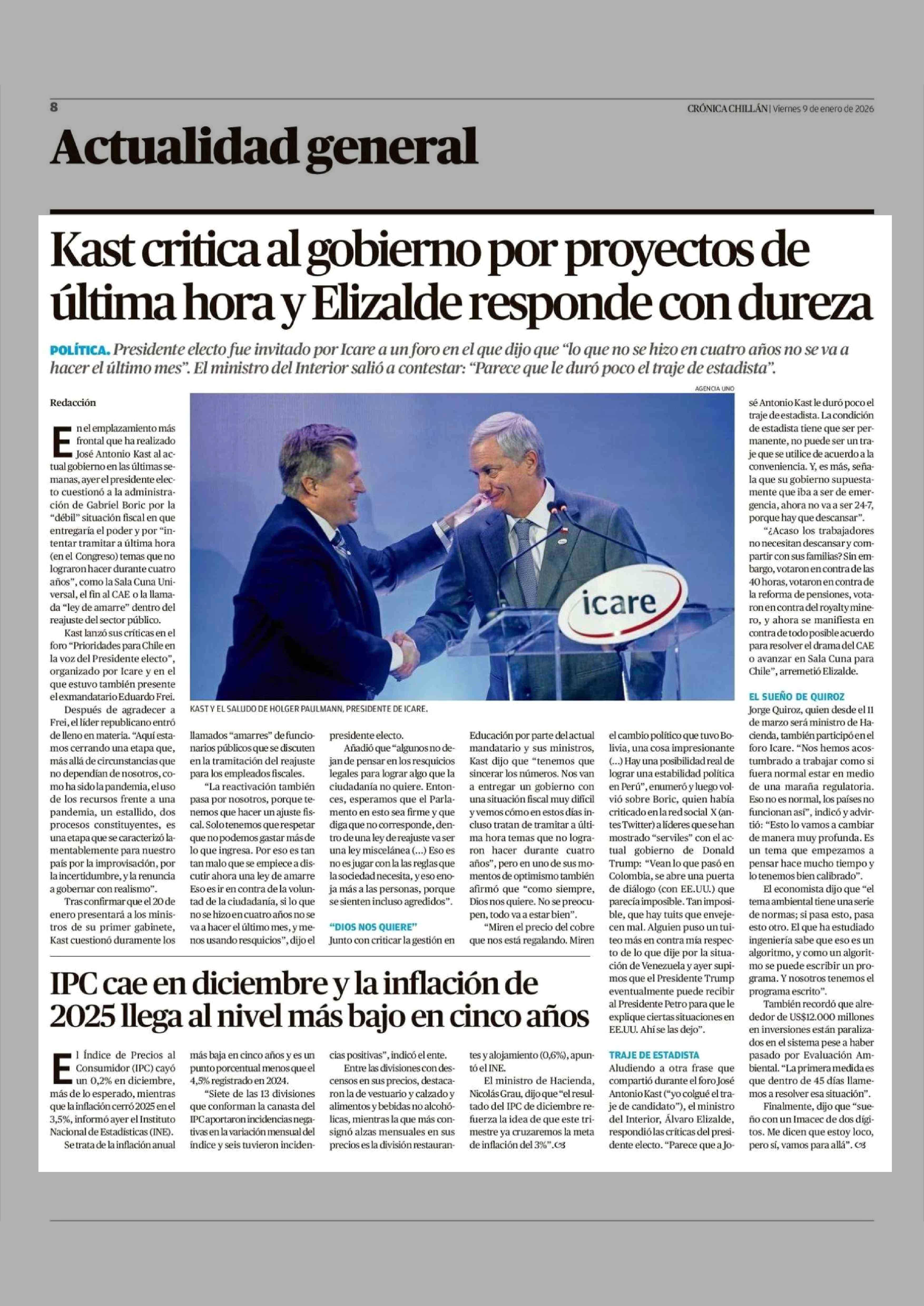 Kast critica al gobierno por proyectos de última hora y Elizalde responde con dureza 09-01-2026 Crónica de Chillán |