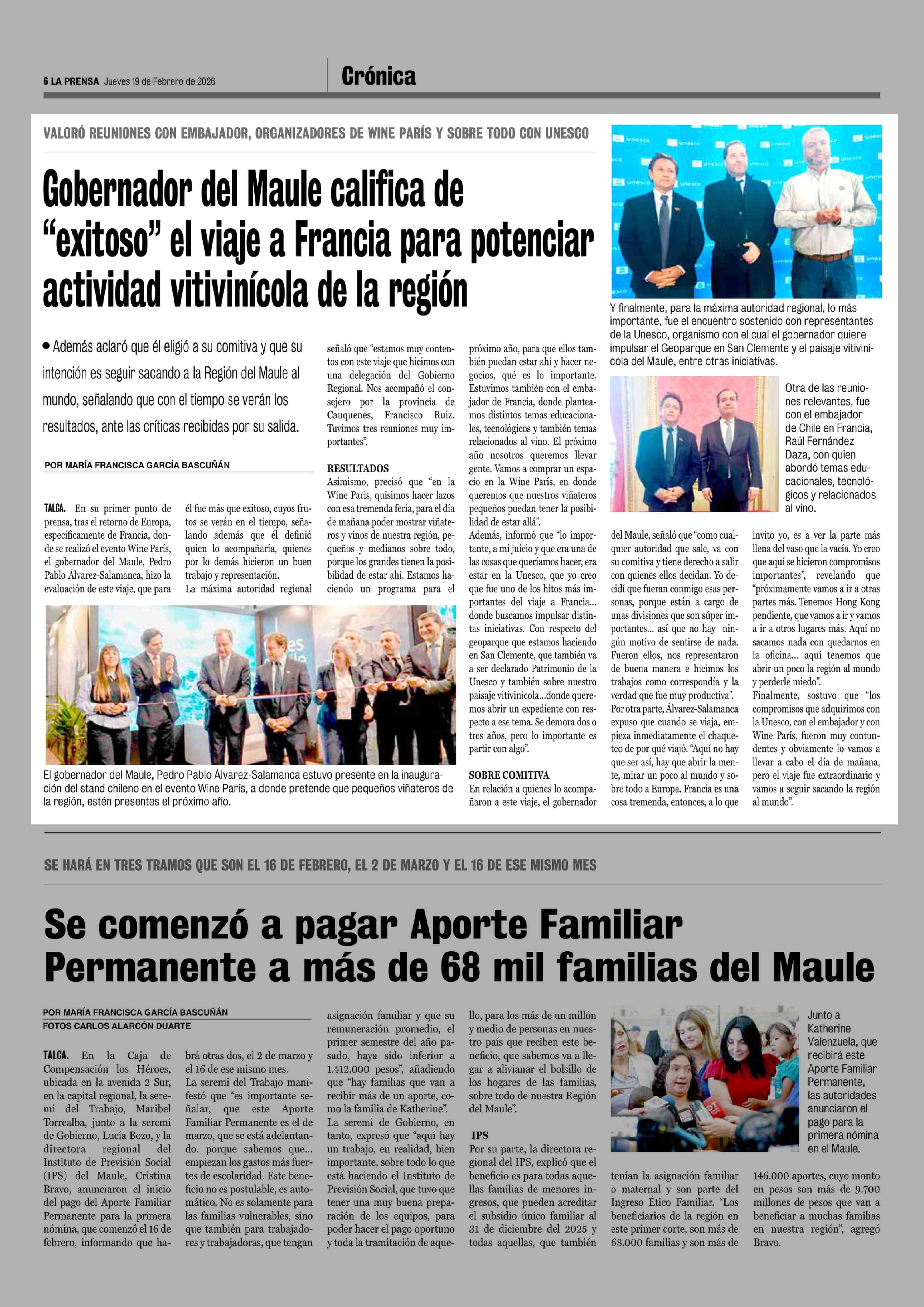 Gobernador del Maule califica de "exitoso" el viaje a Francia para potenciar actividad vitivinícola de la región 19-02-2026 La Prensa de Curicó |