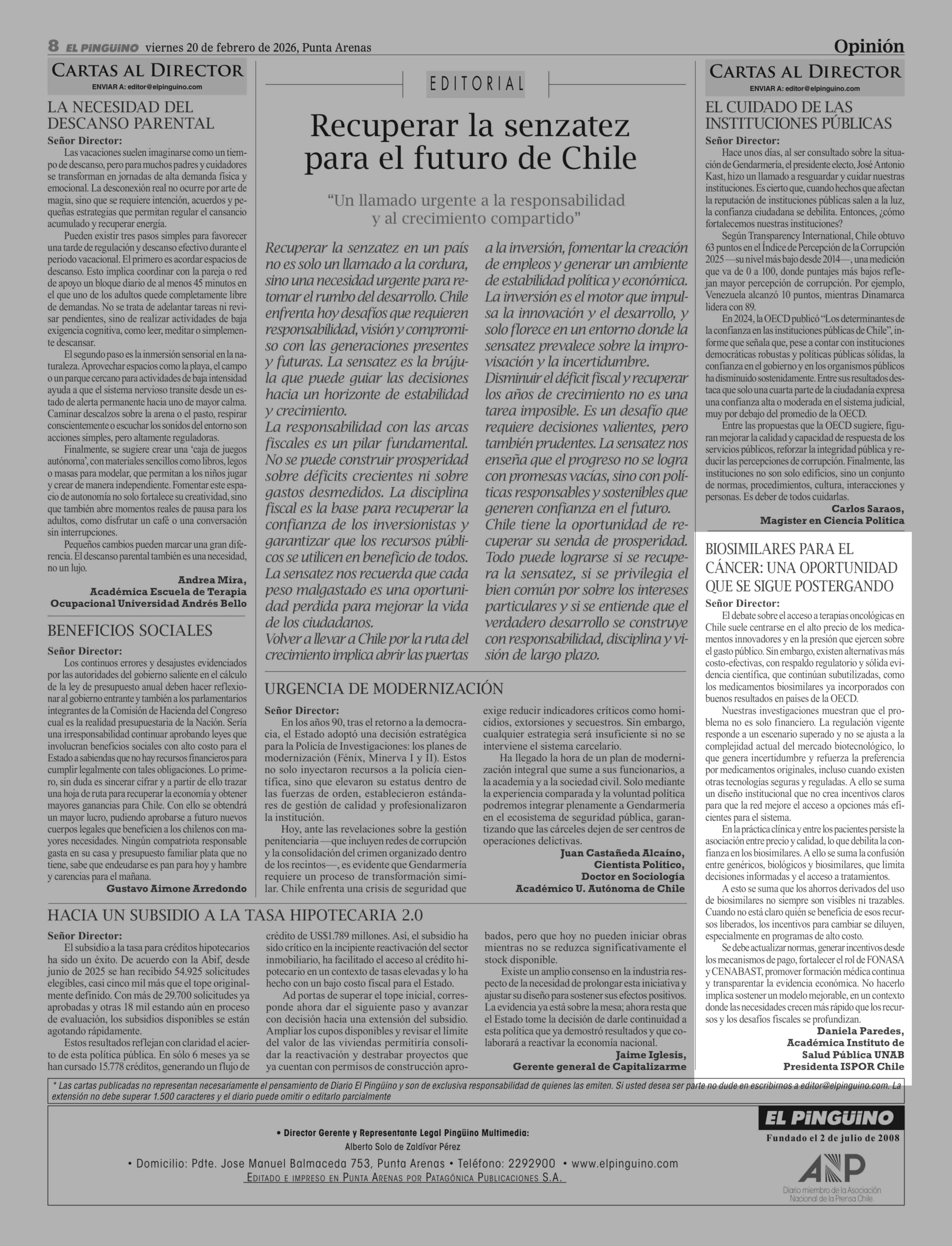 Cartas: BIOSIMILARES PARA EL CÁNCER: UNA OPORTUNIDAD QUE SE SIGUE POSTERGANDO Señor Director: 20-02-2026 El Pingüino |