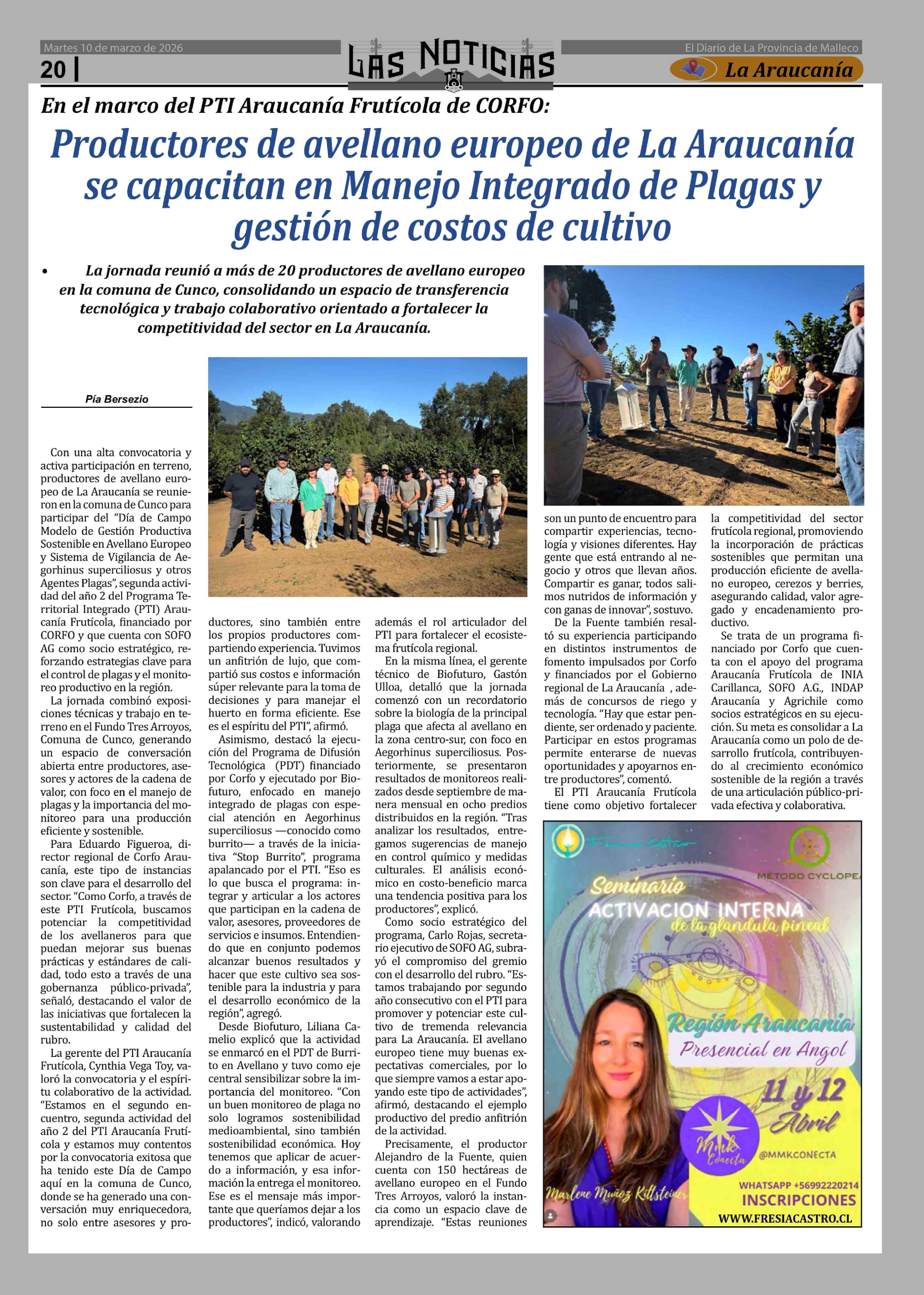 Título: Productores de avellano europeo de La Araucanía se capacitan en Manejo Integrado de Plagas y gestión de costos de cultivo