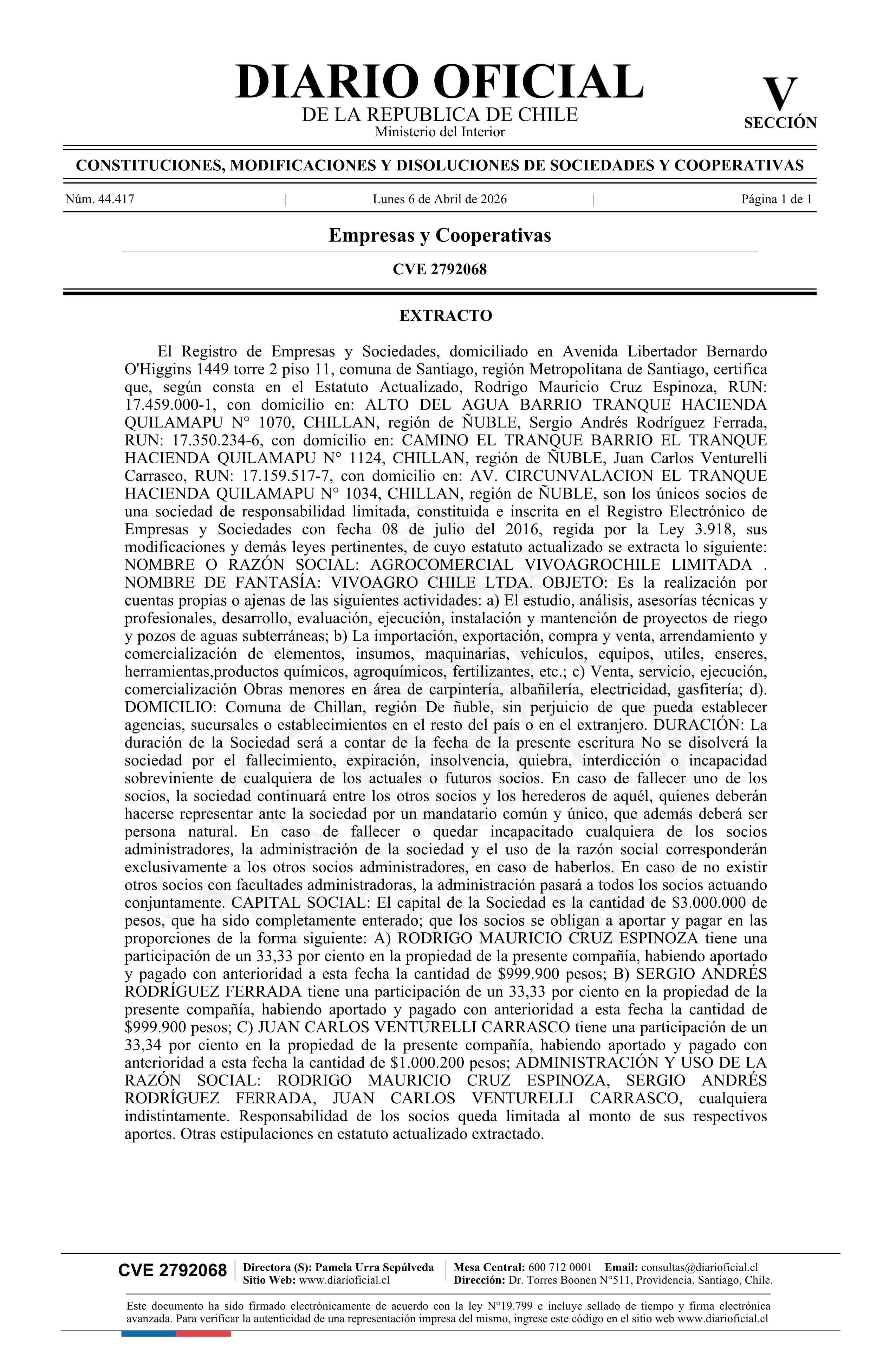 AGROCOMERCIAL VIVOAGROCHILE LIMITADA 06-04-2026 Diario Oficial Edición Electrónica |