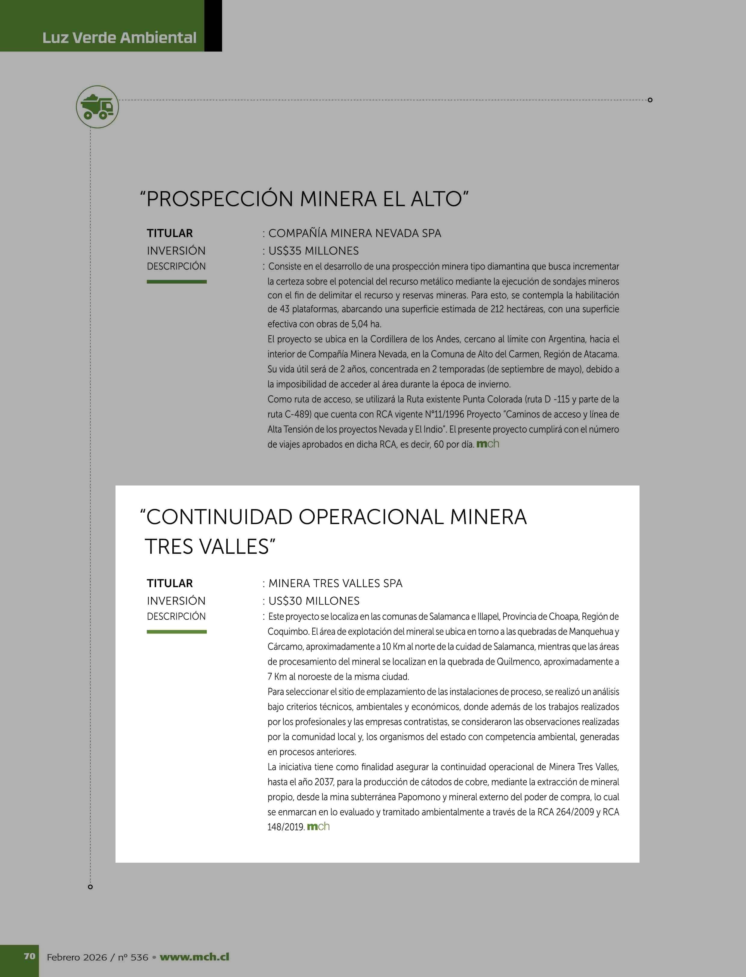 “CONTINUIDAD OPERACIONAL MINERA TRES VALLES” 19-02-2026 Revista Minería Chilena |