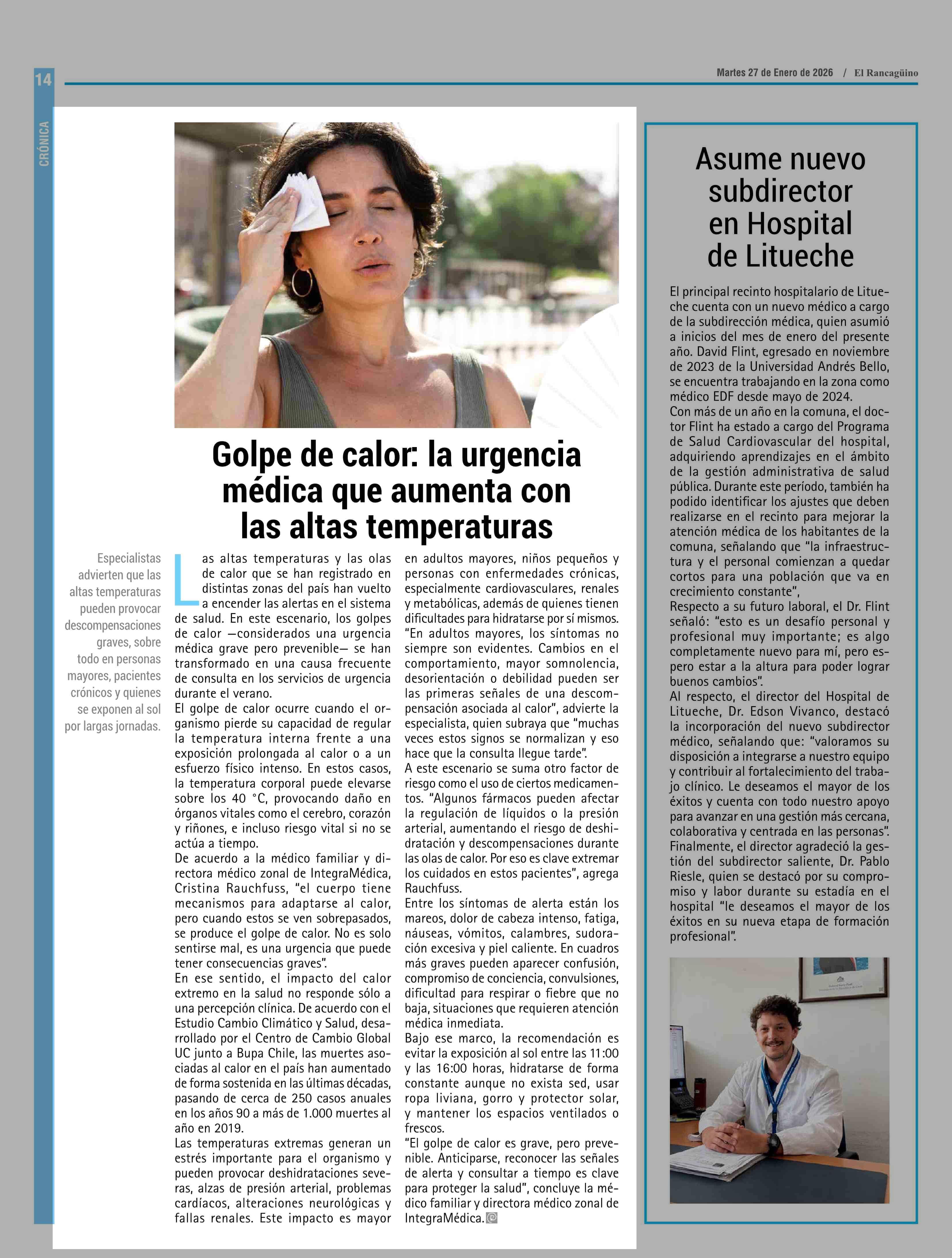Golpe de calor: la urgencia médica que aumenta con las altas temperaturas 27-01-2026 El Rancagüino |