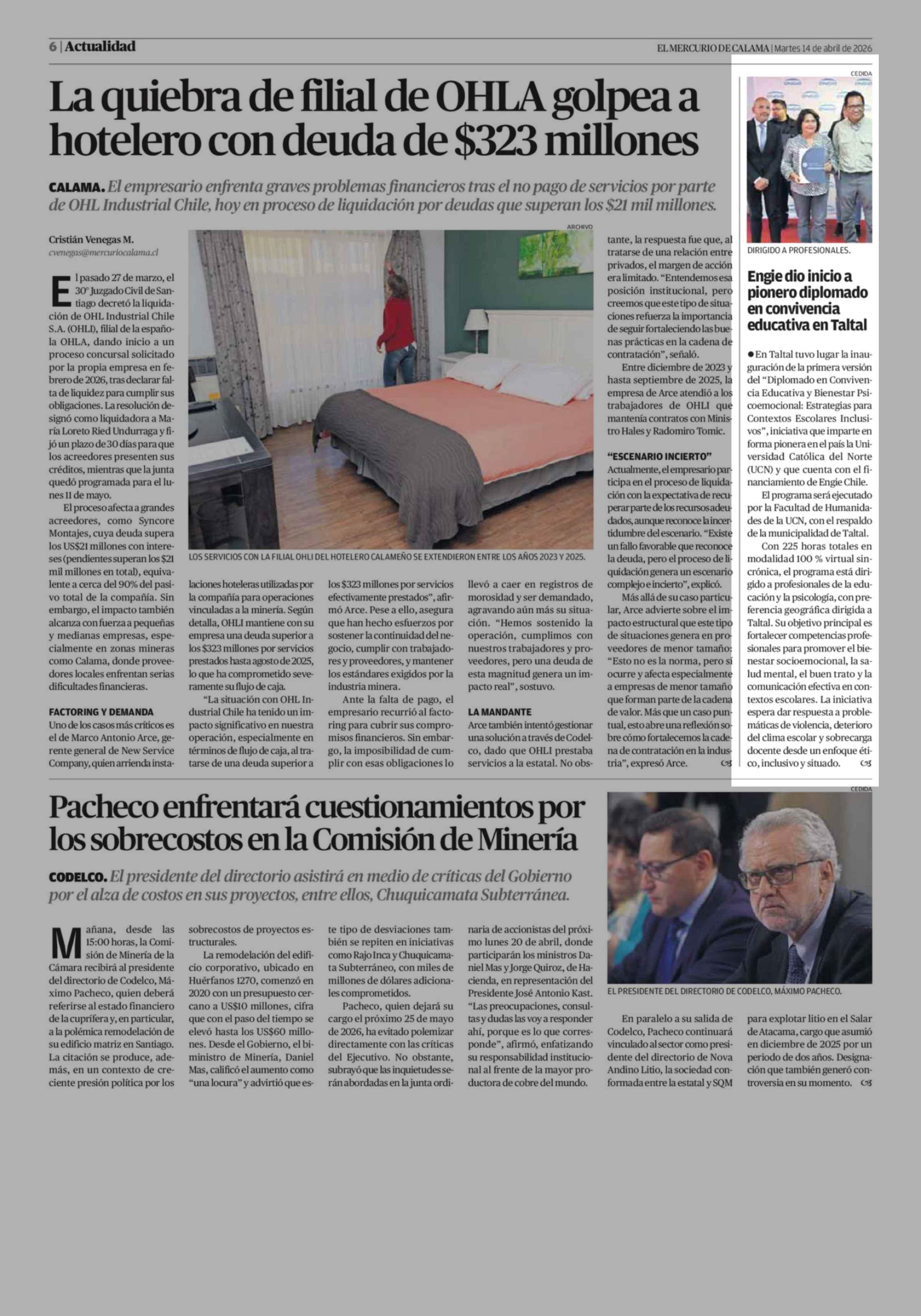 Engie dio inicio a pionero diplomado en convivencia educativa en Taltal 14-04-2026 El Mercurio de Calama |