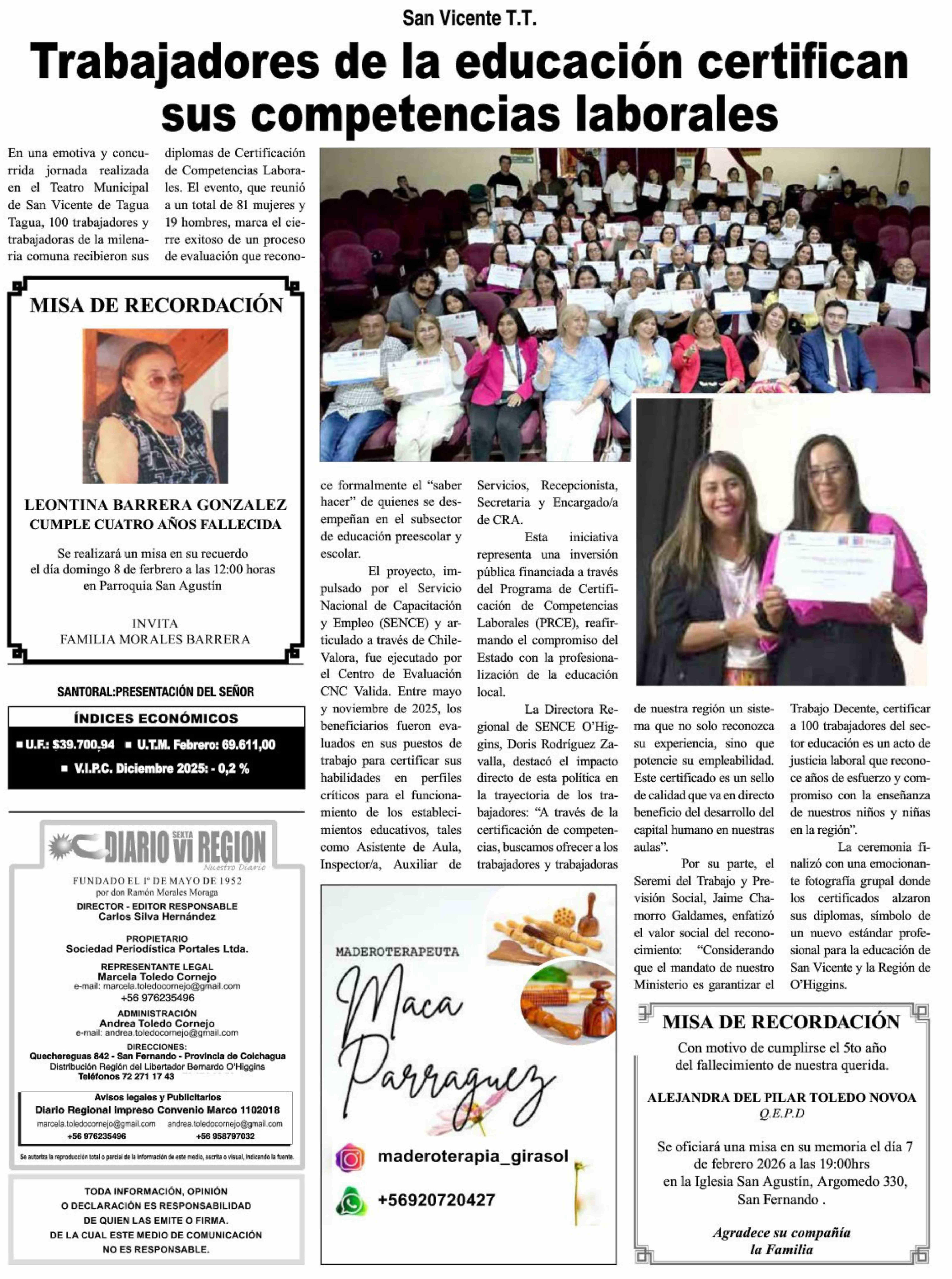 Trabajadores de la educación certifican sus competencias laborales 02-02-2026 Diario VI Región |