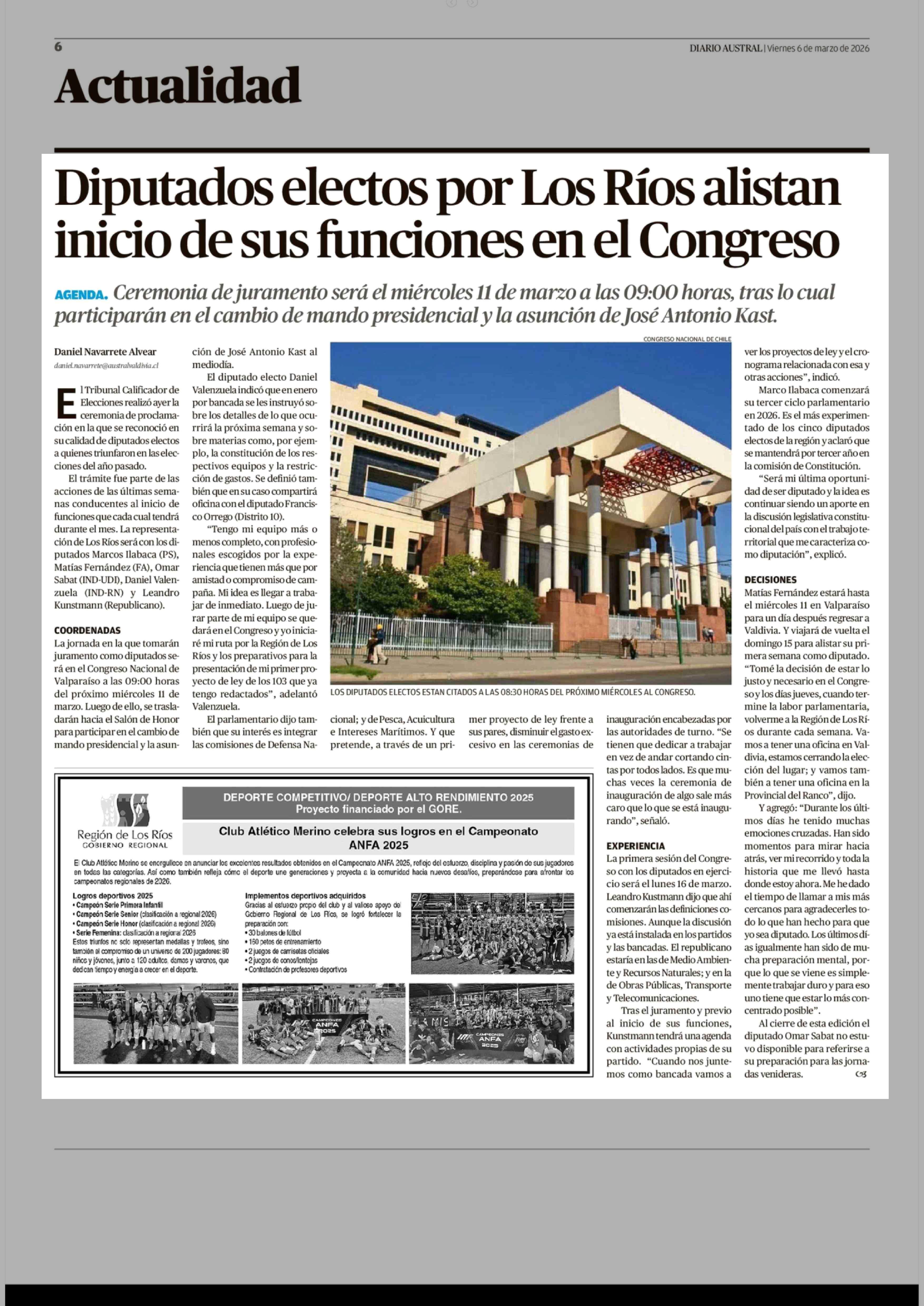 Diputados electos por Los Ríos alistan inicio de sus funciones en el Congreso 06-03-2026 Diario Austral Región de Los Ríos |