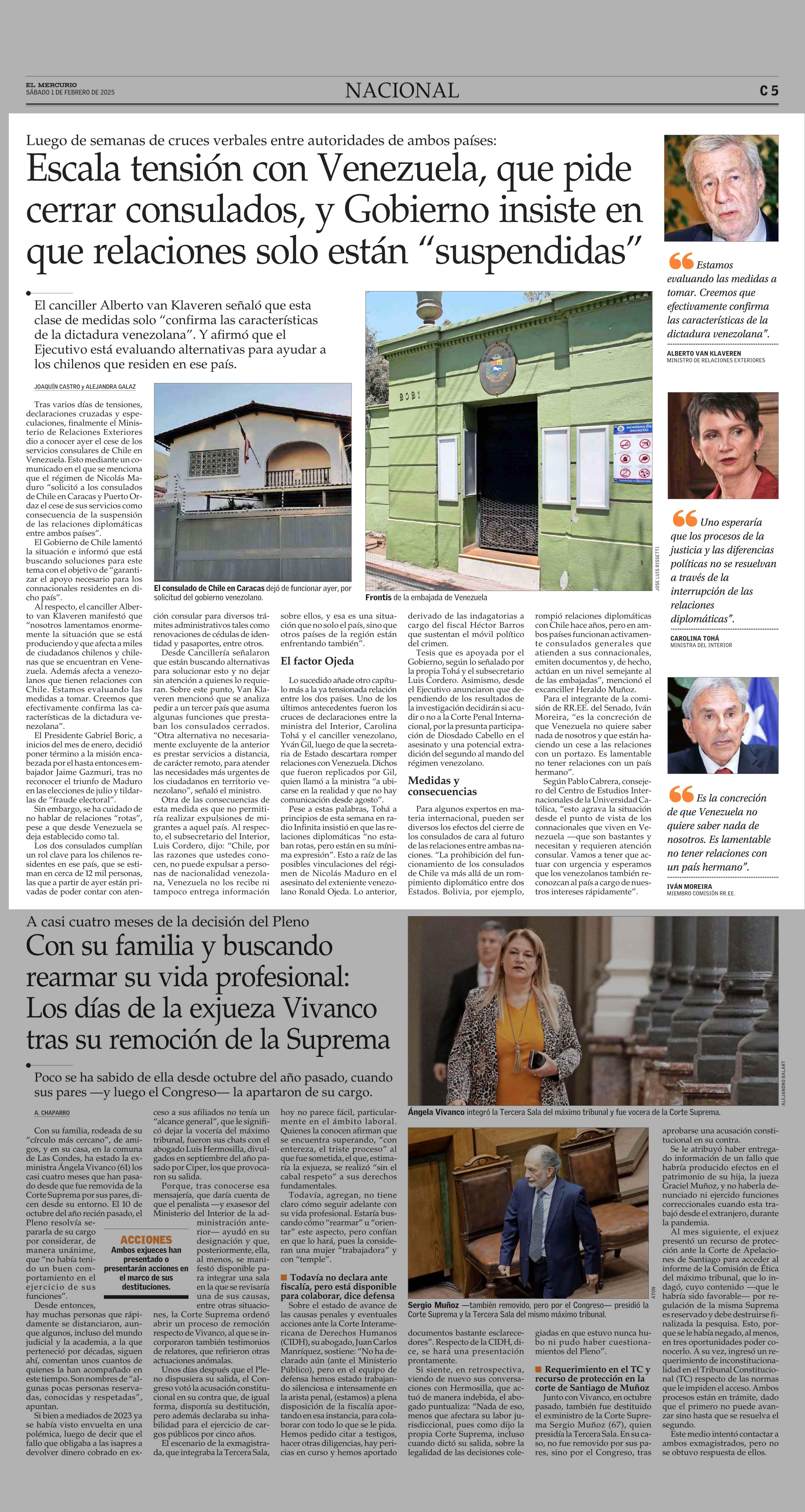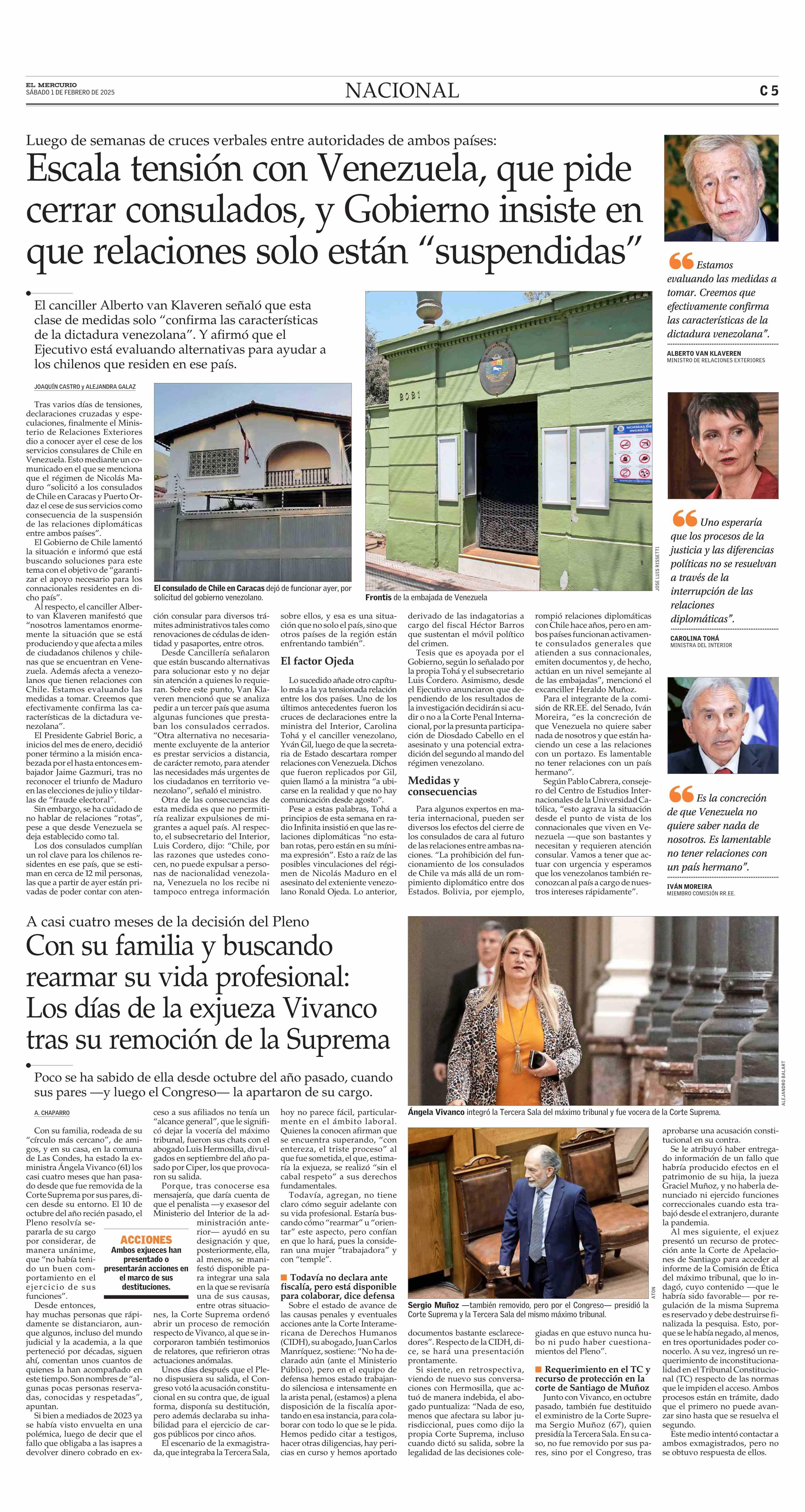Escala tensión con Venezuela, que pide cerrar consulados, y Gobierno insiste en que relaciones solo están "suspendidas" 01-02-2025 El Mercurio |