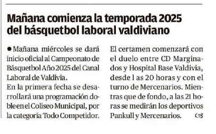 | Título: | Mañana comienza la temporada 2025 del básquetbol laboral valdiviano |
