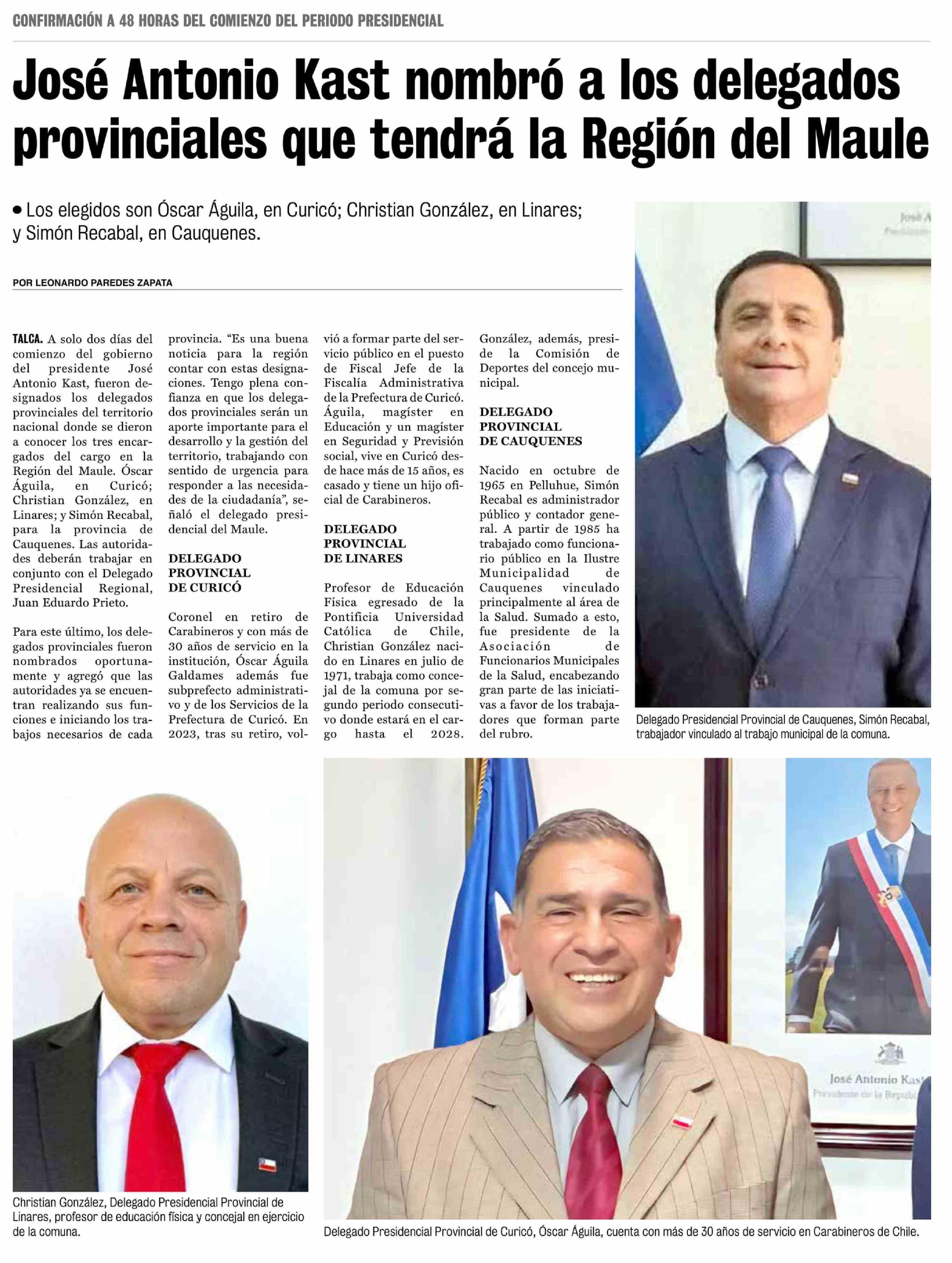 José Antonio Kast nombró a los delegados provinciales que tendrá la Región del Maule 15-03-2026 La Prensa de Curicó |
