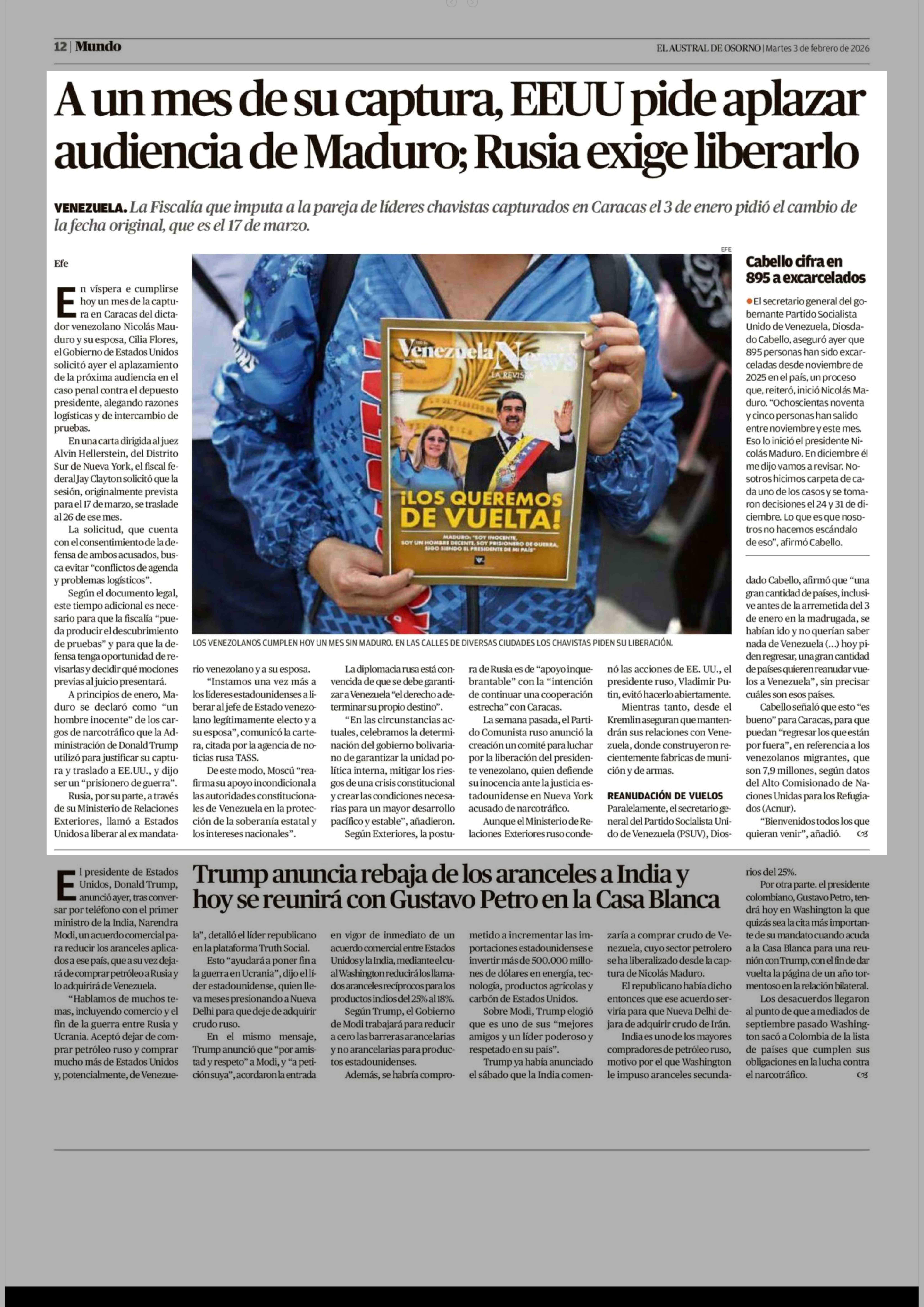 Título: A un mes de su captura, EEUU pide aplazar audiencia de Maduro; Rusia exige liberarlo
