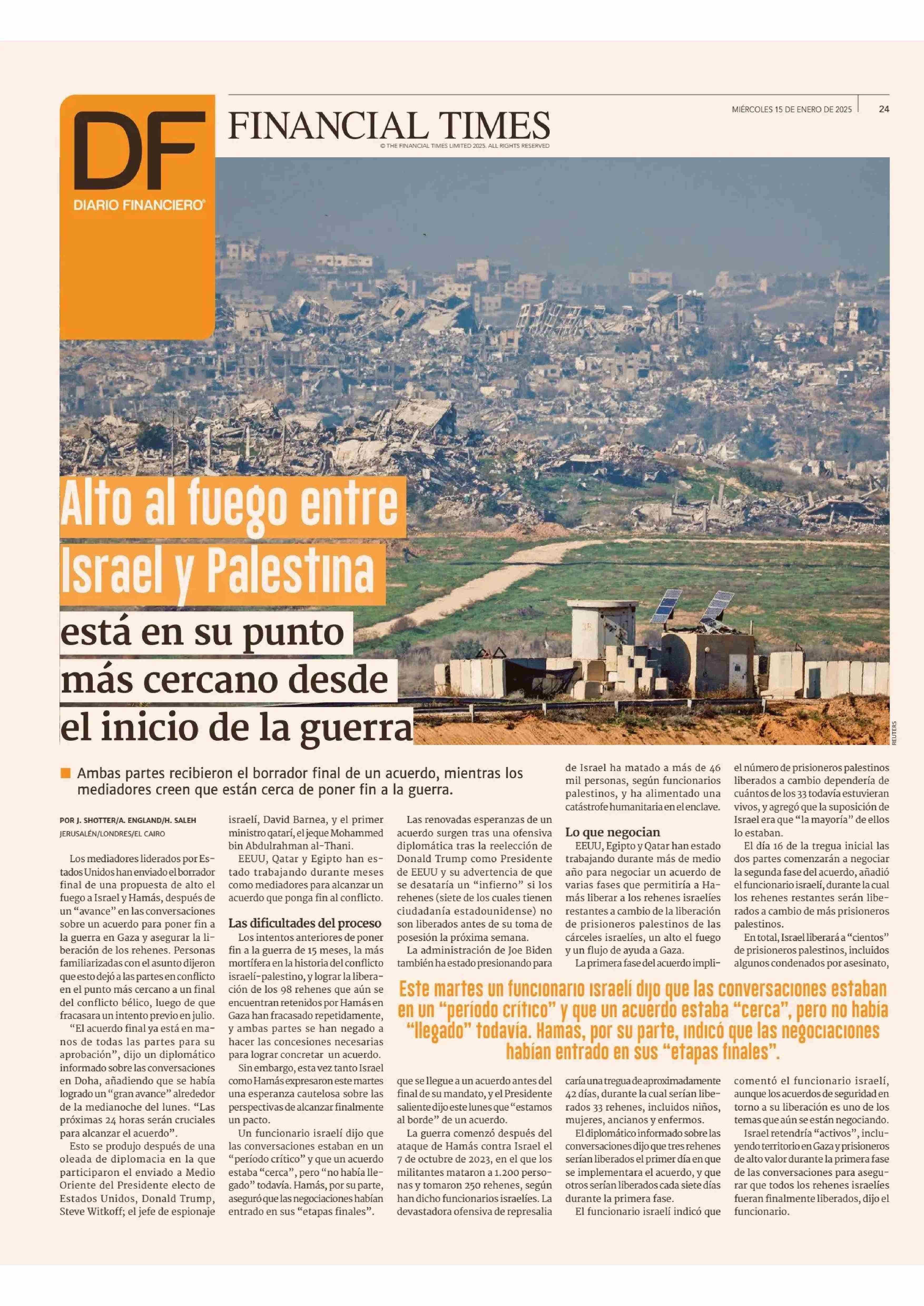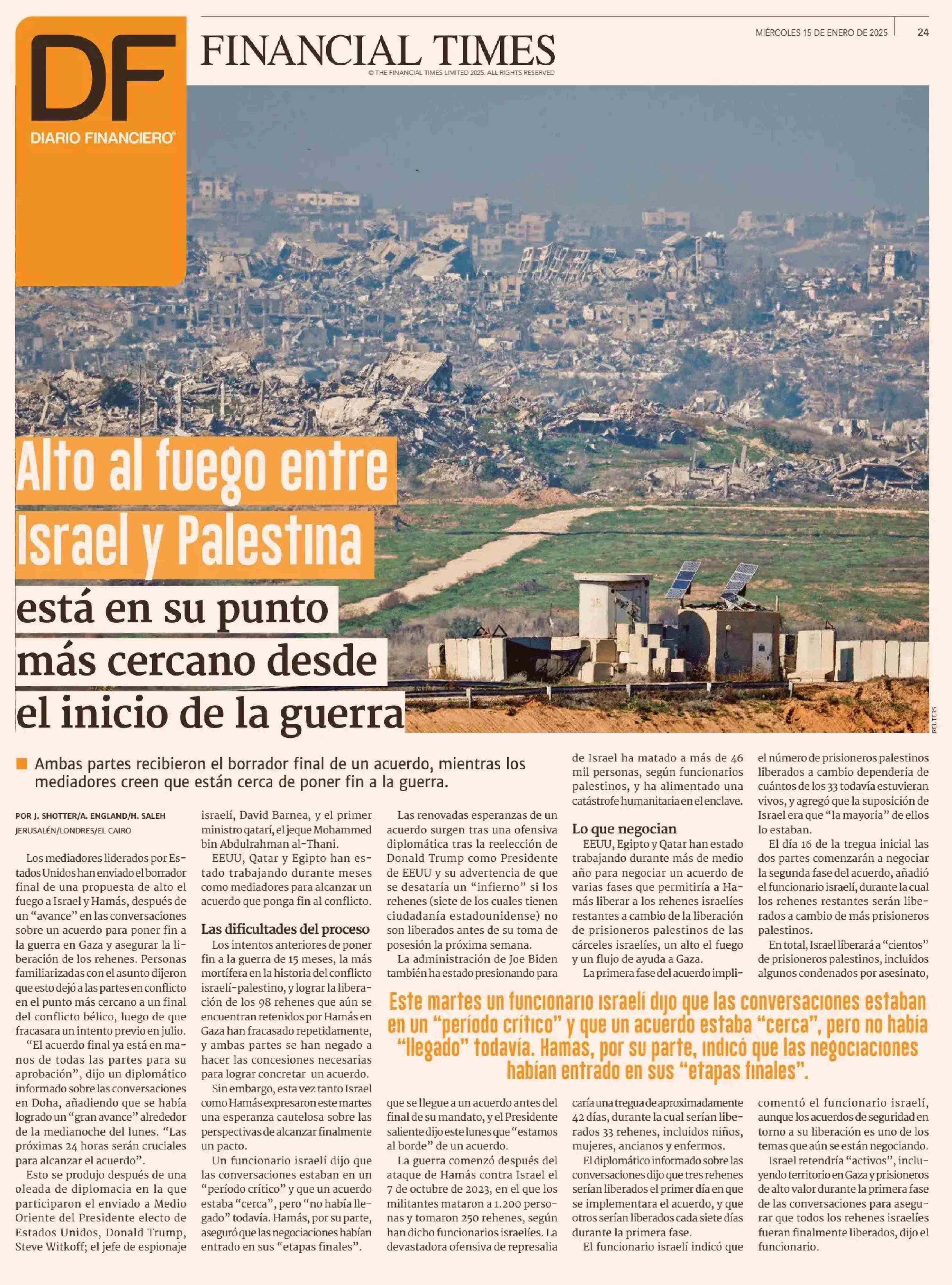 Alto al fuego entre Israel y Palestina está en su punto más cercano desde el inicio de la guerra 15-01-2025 Diario Financiero |