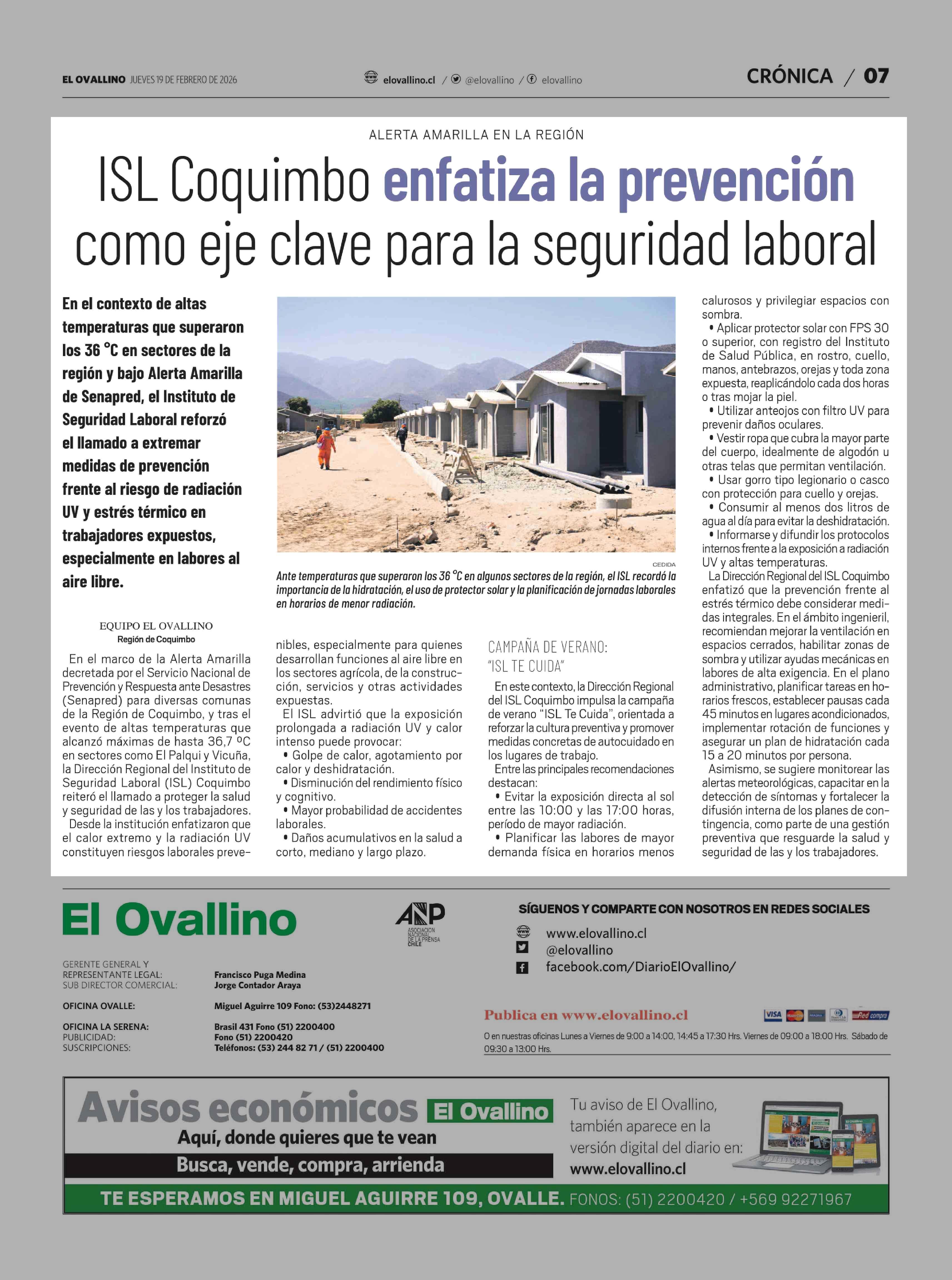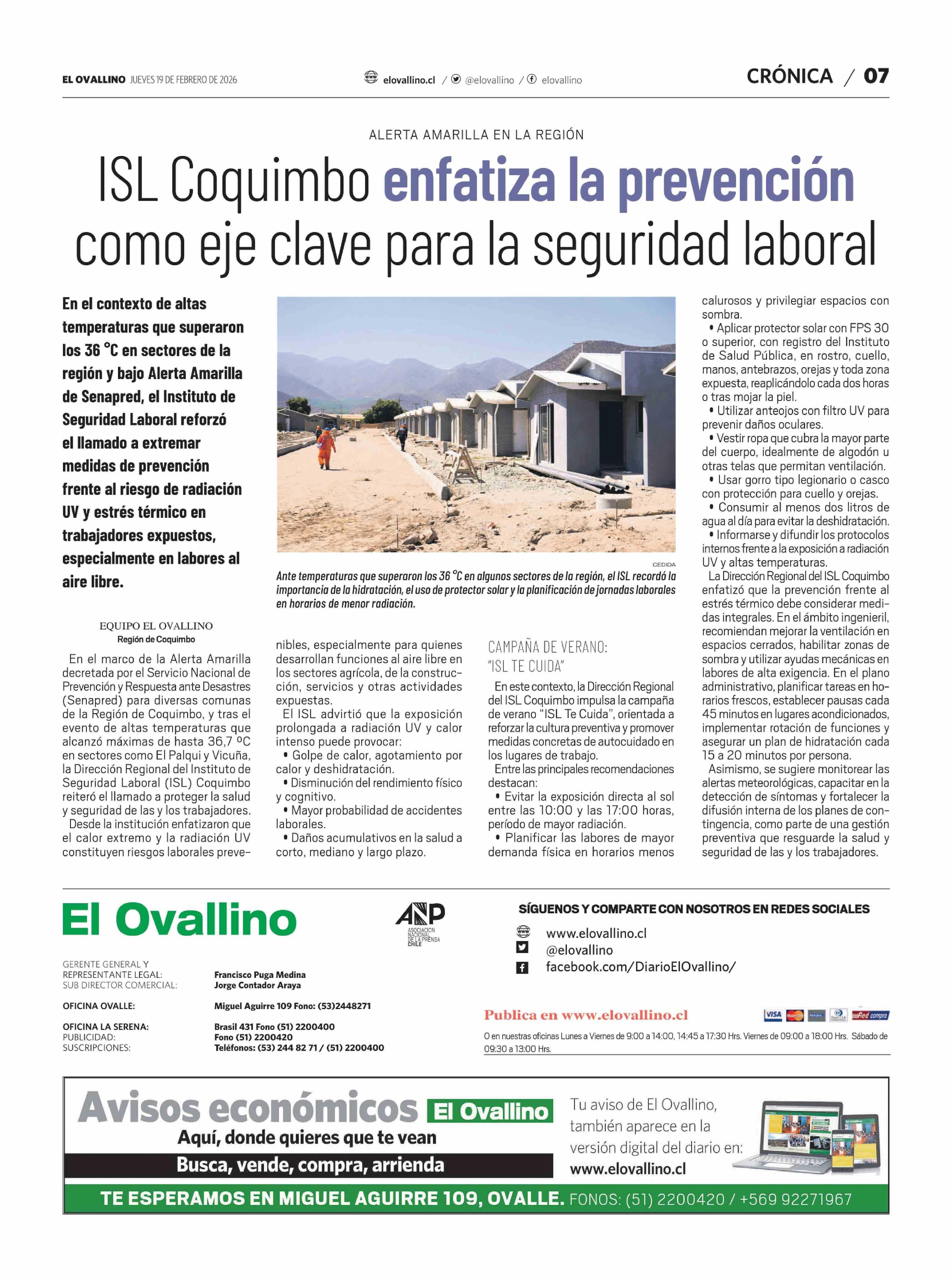 ISL Coquimbo enfatiza la prevención como eje clave para la seguridad laboral 19-02-2026 El Ovallino |