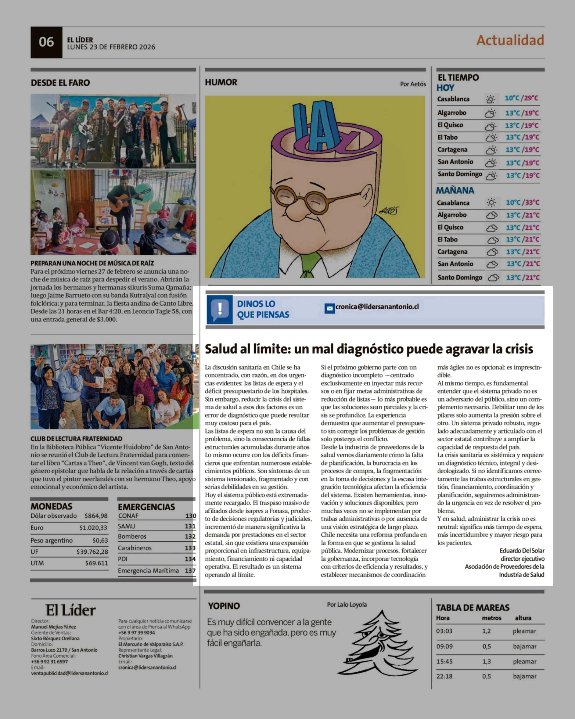 Cartas: Salud al límite: un mal diagnóstico puede agravar la crisis 23-02-2026 El Líder |