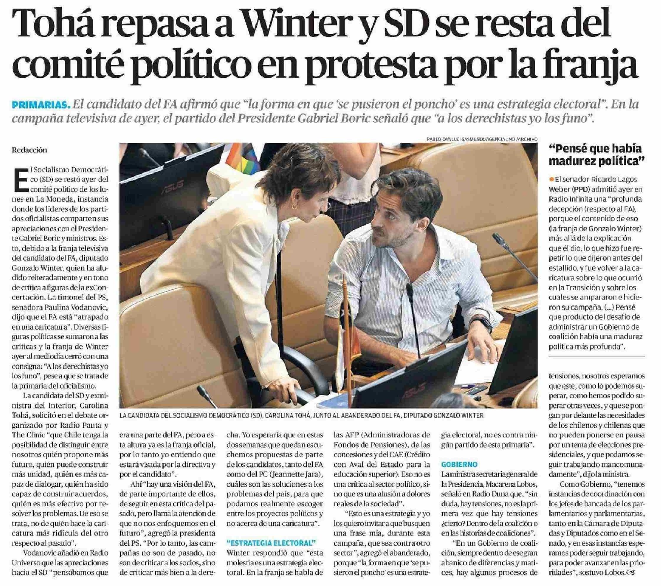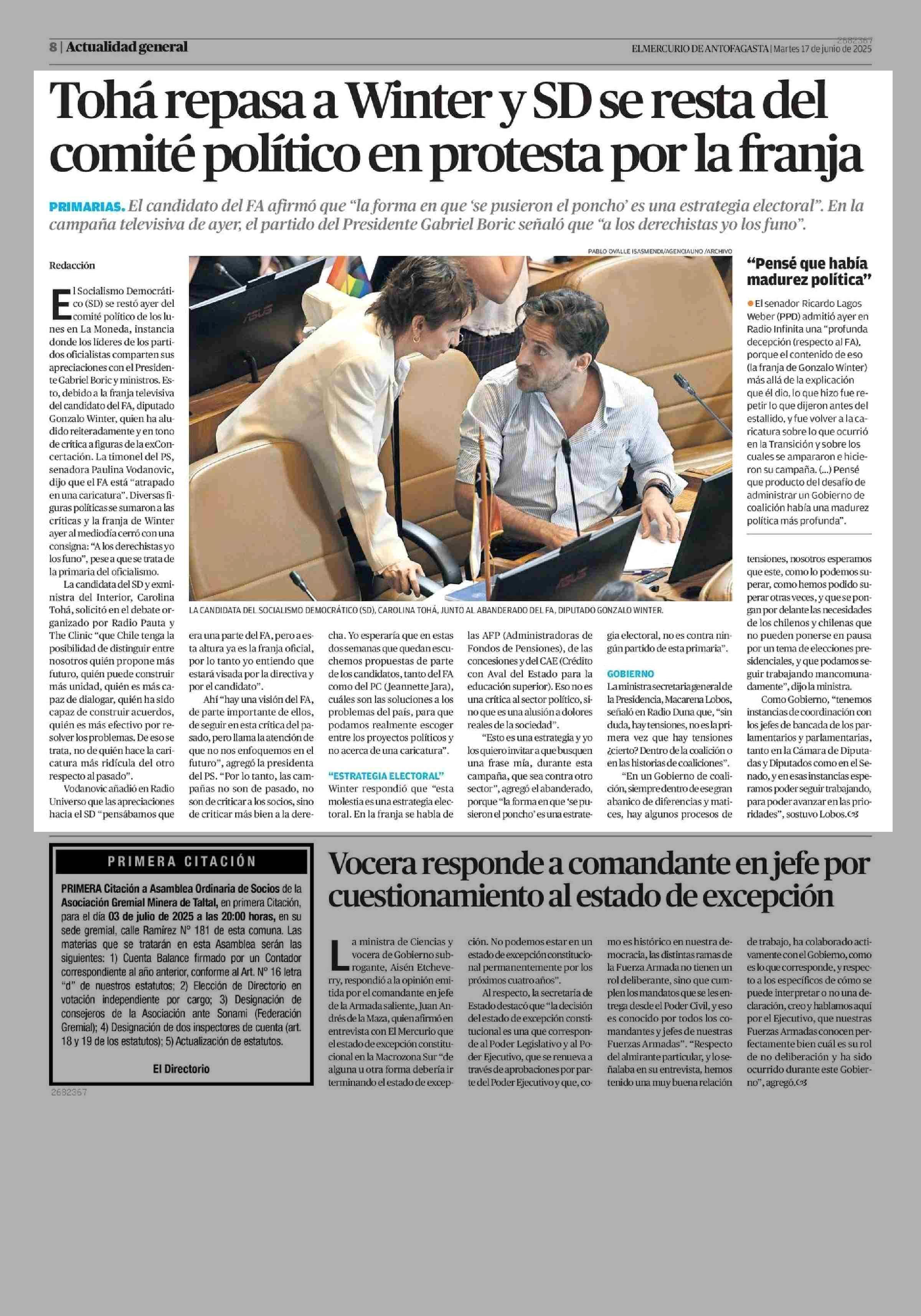 Tohá repasa a Winter y SD se resta del comité político en protesta por la franja 17-06-2025 El Mercurio de Antofagasta |